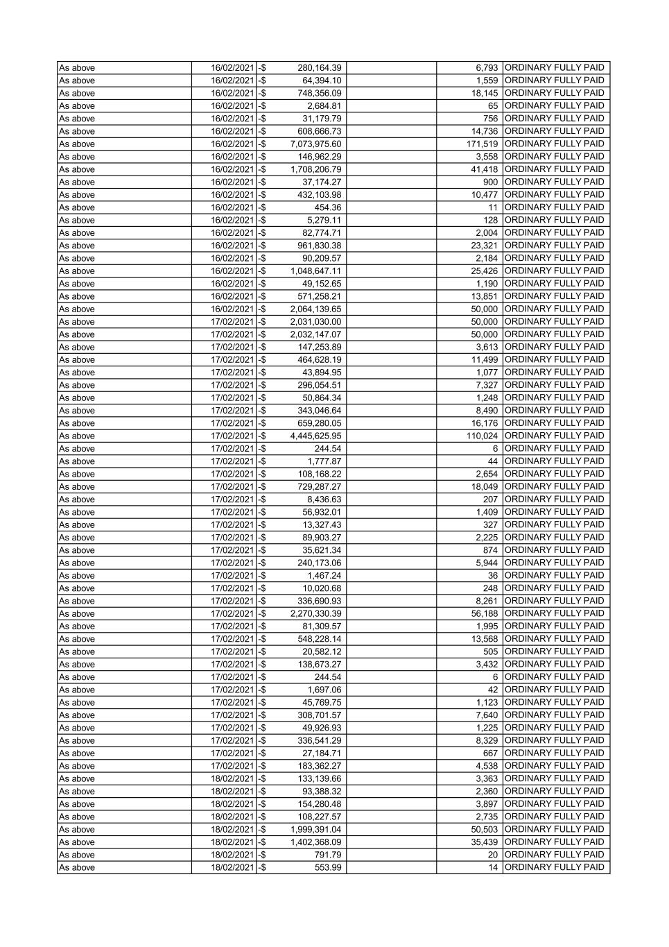 As above 16/02/2021 280,164.39-$ 6,793 ORDINARY FULLY PAID As above 16/02/2021 64,394.10-$ 1,559 ORDINARY FULLY PAID As above 16/02/2021 748,356.09-$ 18,145 ORDINARY FULLY PAID As above 16/02/2021 2,684.81-$ 65 ORDINARY FULLY PAID As above 16/02/2021 31,179.79-$ 756 ORDINARY FULLY PAID As above 16/02/2021 608,666.73-$ 14,736 ORDINARY FULLY PAID As above 16/02/2021 7,073,975.60-$ 171,519 ORDINARY FULLY PAID As above 16/02/2021 146,962.29-$ 3,558 ORDINARY FULLY PAID As above 16/02/2021 1,708,206.79-$ 41,418 ORDINARY FULLY PAID As above 16/02/2021 37,174.27-$ 900 ORDINARY FULLY PAID As above 16/02/2021 432,103.98-$ 10,477 ORDINARY FULLY PAID As above 16/02/2021 454.36-$ 11 ORDINARY FULLY PAID As above 16/02/2021 5,279.11-$ 128 ORDINARY FULLY PAID As above 16/02/2021 82,774.71-$ 2,004 ORDINARY FULLY PAID As above 16/02/2021 961,830.38-$ 23,321 ORDINARY FULLY PAID As above 16/02/2021 90,209.57-$ 2,184 ORDINARY FULLY PAID As above 16/02/2021 1,048,647.11-$ 25,426 ORDINARY FULLY PAID As above 16/02/2021 49,152.65-$ 1,190 ORDINARY FULLY PAID As above 16/02/2021 571,258.21-$ 13,851 ORDINARY FULLY PAID As above 16/02/2021 2,064,139.65-$ 50,000 ORDINARY FULLY PAID As above 17/02/2021 2,031,030.00-$ 50,000 ORDINARY FULLY PAID As above 17/02/2021 2,032,147.07-$ 50,000 ORDINARY FULLY PAID As above 17/02/2021 147,253.89-$ 3,613 ORDINARY FULLY PAID As above 17/02/2021 464,628.19-$ 11,499 ORDINARY FULLY PAID As above 17/02/2021 43,894.95-$ 1,077 ORDINARY FULLY PAID As above 17/02/2021 296,054.51-$ 7,327 ORDINARY FULLY PAID As above 17/02/2021 50,864.34-$ 1,248 ORDINARY FULLY PAID As above 17/02/2021 343,046.64-$ 8,490 ORDINARY FULLY PAID As above 17/02/2021 659,280.05-$ 16,176 ORDINARY FULLY PAID As above 17/02/2021 4,445,625.95-$ 110,024 ORDINARY FULLY PAID As above 17/02/2021 244.54-$ 6 ORDINARY FULLY PAID As above 17/02/2021 1,777.87-$ 44 ORDINARY FULLY PAID As above 17/02/2021 108,168.22-$ 2,654 ORDINARY FULLY PAID As above 17/02/2021 729,287.27-$ 18,049 ORDINARY FULLY PAID As above 17/02/2021 8,436.63-$ 207 ORDINARY FULLY PAID As above 17/02/2021 56,932.01-$ 1,409 ORDINARY FULLY PAID As above 17/02/2021 13,327.43-$ 327 ORDINARY FULLY PAID As above 17/02/2021 89,903.27-$ 2,225 ORDINARY FULLY PAID As above 17/02/2021 35,621.34-$ 874 ORDINARY FULLY PAID As above 17/02/2021 240,173.06-$ 5,944 ORDINARY FULLY PAID As above 17/02/2021 1,467.24-$ 36 ORDINARY FULLY PAID As above 17/02/2021 10,020.68-$ 248 ORDINARY FULLY PAID As above 17/02/2021 336,690.93-$ 8,261 ORDINARY FULLY PAID As above 17/02/2021 2,270,330.39-$ 56,188 ORDINARY FULLY PAID As above 17/02/2021 81,309.57-$ 1,995 ORDINARY FULLY PAID As above 17/02/2021 548,228.14-$ 13,568 ORDINARY FULLY PAID As above 17/02/2021 20,582.12-$ 505 ORDINARY FULLY PAID As above 17/02/2021 138,673.27-$ 3,432 ORDINARY FULLY PAID As above 17/02/2021 244.54-$ 6 ORDINARY FULLY PAID As above 17/02/2021 1,697.06-$ 42 ORDINARY FULLY PAID As above 17/02/2021 45,769.75-$ 1,123 ORDINARY FULLY PAID As above 17/02/2021 308,701.57-$ 7,640 ORDINARY FULLY PAID As above 17/02/2021 49,926.93-$ 1,225 ORDINARY FULLY PAID As above 17/02/2021 336,541.29-$ 8,329 ORDINARY FULLY PAID As above 17/02/2021 27,184.71-$ 667 ORDINARY FULLY PAID As above 17/02/2021 183,362.27-$ 4,538 ORDINARY FULLY PAID As above 18/02/2021 133,139.66-$ 3,363 ORDINARY FULLY PAID As above 18/02/2021 93,388.32-$ 2,360 ORDINARY FULLY PAID As above 18/02/2021 154,280.48-$ 3,897 ORDINARY FULLY PAID As above 18/02/2021 108,227.57-$ 2,735 ORDINARY FULLY PAID As above 18/02/2021 1,999,391.04-$ 50,503 ORDINARY FULLY PAID As above 18/02/2021 1,402,368.09-$ 35,439 ORDINARY FULLY PAID As above 18/02/2021 791.79-$ 20 ORDINARY FULLY PAID As above 18/02/2021 553.99-$ 14 ORDINARY FULLY PAID