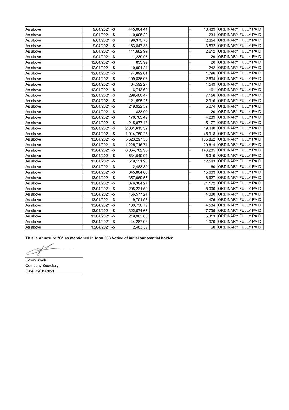 As above 9/04/2021 445,064.44-$ 10,409- ORDINARY FULLY PAID As above 9/04/2021 10,005.29-$ 234- ORDINARY FULLY PAID As above 9/04/2021 96,375.75-$ 2,254- ORDINARY FULLY PAID As above 9/04/2021 163,847.33-$ 3,832- ORDINARY FULLY PAID As above 9/04/2021 111,682.99-$ 2,612- ORDINARY FULLY PAID As above 9/04/2021 1,239.97-$ 29- ORDINARY FULLY PAID As above 12/04/2021 833.99-$ 20- ORDINARY FULLY PAID As above 12/04/2021 10,091.24-$ 242- ORDINARY FULLY PAID As above 12/04/2021 74,892.01-$ 1,796- ORDINARY FULLY PAID As above 12/04/2021 109,836.06-$ 2,634- ORDINARY FULLY PAID As above 12/04/2021 64,592.27-$ 1,549- ORDINARY FULLY PAID As above 12/04/2021 6,713.60-$ 161- ORDINARY FULLY PAID As above 12/04/2021 298,400.47-$ 7,156- ORDINARY FULLY PAID As above 12/04/2021 121,595.27-$ 2,916- ORDINARY FULLY PAID As above 12/04/2021 219,922.32-$ 5,274- ORDINARY FULLY PAID As above 12/04/2021 833.99-$ 20- ORDINARY FULLY PAID As above 12/04/2021 176,763.49-$ 4,239- ORDINARY FULLY PAID As above 12/04/2021 215,877.48-$ 5,177- ORDINARY FULLY PAID As above 12/04/2021 2,061,615.32-$ 49,440- ORDINARY FULLY PAID As above 12/04/2021 1,914,750.25-$ 45,918- ORDINARY FULLY PAID As above 13/04/2021 5,623,297.35-$ 135,862- ORDINARY FULLY PAID As above 13/04/2021 1,225,716.74-$ 29,614- ORDINARY FULLY PAID As above 13/04/2021 6,054,702.95-$ 146,285- ORDINARY FULLY PAID As above 13/04/2021 634,049.94-$ 15,319- ORDINARY FULLY PAID As above 13/04/2021 519,151.93-$ 12,543- ORDINARY FULLY PAID As above 13/04/2021 2,483.39-$ 60- ORDINARY FULLY PAID As above 13/04/2021 645,804.63-$ 15,603- ORDINARY FULLY PAID As above 13/04/2021 357,069.57-$ 8,627- ORDINARY FULLY PAID As above 13/04/2021 876,304.27-$ 21,172- ORDINARY FULLY PAID As above 13/04/2021 208,221.50-$ 5,000 ORDINARY FULLY PAID As above 13/04/2021 166,577.24-$ 4,000 ORDINARY FULLY PAID As above 13/04/2021 19,701.53-$ 476- ORDINARY FULLY PAID As above 13/04/2021 189,730.72-$ 4,584- ORDINARY FULLY PAID As above 13/04/2021 322,674.67-$ 7,796- ORDINARY FULLY PAID As above 13/04/2021 219,903.86-$ 5,313- ORDINARY FULLY PAID As above 13/04/2021 44,287.06-$ 1,070- ORDINARY FULLY PAID As above 13/04/2021 2,483.39-$ 60- ORDINARY FULLY PAID This is Annexure "C" as mentioned in form 603 Notice of initial substantial holder Calvin Kwok Company Secretary Date: 19/04/2021