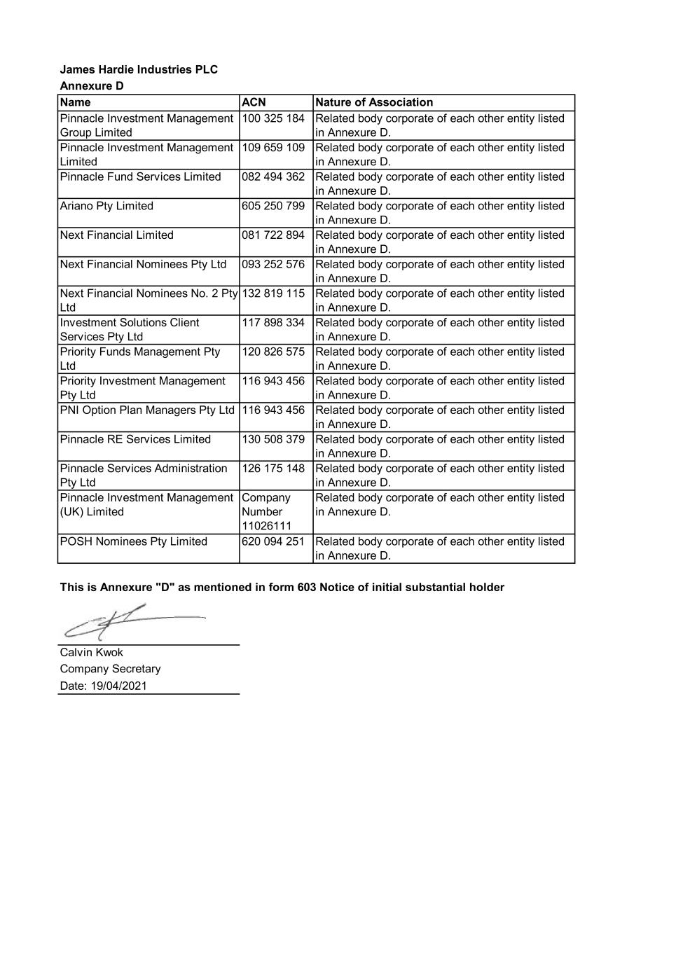 James Hardie Industries PLC Annexure D Name ACN Nature of Association Pinnacle Investment Management Group Limited 100 325 184 Related body corporate of each other entity listed in Annexure D. Pinnacle Investment Management Limited 109 659 109 Related body corporate of each other entity listed in Annexure D. Pinnacle Fund Services Limited 082 494 362 Related body corporate of each other entity listed in Annexure D. Ariano Pty Limited 605 250 799 Related body corporate of each other entity listed in Annexure D. Next Financial Limited 081 722 894 Related body corporate of each other entity listed in Annexure D. Next Financial Nominees Pty Ltd 093 252 576 Related body corporate of each other entity listed in Annexure D. Next Financial Nominees No. 2 Pty Ltd 132 819 115 Related body corporate of each other entity listed in Annexure D. Investment Solutions Client Services Pty Ltd 117 898 334 Related body corporate of each other entity listed in Annexure D. Priority Funds Management Pty Ltd 120 826 575 Related body corporate of each other entity listed in Annexure D. Priority Investment Management Pty Ltd 116 943 456 Related body corporate of each other entity listed in Annexure D. PNI Option Plan Managers Pty Ltd 116 943 456 Related body corporate of each other entity listed in Annexure D. Pinnacle RE Services Limited 130 508 379 Related body corporate of each other entity listed in Annexure D. Pinnacle Services Administration Pty Ltd 126 175 148 Related body corporate of each other entity listed in Annexure D. Pinnacle Investment Management (UK) Limited Company Number 11026111 Related body corporate of each other entity listed in Annexure D. POSH Nominees Pty Limited 620 094 251 Related body corporate of each other entity listed in Annexure D. This is Annexure "D" as mentioned in form 603 Notice of initial substantial holder Calvin Kwok Company Secretary Date: 19/04/2021