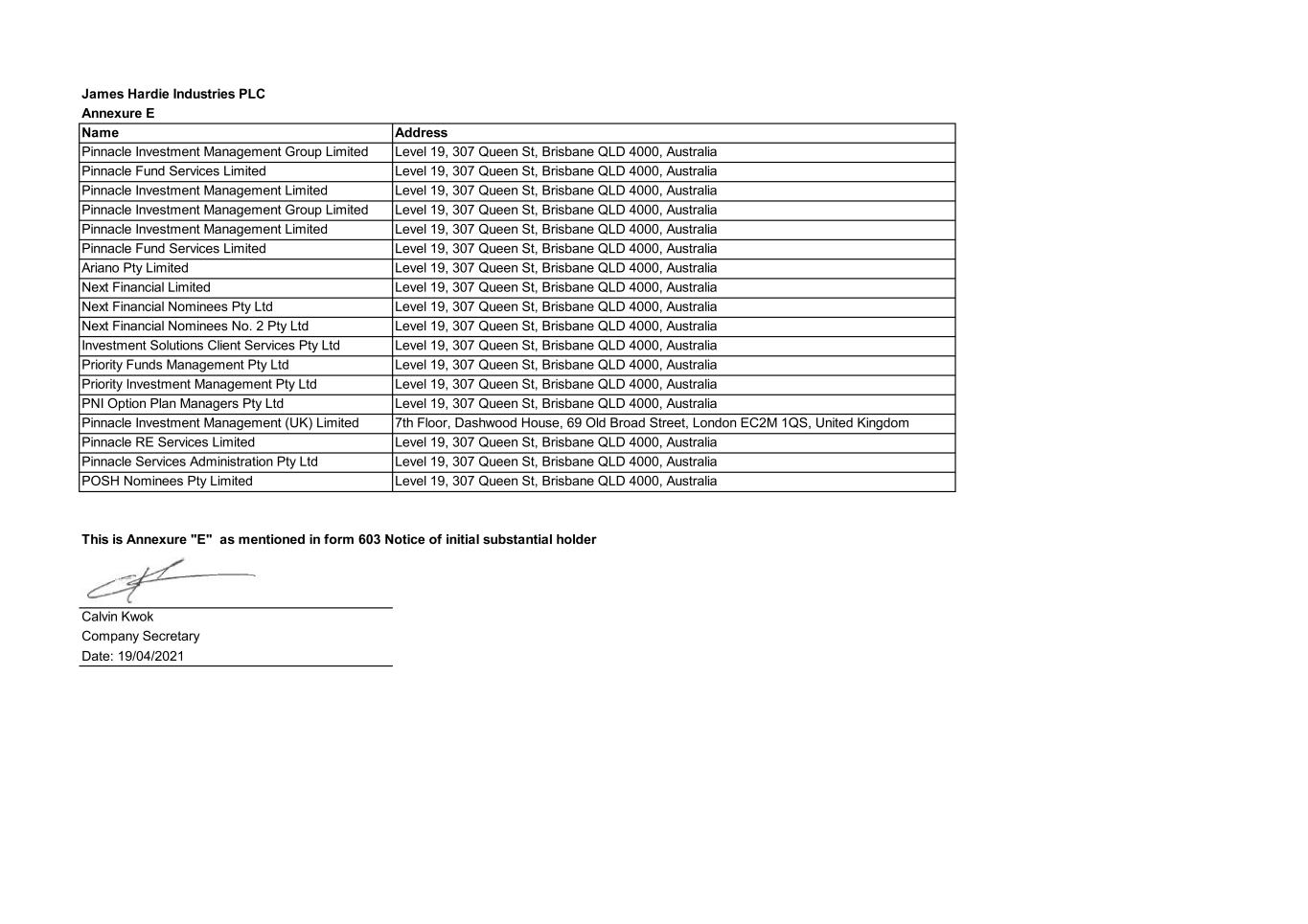 James Hardie Industries PLC Annexure E Name Address Pinnacle Investment Management Group Limited Level 19, 307 Queen St, Brisbane QLD 4000, Australia Pinnacle Fund Services Limited Level 19, 307 Queen St, Brisbane QLD 4000, Australia Pinnacle Investment Management Limited Level 19, 307 Queen St, Brisbane QLD 4000, Australia Pinnacle Investment Management Group Limited Level 19, 307 Queen St, Brisbane QLD 4000, Australia Pinnacle Investment Management Limited Level 19, 307 Queen St, Brisbane QLD 4000, Australia Pinnacle Fund Services Limited Level 19, 307 Queen St, Brisbane QLD 4000, Australia Ariano Pty Limited Level 19, 307 Queen St, Brisbane QLD 4000, Australia Next Financial Limited Level 19, 307 Queen St, Brisbane QLD 4000, Australia Next Financial Nominees Pty Ltd Level 19, 307 Queen St, Brisbane QLD 4000, Australia Next Financial Nominees No. 2 Pty Ltd Level 19, 307 Queen St, Brisbane QLD 4000, Australia Investment Solutions Client Services Pty Ltd Level 19, 307 Queen St, Brisbane QLD 4000, Australia Priority Funds Management Pty Ltd Level 19, 307 Queen St, Brisbane QLD 4000, Australia Priority Investment Management Pty Ltd Level 19, 307 Queen St, Brisbane QLD 4000, Australia PNI Option Plan Managers Pty Ltd Level 19, 307 Queen St, Brisbane QLD 4000, Australia Pinnacle Investment Management (UK) Limited 7th Floor, Dashwood House, 69 Old Broad Street, London EC2M 1QS, United Kingdom Pinnacle RE Services Limited Level 19, 307 Queen St, Brisbane QLD 4000, Australia Pinnacle Services Administration Pty Ltd Level 19, 307 Queen St, Brisbane QLD 4000, Australia POSH Nominees Pty Limited Level 19, 307 Queen St, Brisbane QLD 4000, Australia This is Annexure "E" as mentioned in form 603 Notice of initial substantial holder Calvin Kwok Company Secretary Date: 19/04/2021