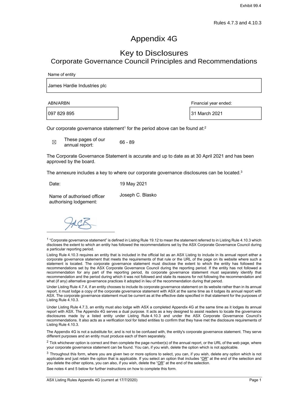 Rules 4.7.3 and 4.10.3 ASX Listing Rules Appendix 4G (current at 17/7/2020) Page 1 Appendix 4G Key to Disclosures Corporate Governance Council Principles and Recommendations Name of entity James Hardie Industries plc ABN/ARBN Financial year ended: 097 829 895 31 March 2021 Our corporate governance statement1 for the period above can be found at:2 ☒ These pages of our annual report: 66 - 89 The Corporate Governance Statement is accurate and up to date as at 30 April 2021 and has been approved by the board. The annexure includes a key to where our corporate governance disclosures can be located.3 Date: 19 May 2021 Name of authorised officer authorising lodgement: Joseph C. Blasko 1 “Corporate governance statement” is defined in Listing Rule 19.12 to mean the statement referred to in Listing Rule 4.10.3 which discloses the extent to which an entity has followed the recommendations set by the ASX Corporate Governance Council during a particular reporting period. Listing Rule 4.10.3 requires an entity that is included in the official list as an ASX Listing to include in its annual report either a corporate governance statement that meets the requirements of that rule or the URL of the page on its website where such a statement is located. The corporate governance statement must disclose the extent to which the entity has followed the recommendations set by the ASX Corporate Governance Council during the reporting period. If the entity has not followed a recommendation for any part of the reporting period, its corporate governance statement must separately identify that recommendation and the period during which it was not followed and state its reasons for not following the recommendation and what (if any) alternative governance practices it adopted in lieu of the recommendation during that period. Under Listing Rule 4.7.4, if an entity chooses to include its corporate governance statement on its website rather than in its annual report, it must lodge a copy of the corporate governance statement with ASX at the same time as it lodges its annual report with ASX. The corporate governance statement must be current as at the effective date specified in that statement for the purposes of Listing Rule 4.10.3. Under Listing Rule 4.7.3, an entity must also lodge with ASX a completed Appendix 4G at the same time as it lodges its annual report with ASX. The Appendix 4G serves a dual purpose. It acts as a key designed to assist readers to locate the governance disclosures made by a listed entity under Listing Rule 4.10.3 and under the ASX Corporate Governance Council’s recommendations. It also acts as a verification tool for listed entities to confirm that they have met the disclosure requirements of Listing Rule 4.10.3. The Appendix 4G is not a substitute for, and is not to be confused with, the entity's corporate governance statement. They serve different purposes and an entity must produce each of them separately. 2 Tick whichever option is correct and then complete the page number(s) of the annual report, or the URL of the web page, where your corporate governance statement can be found. You can, if you wish, delete the option which is not applicable. 3 Throughout this form, where you are given two or more options to select, you can, if you wish, delete any option which is not applicable and just retain the option that is applicable. If you select an option that includes “OR” at the end of the selection and you delete the other options, you can also, if you wish, delete the “OR” at the end of the selection. See notes 4 and 5 below for further instructions on how to complete this form. Exhibit 99.4