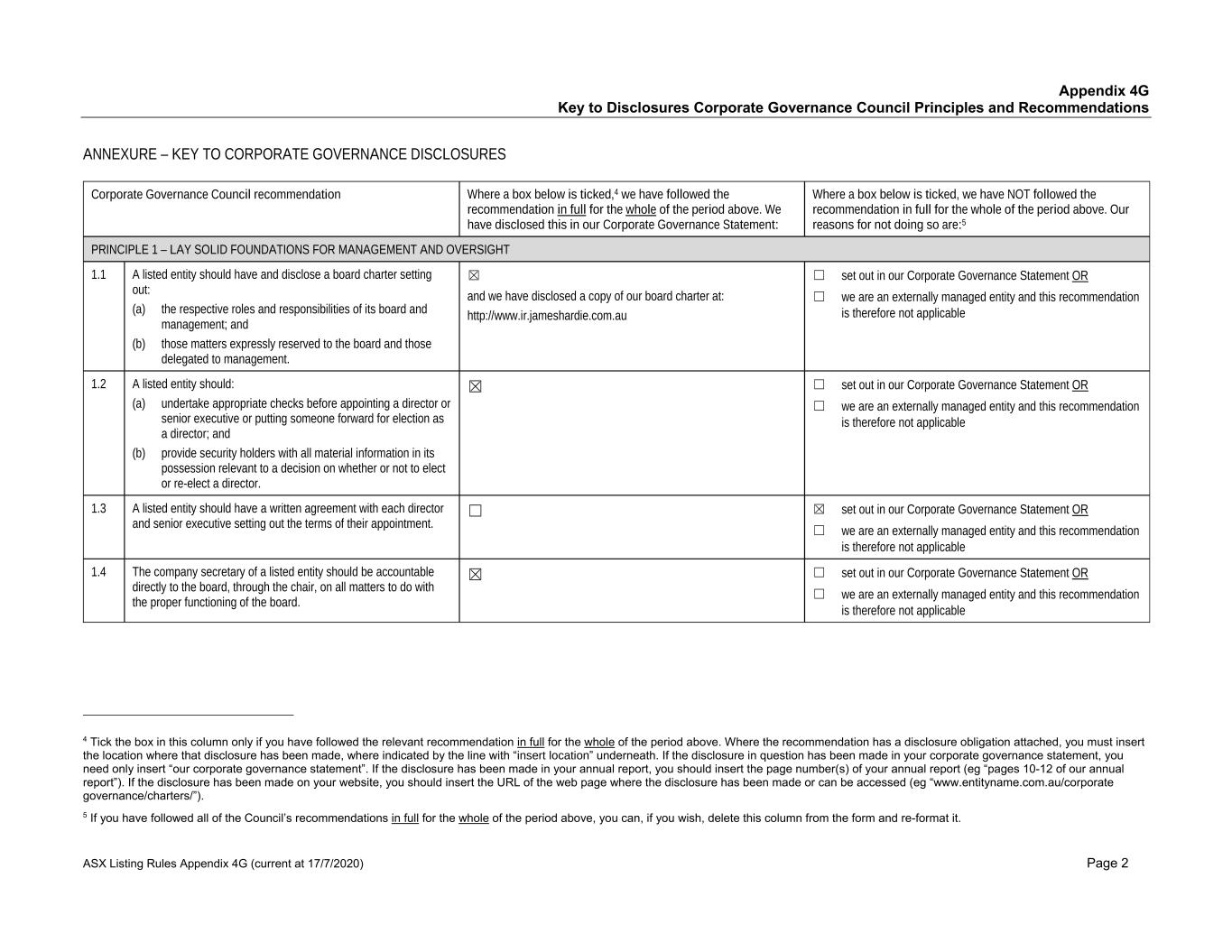 Appendix 4G Key to Disclosures Corporate Governance Council Principles and Recommendations ASX Listing Rules Appendix 4G (current at 17/7/2020) Page 2 ANNEXURE – KEY TO CORPORATE GOVERNANCE DISCLOSURES Corporate Governance Council recommendation Where a box below is ticked,4 we have followed the recommendation in full for the whole of the period above. We have disclosed this in our Corporate Governance Statement: Where a box below is ticked, we have NOT followed the recommendation in full for the whole of the period above. Our reasons for not doing so are:5 PRINCIPLE 1 – LAY SOLID FOUNDATIONS FOR MANAGEMENT AND OVERSIGHT 1.1 A listed entity should have and disclose a board charter setting out: (a) the respective roles and responsibilities of its board and management; and (b) those matters expressly reserved to the board and those delegated to management. ☒ and we have disclosed a copy of our board charter at: http://www.ir.jameshardie.com.au ☐ set out in our Corporate Governance Statement OR ☐ we are an externally managed entity and this recommendation is therefore not applicable 1.2 A listed entity should: (a) undertake appropriate checks before appointing a director or senior executive or putting someone forward for election as a director; and (b) provide security holders with all material information in its possession relevant to a decision on whether or not to elect or re-elect a director. ☒ ☐ set out in our Corporate Governance Statement OR ☐ we are an externally managed entity and this recommendation is therefore not applicable 1.3 A listed entity should have a written agreement with each director and senior executive setting out the terms of their appointment. ☐ ☒ set out in our Corporate Governance Statement OR ☐ we are an externally managed entity and this recommendation is therefore not applicable 1.4 The company secretary of a listed entity should be accountable directly to the board, through the chair, on all matters to do with the proper functioning of the board. ☒ ☐ set out in our Corporate Governance Statement OR ☐ we are an externally managed entity and this recommendation is therefore not applicable 4 Tick the box in this column only if you have followed the relevant recommendation in full for the whole of the period above. Where the recommendation has a disclosure obligation attached, you must insert the location where that disclosure has been made, where indicated by the line with “insert location” underneath. If the disclosure in question has been made in your corporate governance statement, you need only insert “our corporate governance statement”. If the disclosure has been made in your annual report, you should insert the page number(s) of your annual report (eg “pages 10-12 of our annual report”). If the disclosure has been made on your website, you should insert the URL of the web page where the disclosure has been made or can be accessed (eg “www.entityname.com.au/corporate governance/charters/”). 5 If you have followed all of the Council’s recommendations in full for the whole of the period above, you can, if you wish, delete this column from the form and re-format it.