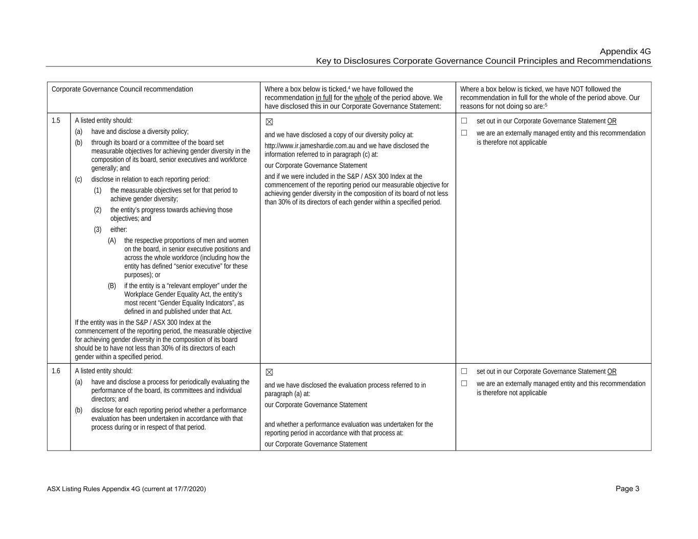 Appendix 4G Key to Disclosures Corporate Governance Council Principles and Recommendations ASX Listing Rules Appendix 4G (current at 17/7/2020) Page 3 Corporate Governance Council recommendation Where a box below is ticked,4 we have followed the recommendation in full for the whole of the period above. We have disclosed this in our Corporate Governance Statement: Where a box below is ticked, we have NOT followed the recommendation in full for the whole of the period above. Our reasons for not doing so are:5 1.5 A listed entity should: (a) have and disclose a diversity policy; (b) through its board or a committee of the board set measurable objectives for achieving gender diversity in the composition of its board, senior executives and workforce generally; and (c) disclose in relation to each reporting period: (1) the measurable objectives set for that period to achieve gender diversity; (2) the entity’s progress towards achieving those objectives; and (3) either: (A) the respective proportions of men and women on the board, in senior executive positions and across the whole workforce (including how the entity has defined “senior executive” for these purposes); or (B) if the entity is a “relevant employer” under the Workplace Gender Equality Act, the entity’s most recent “Gender Equality Indicators”, as defined in and published under that Act. If the entity was in the S&P / ASX 300 Index at the commencement of the reporting period, the measurable objective for achieving gender diversity in the composition of its board should be to have not less than 30% of its directors of each gender within a specified period. ☒ and we have disclosed a copy of our diversity policy at: http://www.ir.jameshardie.com.au and we have disclosed the information referred to in paragraph (c) at: our Corporate Governance Statement and if we were included in the S&P / ASX 300 Index at the commencement of the reporting period our measurable objective for achieving gender diversity in the composition of its board of not less than 30% of its directors of each gender within a specified period. ☐ set out in our Corporate Governance Statement OR ☐ we are an externally managed entity and this recommendation is therefore not applicable 1.6 A listed entity should: (a) have and disclose a process for periodically evaluating the performance of the board, its committees and individual directors; and (b) disclose for each reporting period whether a performance evaluation has been undertaken in accordance with that process during or in respect of that period. ☒ and we have disclosed the evaluation process referred to in paragraph (a) at: our Corporate Governance Statement and whether a performance evaluation was undertaken for the reporting period in accordance with that process at: our Corporate Governance Statement ☐ set out in our Corporate Governance Statement OR ☐ we are an externally managed entity and this recommendation is therefore not applicable