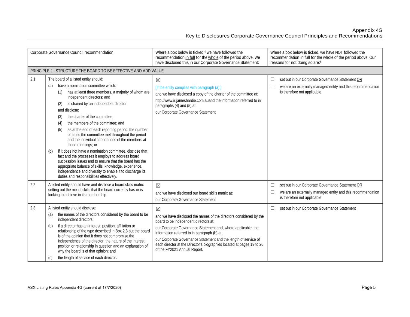 Appendix 4G Key to Disclosures Corporate Governance Council Principles and Recommendations ASX Listing Rules Appendix 4G (current at 17/7/2020) Page 5 Corporate Governance Council recommendation Where a box below is ticked,4 we have followed the recommendation in full for the whole of the period above. We have disclosed this in our Corporate Governance Statement: Where a box below is ticked, we have NOT followed the recommendation in full for the whole of the period above. Our reasons for not doing so are:5 PRINCIPLE 2 - STRUCTURE THE BOARD TO BE EFFECTIVE AND ADD VALUE 2.1 The board of a listed entity should: (a) have a nomination committee which: (1) has at least three members, a majority of whom are independent directors; and (2) is chaired by an independent director, and disclose: (3) the charter of the committee; (4) the members of the committee; and (5) as at the end of each reporting period, the number of times the committee met throughout the period and the individual attendances of the members at those meetings; or (b) if it does not have a nomination committee, disclose that fact and the processes it employs to address board succession issues and to ensure that the board has the appropriate balance of skills, knowledge, experience, independence and diversity to enable it to discharge its duties and responsibilities effectively. ☒ [If the entity complies with paragraph (a):] and we have disclosed a copy of the charter of the committee at: http://www.ir.jameshardie.com.auand the information referred to in paragraphs (4) and (5) at: our Corporate Governance Statement ☐ set out in our Corporate Governance Statement OR ☐ we are an externally managed entity and this recommendation is therefore not applicable 2.2 A listed entity should have and disclose a board skills matrix setting out the mix of skills that the board currently has or is looking to achieve in its membership. ☒ and we have disclosed our board skills matrix at: our Corporate Governance Statement ☐ set out in our Corporate Governance Statement OR ☐ we are an externally managed entity and this recommendation is therefore not applicable 2.3 A listed entity should disclose: (a) the names of the directors considered by the board to be independent directors; (b) if a director has an interest, position, affiliation or relationship of the type described in Box 2.3 but the board is of the opinion that it does not compromise the independence of the director, the nature of the interest, position or relationship in question and an explanation of why the board is of that opinion; and (c) the length of service of each director. ☒ and we have disclosed the names of the directors considered by the board to be independent directors at: our Corporate Governance Statement and, where applicable, the information referred to in paragraph (b) at: our Corporate Governance Statement and the length of service of each director at the Director’s biographies located at pages 19 to 26 of the FY2021 Annual Report. ☐ set out in our Corporate Governance Statement