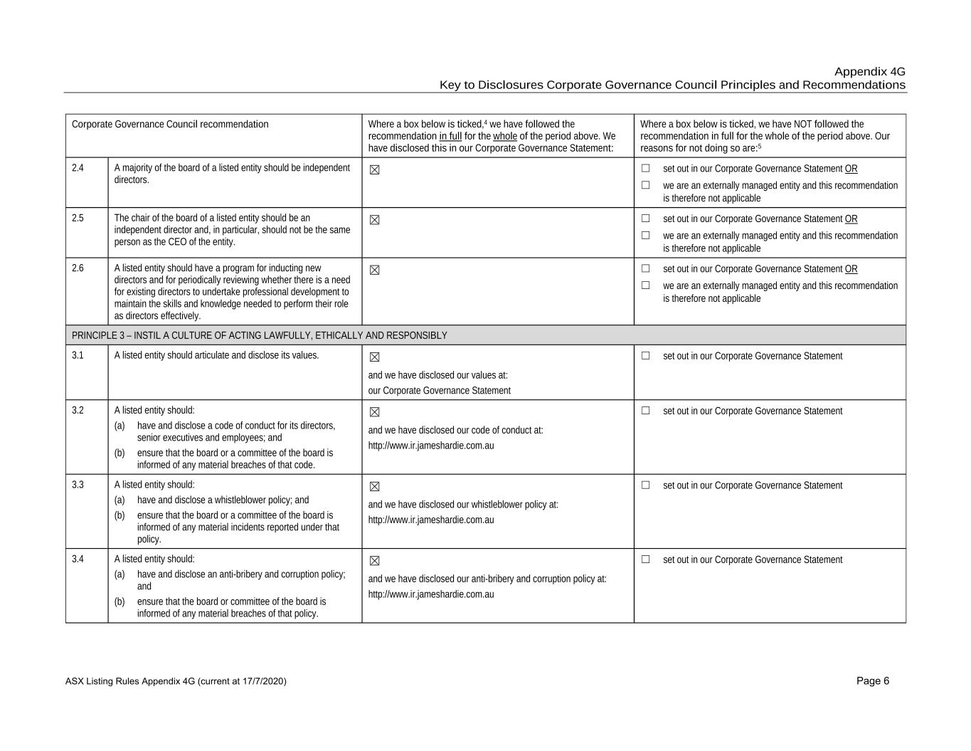 Appendix 4G Key to Disclosures Corporate Governance Council Principles and Recommendations ASX Listing Rules Appendix 4G (current at 17/7/2020) Page 6 Corporate Governance Council recommendation Where a box below is ticked,4 we have followed the recommendation in full for the whole of the period above. We have disclosed this in our Corporate Governance Statement: Where a box below is ticked, we have NOT followed the recommendation in full for the whole of the period above. Our reasons for not doing so are:5 2.4 A majority of the board of a listed entity should be independent directors. ☒ ☐ set out in our Corporate Governance Statement OR ☐ we are an externally managed entity and this recommendation is therefore not applicable 2.5 The chair of the board of a listed entity should be an independent director and, in particular, should not be the same person as the CEO of the entity. ☒ ☐ set out in our Corporate Governance Statement OR ☐ we are an externally managed entity and this recommendation is therefore not applicable 2.6 A listed entity should have a program for inducting new directors and for periodically reviewing whether there is a need for existing directors to undertake professional development to maintain the skills and knowledge needed to perform their role as directors effectively. ☒ ☐ set out in our Corporate Governance Statement OR ☐ we are an externally managed entity and this recommendation is therefore not applicable PRINCIPLE 3 – INSTIL A CULTURE OF ACTING LAWFULLY, ETHICALLY AND RESPONSIBLY 3.1 A listed entity should articulate and disclose its values. ☒ and we have disclosed our values at: our Corporate Governance Statement ☐ set out in our Corporate Governance Statement 3.2 A listed entity should: (a) have and disclose a code of conduct for its directors, senior executives and employees; and (b) ensure that the board or a committee of the board is informed of any material breaches of that code. ☒ and we have disclosed our code of conduct at: http://www.ir.jameshardie.com.au ☐ set out in our Corporate Governance Statement 3.3 A listed entity should: (a) have and disclose a whistleblower policy; and (b) ensure that the board or a committee of the board is informed of any material incidents reported under that policy. ☒ and we have disclosed our whistleblower policy at: http://www.ir.jameshardie.com.au ☐ set out in our Corporate Governance Statement 3.4 A listed entity should: (a) have and disclose an anti-bribery and corruption policy; and (b) ensure that the board or committee of the board is informed of any material breaches of that policy. ☒ and we have disclosed our anti-bribery and corruption policy at: http://www.ir.jameshardie.com.au ☐ set out in our Corporate Governance Statement