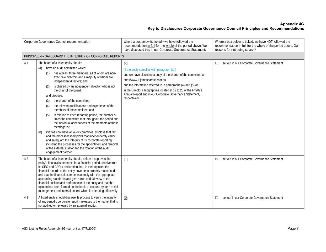 Appendix 4G Key to Disclosures Corporate Governance Council Principles and Recommendations ASX Listing Rules Appendix 4G (current at 17/7/2020) Page 7 Corporate Governance Council recommendation Where a box below is ticked,4 we have followed the recommendation in full for the whole of the period above. We have disclosed this in our Corporate Governance Statement: Where a box below is ticked, we have NOT followed the recommendation in full for the whole of the period above. Our reasons for not doing so are:5 PRINCIPLE 4 – SAFEGUARD THE INTEGRITY OF CORPORATE REPORTS 4.1 The board of a listed entity should: (a) have an audit committee which: (1) has at least three members, all of whom are non- executive directors and a majority of whom are independent directors; and (2) is chaired by an independent director, who is not the chair of the board, and disclose: (3) the charter of the committee; (4) the relevant qualifications and experience of the members of the committee; and (5) in relation to each reporting period, the number of times the committee met throughout the period and the individual attendances of the members at those meetings; or (b) if it does not have an audit committee, disclose that fact and the processes it employs that independently verify and safeguard the integrity of its corporate reporting, including the processes for the appointment and removal of the external auditor and the rotation of the audit engagement partner. ☒ [If the entity complies with paragraph (a):] and we have disclosed a copy of the charter of the committee at: http://www.ir.jameshardie.com.au and the information referred to in paragraphs (4) and (5) at: in the Director’s biographies located at 19 to 26 of the FY2021 Annual Report and in our Corporate Governance Statement, respectively ☐ set out in our Corporate Governance Statement 4.2 The board of a listed entity should, before it approves the entity’s financial statements for a financial period, receive from its CEO and CFO a declaration that, in their opinion, the financial records of the entity have been properly maintained and that the financial statements comply with the appropriate accounting standards and give a true and fair view of the financial position and performance of the entity and that the opinion has been formed on the basis of a sound system of risk management and internal control which is operating effectively. ☐ ☒ set out in our Corporate Governance Statement 4.3 A listed entity should disclose its process to verify the integrity of any periodic corporate report it releases to the market that is not audited or reviewed by an external auditor. ☒ ☐ set out in our Corporate Governance Statement