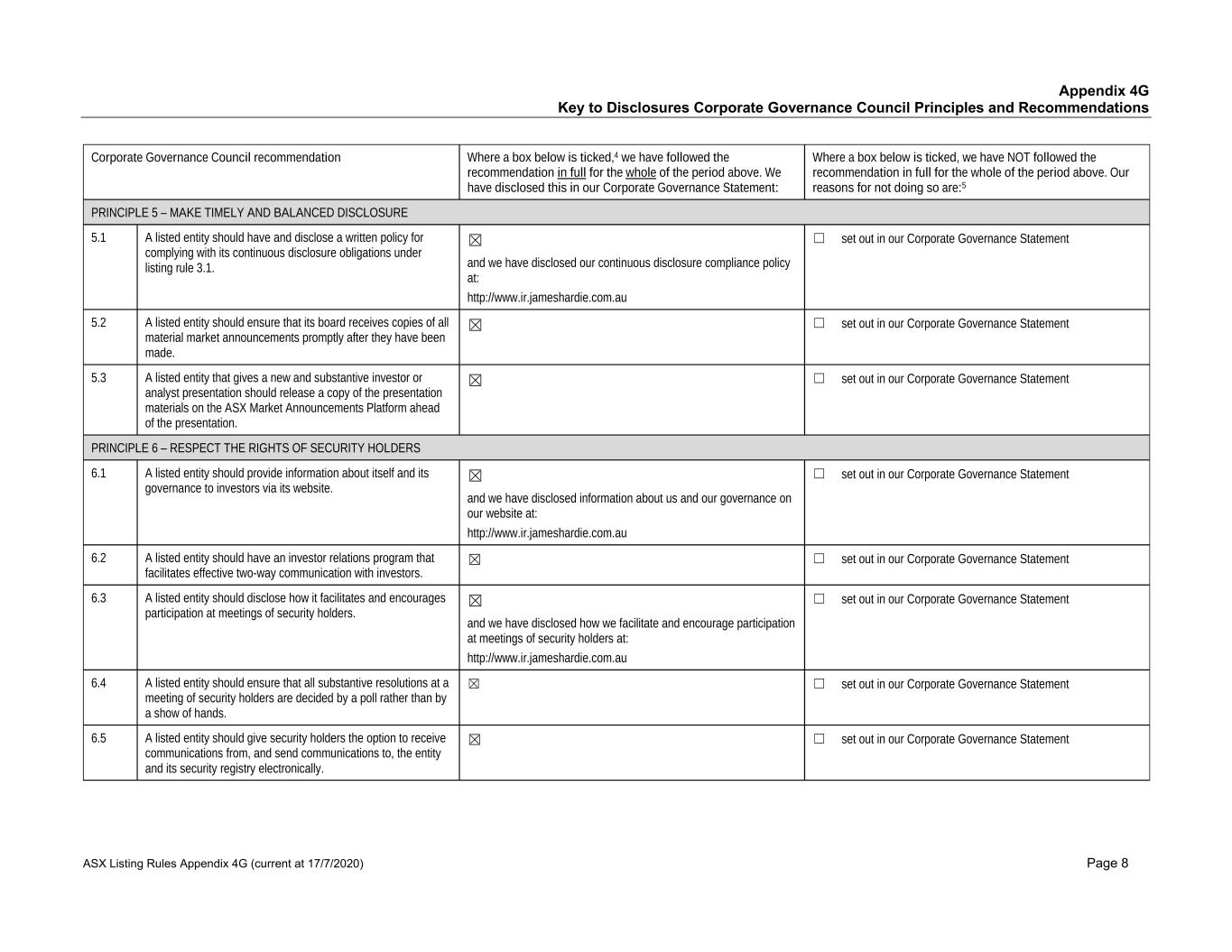 Appendix 4G Key to Disclosures Corporate Governance Council Principles and Recommendations ASX Listing Rules Appendix 4G (current at 17/7/2020) Page 8 Corporate Governance Council recommendation Where a box below is ticked,4 we have followed the recommendation in full for the whole of the period above. We have disclosed this in our Corporate Governance Statement: Where a box below is ticked, we have NOT followed the recommendation in full for the whole of the period above. Our reasons for not doing so are:5 PRINCIPLE 5 – MAKE TIMELY AND BALANCED DISCLOSURE 5.1 A listed entity should have and disclose a written policy for complying with its continuous disclosure obligations under listing rule 3.1. ☒ and we have disclosed our continuous disclosure compliance policy at: http://www.ir.jameshardie.com.au ☐ set out in our Corporate Governance Statement 5.2 A listed entity should ensure that its board receives copies of all material market announcements promptly after they have been made. ☒ ☐ set out in our Corporate Governance Statement 5.3 A listed entity that gives a new and substantive investor or analyst presentation should release a copy of the presentation materials on the ASX Market Announcements Platform ahead of the presentation. ☒ ☐ set out in our Corporate Governance Statement PRINCIPLE 6 – RESPECT THE RIGHTS OF SECURITY HOLDERS 6.1 A listed entity should provide information about itself and its governance to investors via its website. ☒ and we have disclosed information about us and our governance on our website at: http://www.ir.jameshardie.com.au ☐ set out in our Corporate Governance Statement 6.2 A listed entity should have an investor relations program that facilitates effective two-way communication with investors. ☒ ☐ set out in our Corporate Governance Statement 6.3 A listed entity should disclose how it facilitates and encourages participation at meetings of security holders. ☒ and we have disclosed how we facilitate and encourage participation at meetings of security holders at: http://www.ir.jameshardie.com.au ☐ set out in our Corporate Governance Statement 6.4 A listed entity should ensure that all substantive resolutions at a meeting of security holders are decided by a poll rather than by a show of hands. ☒ ☐ set out in our Corporate Governance Statement 6.5 A listed entity should give security holders the option to receive communications from, and send communications to, the entity and its security registry electronically. ☒ ☐ set out in our Corporate Governance Statement