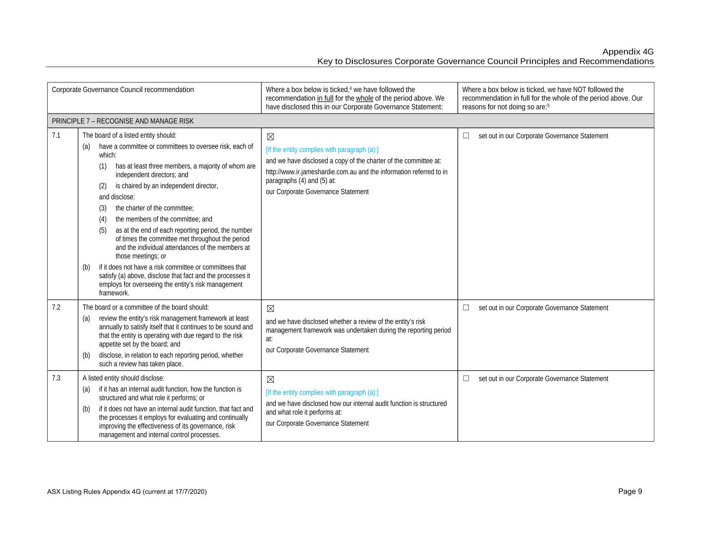 Appendix 4G Key to Disclosures Corporate Governance Council Principles and Recommendations ASX Listing Rules Appendix 4G (current at 17/7/2020) Page 9 Corporate Governance Council recommendation Where a box below is ticked,4 we have followed the recommendation in full for the whole of the period above. We have disclosed this in our Corporate Governance Statement: Where a box below is ticked, we have NOT followed the recommendation in full for the whole of the period above. Our reasons for not doing so are:5 PRINCIPLE 7 – RECOGNISE AND MANAGE RISK 7.1 The board of a listed entity should: (a) have a committee or committees to oversee risk, each of which: (1) has at least three members, a majority of whom are independent directors; and (2) is chaired by an independent director, and disclose: (3) the charter of the committee; (4) the members of the committee; and (5) as at the end of each reporting period, the number of times the committee met throughout the period and the individual attendances of the members at those meetings; or (b) if it does not have a risk committee or committees that satisfy (a) above, disclose that fact and the processes it employs for overseeing the entity’s risk management framework. ☒ [If the entity complies with paragraph (a):] and we have disclosed a copy of the charter of the committee at: http://www.ir.jameshardie.com.au and the information referred to in paragraphs (4) and (5) at: our Corporate Governance Statement ☐ set out in our Corporate Governance Statement 7.2 The board or a committee of the board should: (a) review the entity’s risk management framework at least annually to satisfy itself that it continues to be sound and that the entity is operating with due regard to the risk appetite set by the board; and (b) disclose, in relation to each reporting period, whether such a review has taken place. ☒ and we have disclosed whether a review of the entity’s risk management framework was undertaken during the reporting period at: our Corporate Governance Statement ☐ set out in our Corporate Governance Statement 7.3 A listed entity should disclose: (a) if it has an internal audit function, how the function is structured and what role it performs; or (b) if it does not have an internal audit function, that fact and the processes it employs for evaluating and continually improving the effectiveness of its governance, risk management and internal control processes. ☒ [If the entity complies with paragraph (a):] and we have disclosed how our internal audit function is structured and what role it performs at: our Corporate Governance Statement ☐ set out in our Corporate Governance Statement