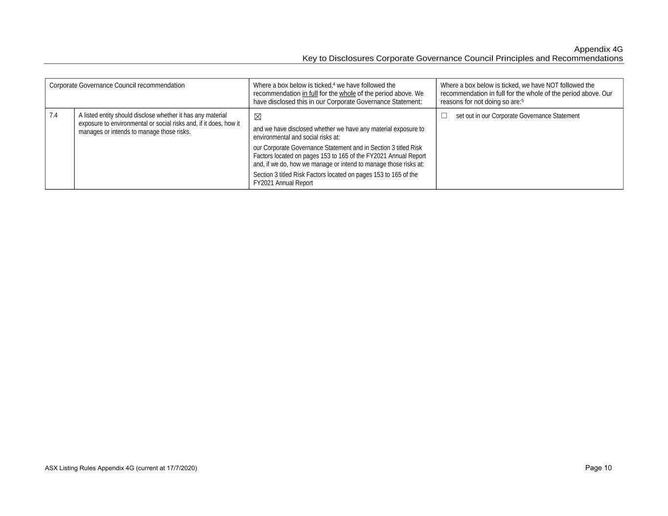 Appendix 4G Key to Disclosures Corporate Governance Council Principles and Recommendations ASX Listing Rules Appendix 4G (current at 17/7/2020) Page 10 Corporate Governance Council recommendation Where a box below is ticked,4 we have followed the recommendation in full for the whole of the period above. We have disclosed this in our Corporate Governance Statement: Where a box below is ticked, we have NOT followed the recommendation in full for the whole of the period above. Our reasons for not doing so are:5 7.4 A listed entity should disclose whether it has any material exposure to environmental or social risks and, if it does, how it manages or intends to manage those risks. ☒ and we have disclosed whether we have any material exposure to environmental and social risks at: our Corporate Governance Statement and in Section 3 titled Risk Factors located on pages 153 to 165 of the FY2021 Annual Report and, if we do, how we manage or intend to manage those risks at: Section 3 titled Risk Factors located on pages 153 to 165 of the FY2021 Annual Report ☐ set out in our Corporate Governance Statement