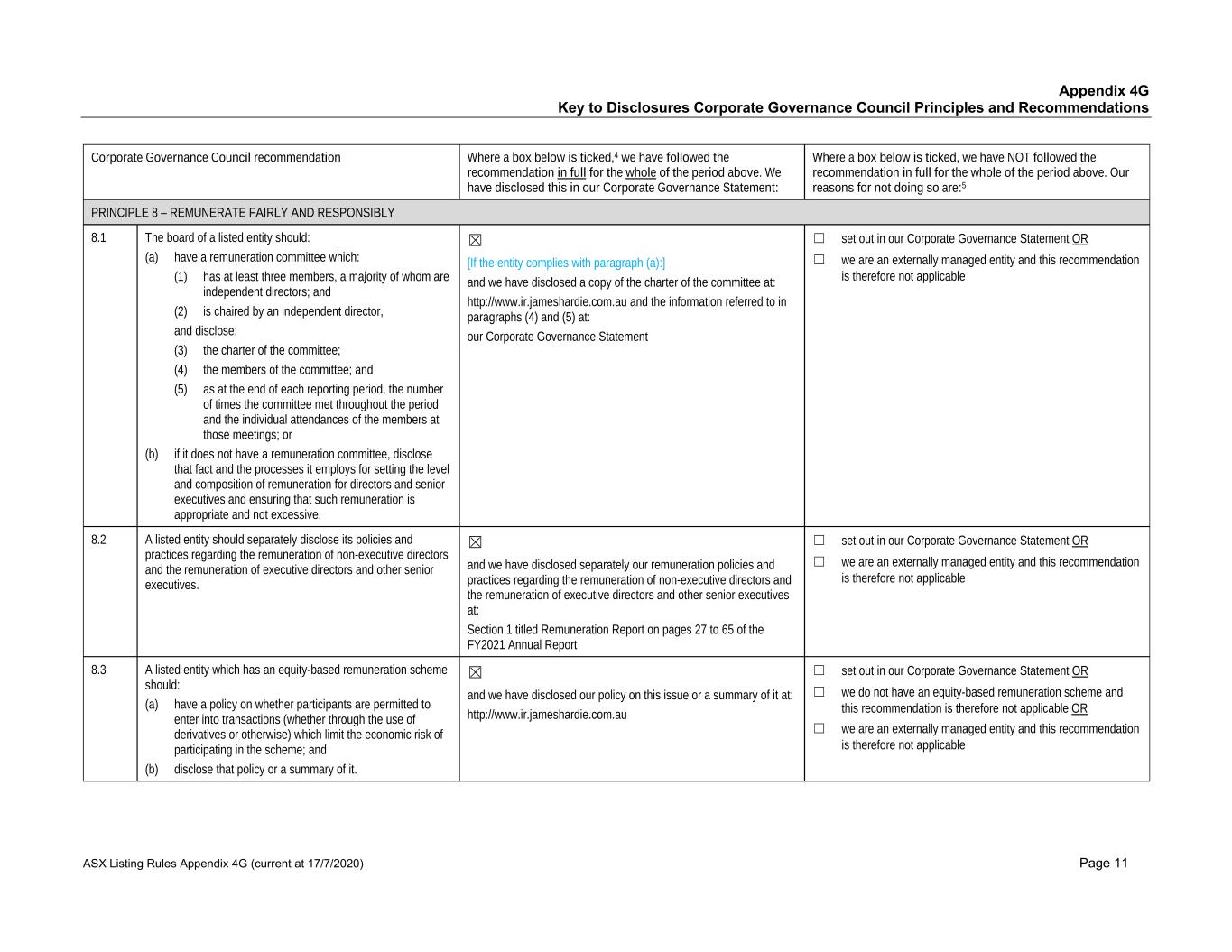 Appendix 4G Key to Disclosures Corporate Governance Council Principles and Recommendations ASX Listing Rules Appendix 4G (current at 17/7/2020) Page 11 Corporate Governance Council recommendation Where a box below is ticked,4 we have followed the recommendation in full for the whole of the period above. We have disclosed this in our Corporate Governance Statement: Where a box below is ticked, we have NOT followed the recommendation in full for the whole of the period above. Our reasons for not doing so are:5 PRINCIPLE 8 – REMUNERATE FAIRLY AND RESPONSIBLY 8.1 The board of a listed entity should: (a) have a remuneration committee which: (1) has at least three members, a majority of whom are independent directors; and (2) is chaired by an independent director, and disclose: (3) the charter of the committee; (4) the members of the committee; and (5) as at the end of each reporting period, the number of times the committee met throughout the period and the individual attendances of the members at those meetings; or (b) if it does not have a remuneration committee, disclose that fact and the processes it employs for setting the level and composition of remuneration for directors and senior executives and ensuring that such remuneration is appropriate and not excessive. ☒ [If the entity complies with paragraph (a):] and we have disclosed a copy of the charter of the committee at: http://www.ir.jameshardie.com.au and the information referred to in paragraphs (4) and (5) at: our Corporate Governance Statement ☐ set out in our Corporate Governance Statement OR ☐ we are an externally managed entity and this recommendation is therefore not applicable 8.2 A listed entity should separately disclose its policies and practices regarding the remuneration of non-executive directors and the remuneration of executive directors and other senior executives. ☒ and we have disclosed separately our remuneration policies and practices regarding the remuneration of non-executive directors and the remuneration of executive directors and other senior executives at: Section 1 titled Remuneration Report on pages 27 to 65 of the FY2021 Annual Report ☐ set out in our Corporate Governance Statement OR ☐ we are an externally managed entity and this recommendation is therefore not applicable 8.3 A listed entity which has an equity-based remuneration scheme should: (a) have a policy on whether participants are permitted to enter into transactions (whether through the use of derivatives or otherwise) which limit the economic risk of participating in the scheme; and (b) disclose that policy or a summary of it. ☒ and we have disclosed our policy on this issue or a summary of it at: http://www.ir.jameshardie.com.au ☐ set out in our Corporate Governance Statement OR ☐ we do not have an equity-based remuneration scheme and this recommendation is therefore not applicable OR ☐ we are an externally managed entity and this recommendation is therefore not applicable