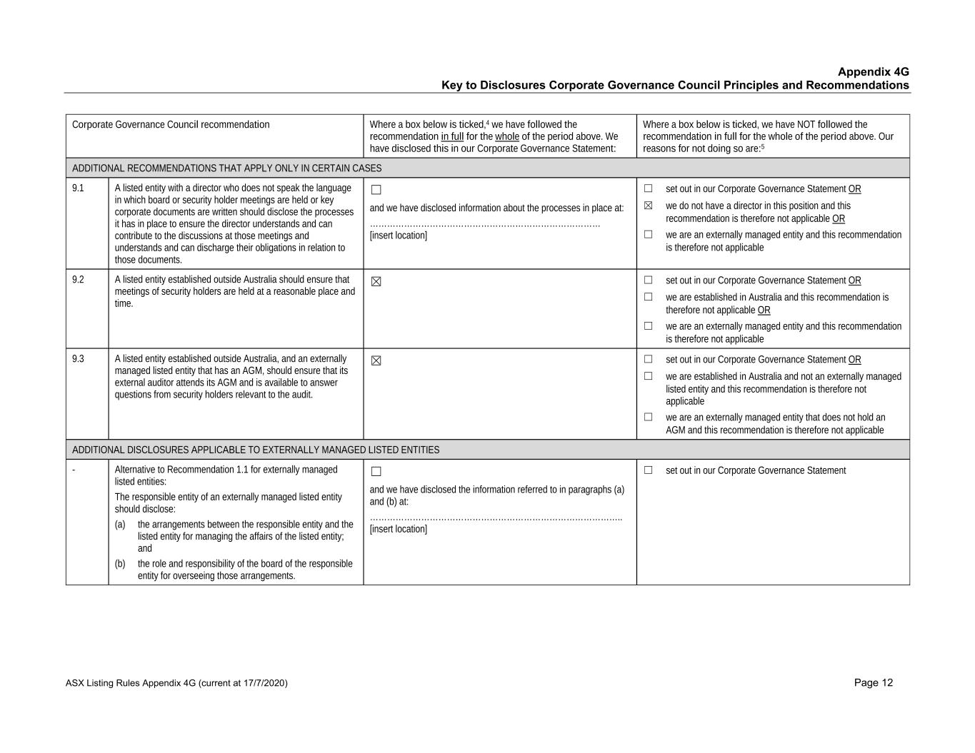 Appendix 4G Key to Disclosures Corporate Governance Council Principles and Recommendations ASX Listing Rules Appendix 4G (current at 17/7/2020) Page 12 Corporate Governance Council recommendation Where a box below is ticked,4 we have followed the recommendation in full for the whole of the period above. We have disclosed this in our Corporate Governance Statement: Where a box below is ticked, we have NOT followed the recommendation in full for the whole of the period above. Our reasons for not doing so are:5 ADDITIONAL RECOMMENDATIONS THAT APPLY ONLY IN CERTAIN CASES 9.1 A listed entity with a director who does not speak the language in which board or security holder meetings are held or key corporate documents are written should disclose the processes it has in place to ensure the director understands and can contribute to the discussions at those meetings and understands and can discharge their obligations in relation to those documents. ☐ and we have disclosed information about the processes in place at: ……………………………………………………………………… [insert location] ☐ set out in our Corporate Governance Statement OR ☒ we do not have a director in this position and this recommendation is therefore not applicable OR ☐ we are an externally managed entity and this recommendation is therefore not applicable 9.2 A listed entity established outside Australia should ensure that meetings of security holders are held at a reasonable place and time. ☒ ☐ set out in our Corporate Governance Statement OR ☐ we are established in Australia and this recommendation is therefore not applicable OR ☐ we are an externally managed entity and this recommendation is therefore not applicable 9.3 A listed entity established outside Australia, and an externally managed listed entity that has an AGM, should ensure that its external auditor attends its AGM and is available to answer questions from security holders relevant to the audit. ☒ ☐ set out in our Corporate Governance Statement OR ☐ we are established in Australia and not an externally managed listed entity and this recommendation is therefore not applicable ☐ we are an externally managed entity that does not hold an AGM and this recommendation is therefore not applicable ADDITIONAL DISCLOSURES APPLICABLE TO EXTERNALLY MANAGED LISTED ENTITIES - Alternative to Recommendation 1.1 for externally managed listed entities: The responsible entity of an externally managed listed entity should disclose: (a) the arrangements between the responsible entity and the listed entity for managing the affairs of the listed entity; and (b) the role and responsibility of the board of the responsible entity for overseeing those arrangements. ☐ and we have disclosed the information referred to in paragraphs (a) and (b) at: …………………………………………………………………………….. [insert location] ☐ set out in our Corporate Governance Statement