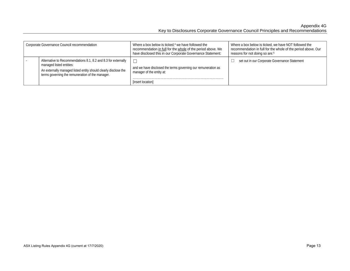 Appendix 4G Key to Disclosures Corporate Governance Council Principles and Recommendations ASX Listing Rules Appendix 4G (current at 17/7/2020) Page 13 Corporate Governance Council recommendation Where a box below is ticked,4 we have followed the recommendation in full for the whole of the period above. We have disclosed this in our Corporate Governance Statement: Where a box below is ticked, we have NOT followed the recommendation in full for the whole of the period above. Our reasons for not doing so are:5 - Alternative to Recommendations 8.1, 8.2 and 8.3 for externally managed listed entities: An externally managed listed entity should clearly disclose the terms governing the remuneration of the manager. ☐ and we have disclosed the terms governing our remuneration as manager of the entity at: …………………………………………………………………………….. [insert location] ☐ set out in our Corporate Governance Statement