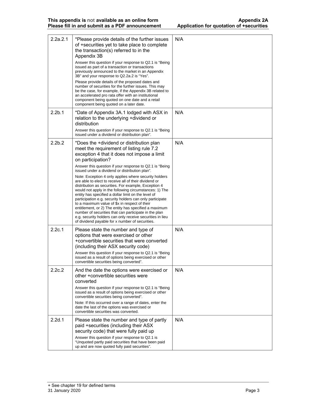 This appendix is not available as an online form Appendix 2A Please fill in and submit as a PDF announcement Application for quotation of +securities + See chapter 19 for defined terms 31 January 2020 Page 3 2.2a.2.1 *Please provide details of the further issues of +securities yet to take place to complete the transaction(s) referred to in the Appendix 3B Answer this question if your response to Q2.1 is “Being issued as part of a transaction or transactions previously announced to the market in an Appendix 3B” and your response to Q2.2a.2 is “Yes”. Please provide details of the proposed dates and number of securities for the further issues. This may be the case, for example, if the Appendix 3B related to an accelerated pro rata offer with an institutional component being quoted on one date and a retail component being quoted on a later date. N/A 2.2b.1 *Date of Appendix 3A.1 lodged with ASX in relation to the underlying +dividend or distribution Answer this question if your response to Q2.1 is “Being issued under a dividend or distribution plan”. N/A 2.2b.2 *Does the +dividend or distribution plan meet the requirement of listing rule 7.2 exception 4 that it does not impose a limit on participation? Answer this question if your response to Q2.1 is “Being issued under a dividend or distribution plan”. Note: Exception 4 only applies where security holders are able to elect to receive all of their dividend or distribution as securities. For example, Exception 4 would not apply in the following circumstances: 1) The entity has specified a dollar limit on the level of participation e.g. security holders can only participate to a maximum value of $x in respect of their entitlement, or 2) The entity has specified a maximum number of securities that can participate in the plan e.g. security holders can only receive securities in lieu of dividend payable for x number of securities. N/A 2.2c.1 Please state the number and type of options that were exercised or other +convertible securities that were converted (including their ASX security code) Answer this question if your response to Q2.1 is “Being issued as a result of options being exercised or other convertible securities being converted”. N/A 2.2c.2 And the date the options were exercised or other +convertible securities were converted Answer this question if your response to Q2.1 is “Being issued as a result of options being exercised or other convertible securities being converted”. Note: If this occurred over a range of dates, enter the date the last of the options was exercised or convertible securities was converted. N/A 2.2d.1 Please state the number and type of partly paid +securities (including their ASX security code) that were fully paid up Answer this question if your response to Q2.1 is “Unquoted partly paid securities that have been paid up and are now quoted fully paid securities”. N/A