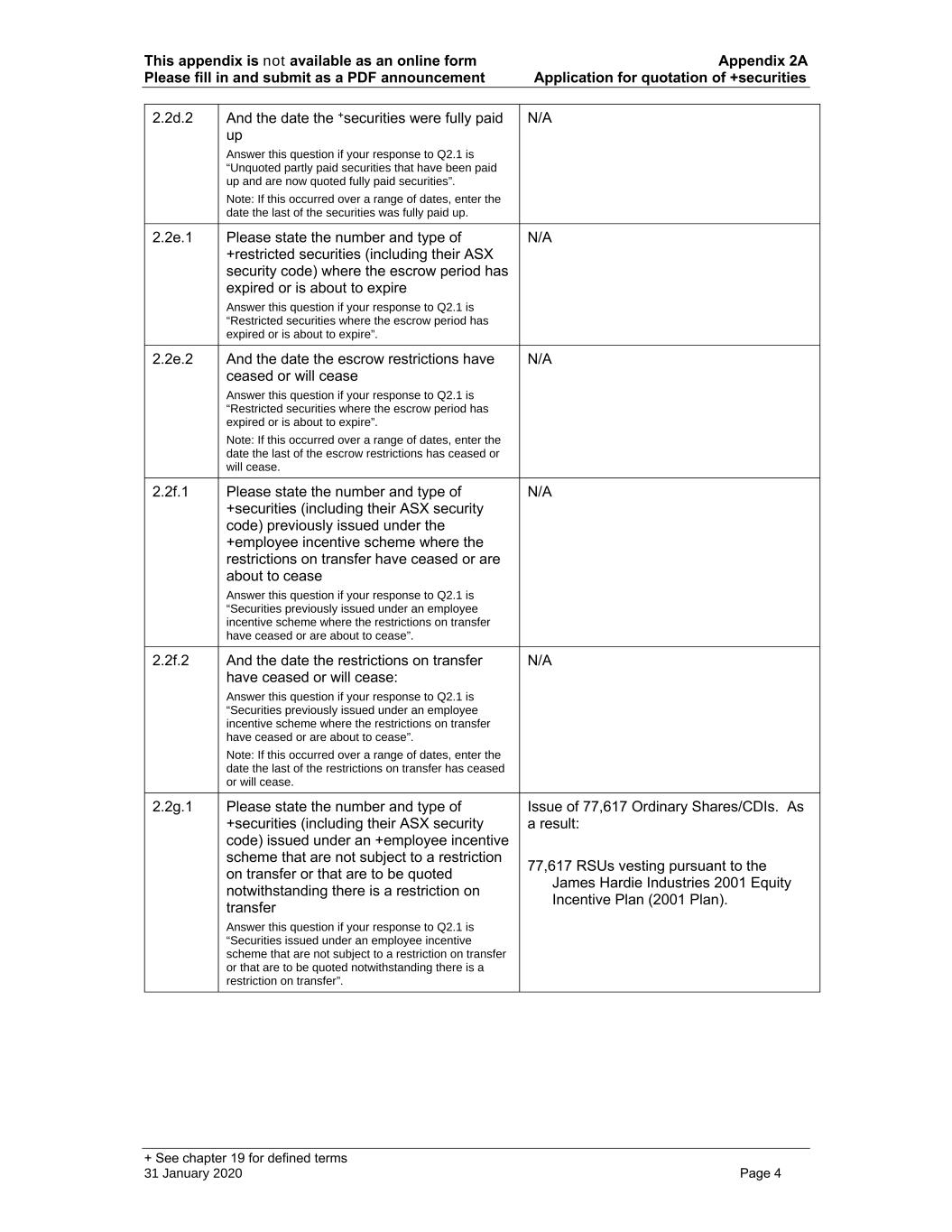 This appendix is not available as an online form Appendix 2A Please fill in and submit as a PDF announcement Application for quotation of +securities + See chapter 19 for defined terms 31 January 2020 Page 4 2.2d.2 And the date the +securities were fully paid up Answer this question if your response to Q2.1 is “Unquoted partly paid securities that have been paid up and are now quoted fully paid securities”. Note: If this occurred over a range of dates, enter the date the last of the securities was fully paid up. N/A 2.2e.1 Please state the number and type of +restricted securities (including their ASX security code) where the escrow period has expired or is about to expire Answer this question if your response to Q2.1 is “Restricted securities where the escrow period has expired or is about to expire”. N/A 2.2e.2 And the date the escrow restrictions have ceased or will cease Answer this question if your response to Q2.1 is “Restricted securities where the escrow period has expired or is about to expire”. Note: If this occurred over a range of dates, enter the date the last of the escrow restrictions has ceased or will cease. N/A 2.2f.1 Please state the number and type of +securities (including their ASX security code) previously issued under the +employee incentive scheme where the restrictions on transfer have ceased or are about to cease Answer this question if your response to Q2.1 is “Securities previously issued under an employee incentive scheme where the restrictions on transfer have ceased or are about to cease”. N/A 2.2f.2 And the date the restrictions on transfer have ceased or will cease: Answer this question if your response to Q2.1 is “Securities previously issued under an employee incentive scheme where the restrictions on transfer have ceased or are about to cease”. Note: If this occurred over a range of dates, enter the date the last of the restrictions on transfer has ceased or will cease. N/A 2.2g.1 Please state the number and type of +securities (including their ASX security code) issued under an +employee incentive scheme that are not subject to a restriction on transfer or that are to be quoted notwithstanding there is a restriction on transfer Answer this question if your response to Q2.1 is “Securities issued under an employee incentive scheme that are not subject to a restriction on transfer or that are to be quoted notwithstanding there is a restriction on transfer”. Issue of 77,617 Ordinary Shares/CDIs. As a result: 77,617 RSUs vesting pursuant to the James Hardie Industries 2001 Equity Incentive Plan (2001 Plan).