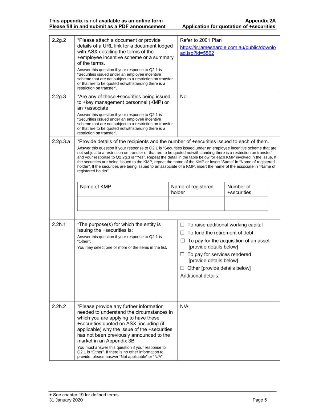 This appendix is not available as an online form Appendix 2A Please fill in and submit as a PDF announcement Application for quotation of +securities + See chapter 19 for defined terms 31 January 2020 Page 5 2.2g.2 *Please attach a document or provide details of a URL link for a document lodged with ASX detailing the terms of the +employee incentive scheme or a summary of the terms. Answer this question if your response to Q2.1 is “Securities issued under an employee incentive scheme that are not subject to a restriction on transfer or that are to be quoted notwithstanding there is a restriction on transfer”. Refer to 2001 Plan https://ir.jameshardie.com.au/public/downlo ad.jsp?id=5562 2.2g.3 *Are any of these +securities being issued to +key management personnel (KMP) or an +associate Answer this question if your response to Q2.1 is “Securities issued under an employee incentive scheme that are not subject to a restriction on transfer or that are to be quoted notwithstanding there is a restriction on transfer”. No 2.2g.3.a *Provide details of the recipients and the number of +securities issued to each of them. Answer this question if your response to Q2.1 is “Securities issued under an employee incentive scheme that are not subject to a restriction on transfer or that are to be quoted notwithstanding there is a restriction on transfer” and your response to Q2.2g.3 is “Yes”. Repeat the detail in the table below for each KMP involved in the issue. If the securities are being issued to the KMP, repeat the name of the KMP or insert “Same” in “Name of registered holder”. If the securities are being issued to an associate of a KMP, insert the name of the associate in “Name of registered holder”. Name of KMP Name of registered holder Number of +securities 2.2h.1 *The purpose(s) for which the entity is issuing the +securities is: Answer this question if your response to Q2.1 is “Other”. You may select one or more of the items in the list. ☐ To raise additional working capital ☐ To fund the retirement of debt ☐ To pay for the acquisition of an asset [provide details below] ☐ To pay for services rendered [provide details below] ☐ Other [provide details below] Additional details: 2.2h.2 *Please provide any further information needed to understand the circumstances in which you are applying to have these +securities quoted on ASX, including (if applicable) why the issue of the +securities has not been previously announced to the market in an Appendix 3B You must answer this question if your response to Q2.1 is “Other”. If there is no other information to provide, please answer “Not applicable” or “N/A”. N/A