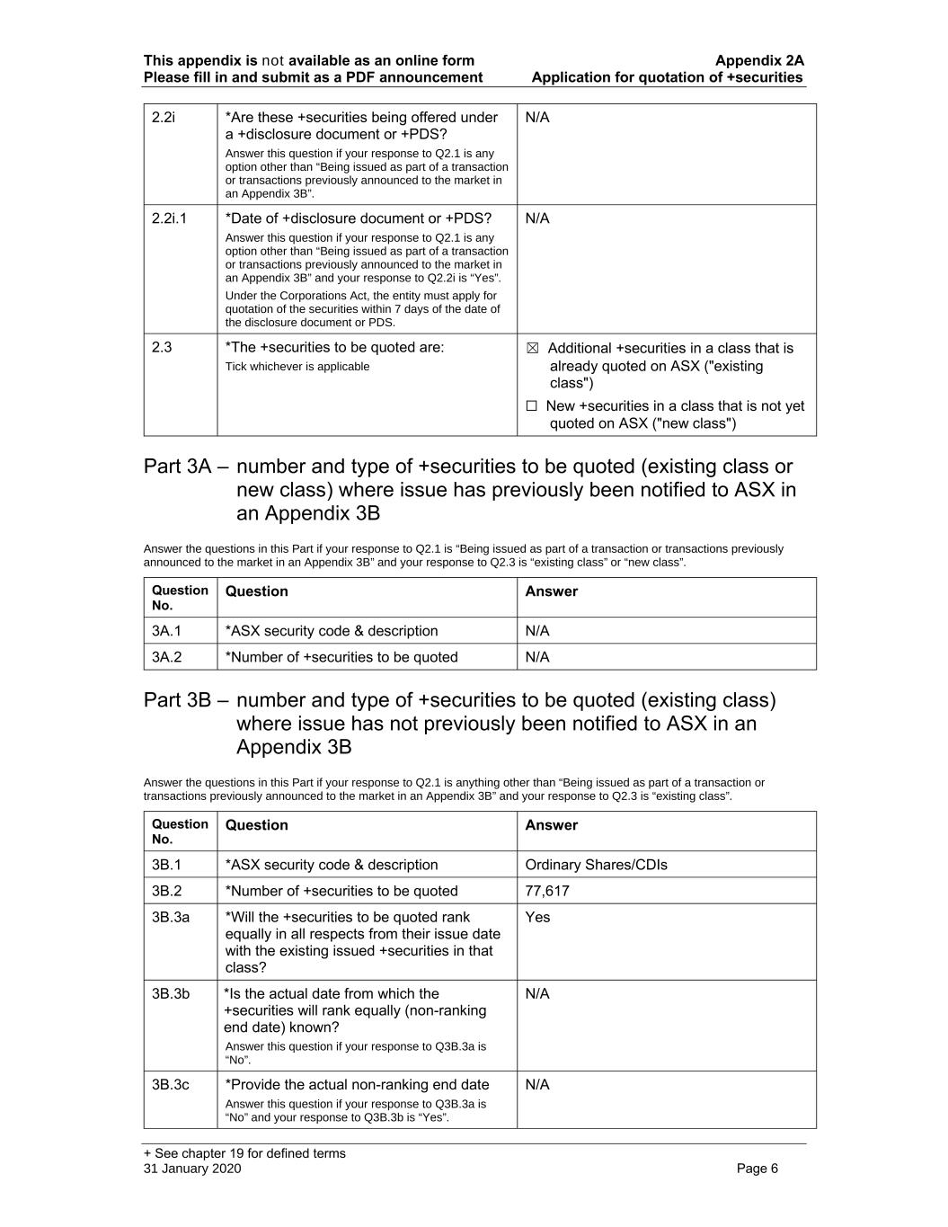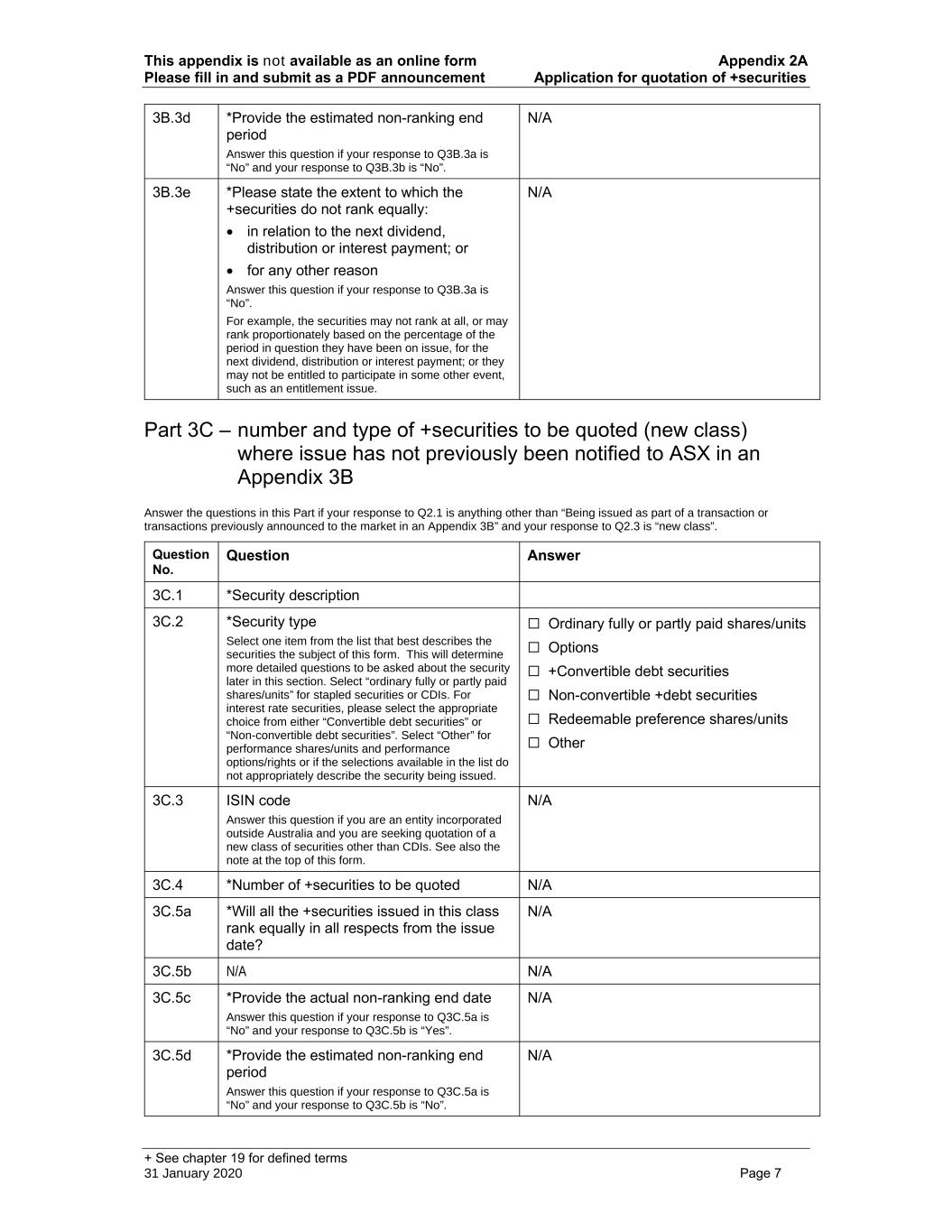 This appendix is not available as an online form Appendix 2A Please fill in and submit as a PDF announcement Application for quotation of +securities + See chapter 19 for defined terms 31 January 2020 Page 7 3B.3d *Provide the estimated non-ranking end period Answer this question if your response to Q3B.3a is “No” and your response to Q3B.3b is “No”. N/A 3B.3e *Please state the extent to which the +securities do not rank equally: in relation to the next dividend, distribution or interest payment; or for any other reason Answer this question if your response to Q3B.3a is “No”. For example, the securities may not rank at all, or may rank proportionately based on the percentage of the period in question they have been on issue, for the next dividend, distribution or interest payment; or they may not be entitled to participate in some other event, such as an entitlement issue. N/A Part 3C – number and type of +securities to be quoted (new class) where issue has not previously been notified to ASX in an Appendix 3B Answer the questions in this Part if your response to Q2.1 is anything other than “Being issued as part of a transaction or transactions previously announced to the market in an Appendix 3B” and your response to Q2.3 is “new class”. Question No. Question Answer 3C.1 *Security description 3C.2 *Security type Select one item from the list that best describes the securities the subject of this form. This will determine more detailed questions to be asked about the security later in this section. Select “ordinary fully or partly paid shares/units” for stapled securities or CDIs. For interest rate securities, please select the appropriate choice from either “Convertible debt securities” or “Non-convertible debt securities”. Select “Other” for performance shares/units and performance options/rights or if the selections available in the list do not appropriately describe the security being issued. ☐ Ordinary fully or partly paid shares/units ☐ Options ☐ +Convertible debt securities ☐ Non-convertible +debt securities ☐ Redeemable preference shares/units ☐ Other 3C.3 ISIN code Answer this question if you are an entity incorporated outside Australia and you are seeking quotation of a new class of securities other than CDIs. See also the note at the top of this form. N/A 3C.4 *Number of +securities to be quoted N/A 3C.5a *Will all the +securities issued in this class rank equally in all respects from the issue date? N/A 3C.5b N/A N/A 3C.5c *Provide the actual non-ranking end date Answer this question if your response to Q3C.5a is “No” and your response to Q3C.5b is “Yes”. N/A 3C.5d *Provide the estimated non-ranking end period Answer this question if your response to Q3C.5a is “No” and your response to Q3C.5b is “No”. N/A
