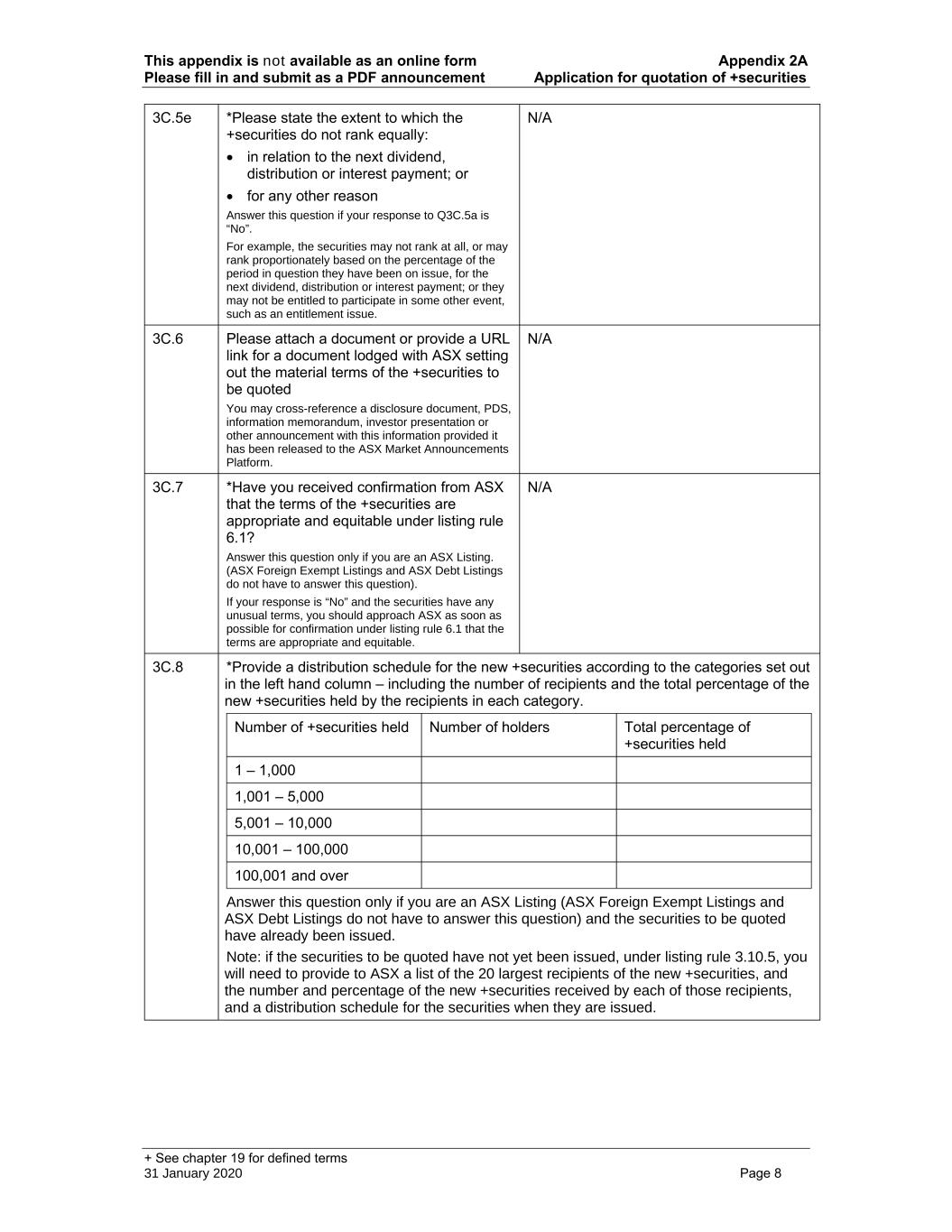 This appendix is not available as an online form Appendix 2A Please fill in and submit as a PDF announcement Application for quotation of +securities + See chapter 19 for defined terms 31 January 2020 Page 8 3C.5e *Please state the extent to which the +securities do not rank equally: in relation to the next dividend, distribution or interest payment; or for any other reason Answer this question if your response to Q3C.5a is “No”. For example, the securities may not rank at all, or may rank proportionately based on the percentage of the period in question they have been on issue, for the next dividend, distribution or interest payment; or they may not be entitled to participate in some other event, such as an entitlement issue. N/A 3C.6 Please attach a document or provide a URL link for a document lodged with ASX setting out the material terms of the +securities to be quoted You may cross-reference a disclosure document, PDS, information memorandum, investor presentation or other announcement with this information provided it has been released to the ASX Market Announcements Platform. N/A 3C.7 *Have you received confirmation from ASX that the terms of the +securities are appropriate and equitable under listing rule 6.1? Answer this question only if you are an ASX Listing. (ASX Foreign Exempt Listings and ASX Debt Listings do not have to answer this question). If your response is “No” and the securities have any unusual terms, you should approach ASX as soon as possible for confirmation under listing rule 6.1 that the terms are appropriate and equitable. N/A 3C.8 *Provide a distribution schedule for the new +securities according to the categories set out in the left hand column – including the number of recipients and the total percentage of the new +securities held by the recipients in each category. Number of +securities held Number of holders Total percentage of +securities held 1 – 1,000 1,001 – 5,000 5,001 – 10,000 10,001 – 100,000 100,001 and over Answer this question only if you are an ASX Listing (ASX Foreign Exempt Listings and ASX Debt Listings do not have to answer this question) and the securities to be quoted have already been issued. Note: if the securities to be quoted have not yet been issued, under listing rule 3.10.5, you will need to provide to ASX a list of the 20 largest recipients of the new +securities, and the number and percentage of the new +securities received by each of those recipients, and a distribution schedule for the securities when they are issued.