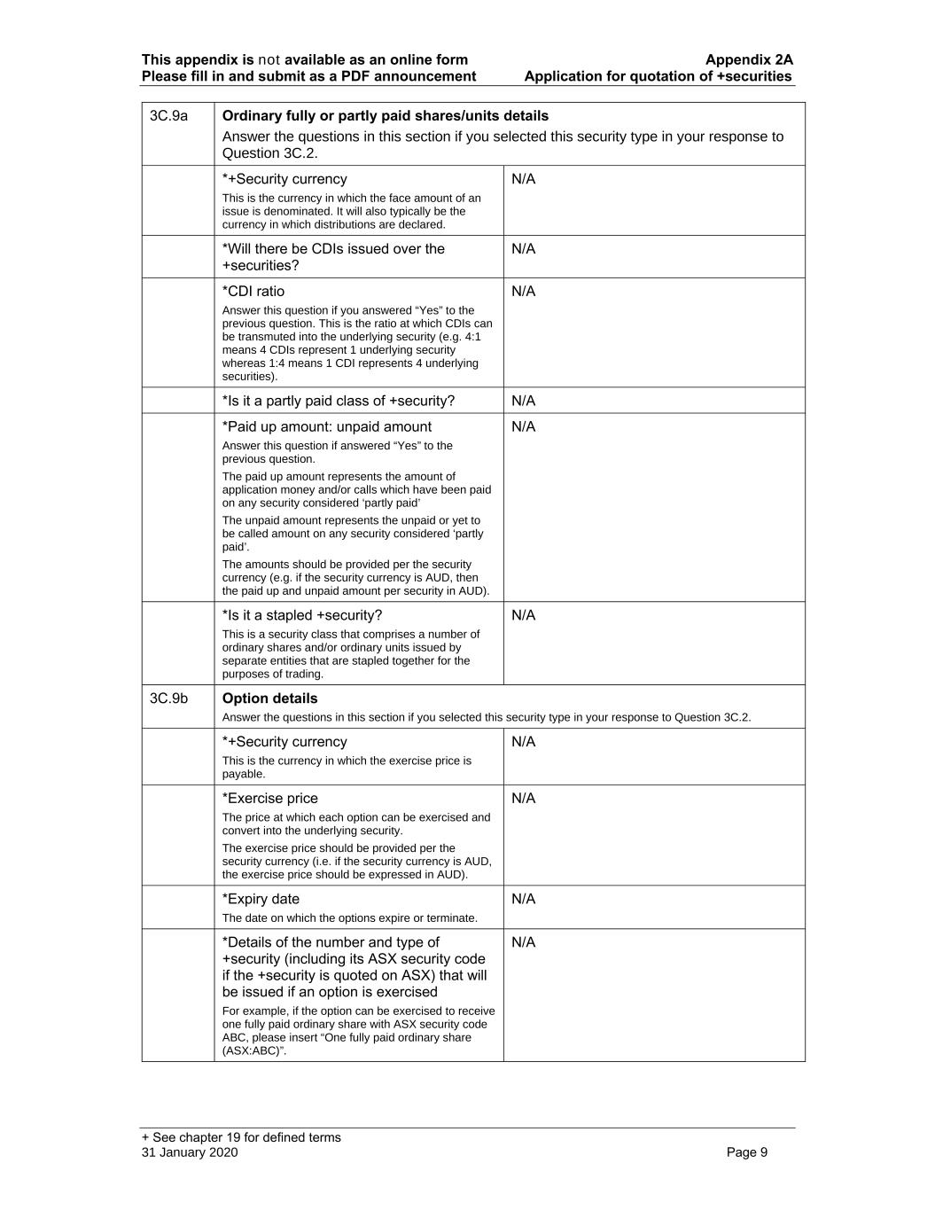 This appendix is not available as an online form Appendix 2A Please fill in and submit as a PDF announcement Application for quotation of +securities + See chapter 19 for defined terms 31 January 2020 Page 9 3C.9a Ordinary fully or partly paid shares/units details Answer the questions in this section if you selected this security type in your response to Question 3C.2. *+Security currency This is the currency in which the face amount of an issue is denominated. It will also typically be the currency in which distributions are declared. N/A *Will there be CDIs issued over the +securities? N/A *CDI ratio Answer this question if you answered “Yes” to the previous question. This is the ratio at which CDIs can be transmuted into the underlying security (e.g. 4:1 means 4 CDIs represent 1 underlying security whereas 1:4 means 1 CDI represents 4 underlying securities). N/A *Is it a partly paid class of +security? N/A *Paid up amount: unpaid amount Answer this question if answered “Yes” to the previous question. The paid up amount represents the amount of application money and/or calls which have been paid on any security considered ‘partly paid’ The unpaid amount represents the unpaid or yet to be called amount on any security considered ‘partly paid’. The amounts should be provided per the security currency (e.g. if the security currency is AUD, then the paid up and unpaid amount per security in AUD). N/A *Is it a stapled +security? This is a security class that comprises a number of ordinary shares and/or ordinary units issued by separate entities that are stapled together for the purposes of trading. N/A 3C.9b Option details Answer the questions in this section if you selected this security type in your response to Question 3C.2. *+Security currency This is the currency in which the exercise price is payable. N/A *Exercise price The price at which each option can be exercised and convert into the underlying security. The exercise price should be provided per the security currency (i.e. if the security currency is AUD, the exercise price should be expressed in AUD). N/A *Expiry date The date on which the options expire or terminate. N/A *Details of the number and type of +security (including its ASX security code if the +security is quoted on ASX) that will be issued if an option is exercised For example, if the option can be exercised to receive one fully paid ordinary share with ASX security code ABC, please insert “One fully paid ordinary share (ASX:ABC)”. N/A