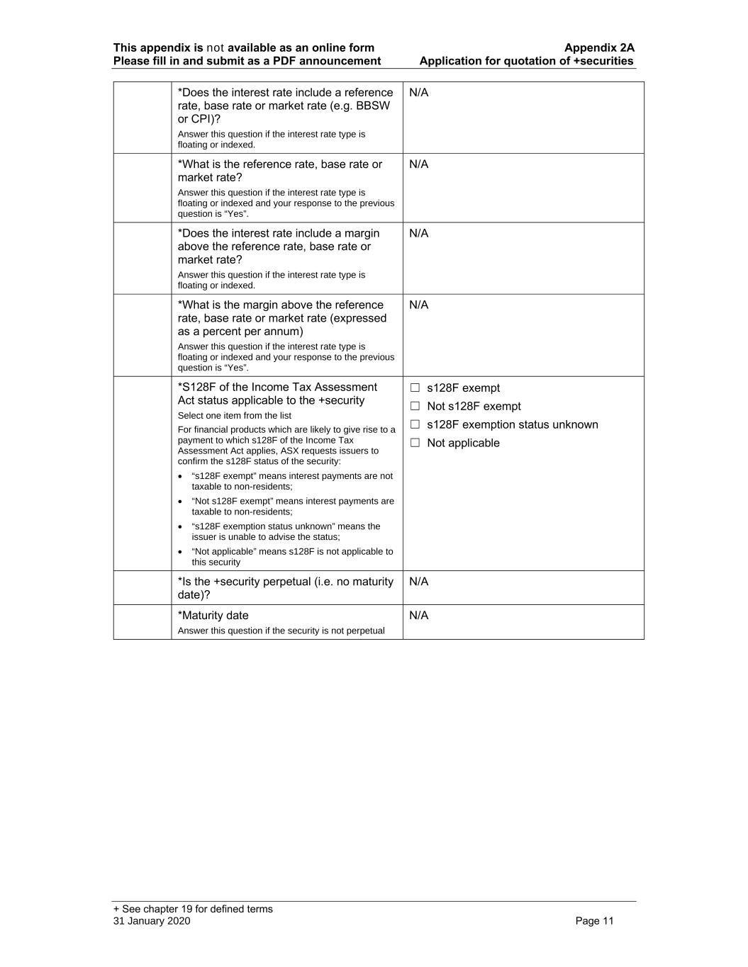This appendix is not available as an online form Appendix 2A Please fill in and submit as a PDF announcement Application for quotation of +securities + See chapter 19 for defined terms 31 January 2020 Page 11 *Does the interest rate include a reference rate, base rate or market rate (e.g. BBSW or CPI)? Answer this question if the interest rate type is floating or indexed. N/A *What is the reference rate, base rate or market rate? Answer this question if the interest rate type is floating or indexed and your response to the previous question is “Yes”. N/A *Does the interest rate include a margin above the reference rate, base rate or market rate? Answer this question if the interest rate type is floating or indexed. N/A *What is the margin above the reference rate, base rate or market rate (expressed as a percent per annum) Answer this question if the interest rate type is floating or indexed and your response to the previous question is “Yes”. N/A *S128F of the Income Tax Assessment Act status applicable to the +security Select one item from the list For financial products which are likely to give rise to a payment to which s128F of the Income Tax Assessment Act applies, ASX requests issuers to confirm the s128F status of the security: “s128F exempt” means interest payments are not taxable to non-residents; “Not s128F exempt” means interest payments are taxable to non-residents; “s128F exemption status unknown” means the issuer is unable to advise the status; “Not applicable” means s128F is not applicable to this security ☐ s128F exempt ☐ Not s128F exempt ☐ s128F exemption status unknown ☐ Not applicable *Is the +security perpetual (i.e. no maturity date)? N/A *Maturity date Answer this question if the security is not perpetual N/A