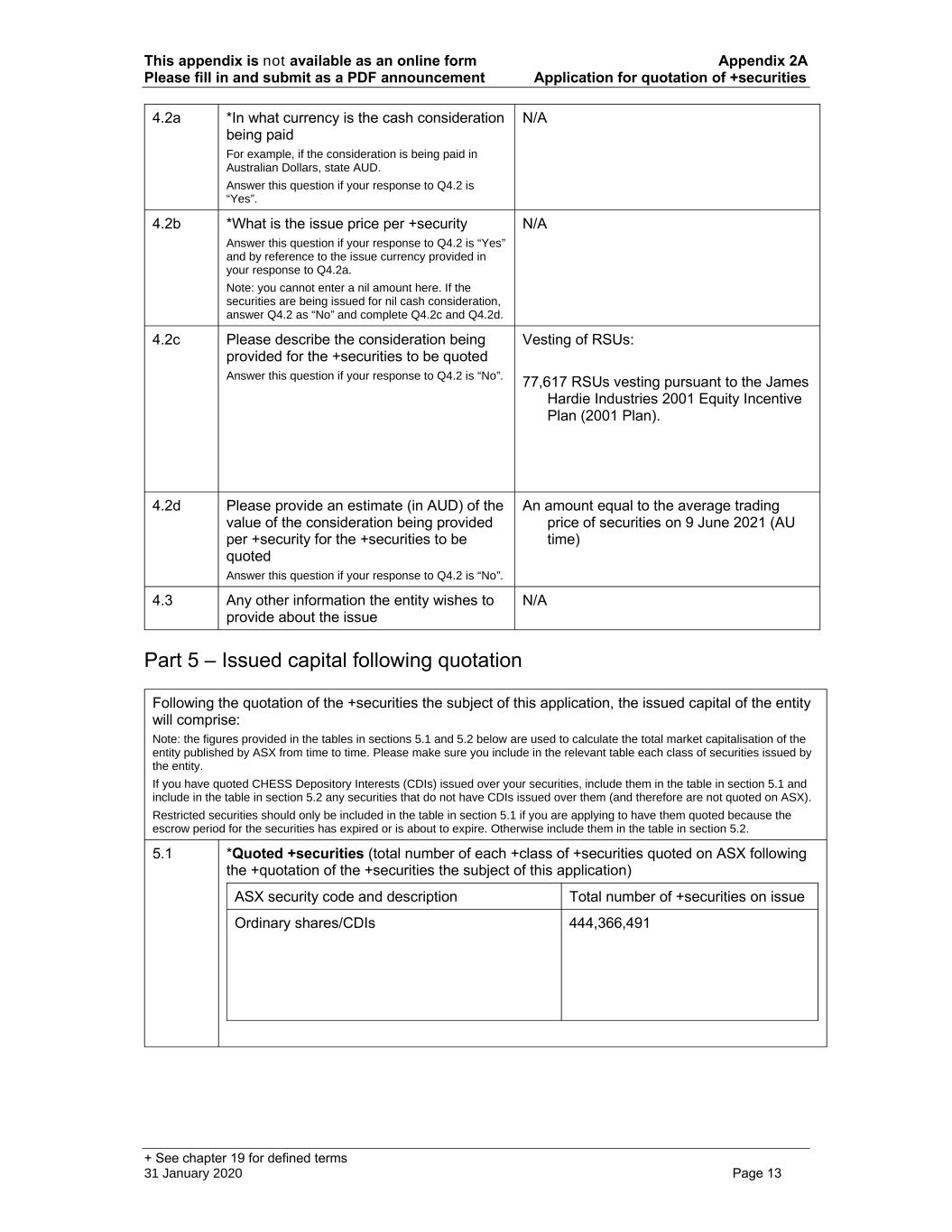 This appendix is not available as an online form Appendix 2A Please fill in and submit as a PDF announcement Application for quotation of +securities + See chapter 19 for defined terms 31 January 2020 Page 13 4.2a *In what currency is the cash consideration being paid For example, if the consideration is being paid in Australian Dollars, state AUD. Answer this question if your response to Q4.2 is “Yes”. N/A 4.2b *What is the issue price per +security Answer this question if your response to Q4.2 is “Yes” and by reference to the issue currency provided in your response to Q4.2a. Note: you cannot enter a nil amount here. If the securities are being issued for nil cash consideration, answer Q4.2 as “No” and complete Q4.2c and Q4.2d. N/A 4.2c Please describe the consideration being provided for the +securities to be quoted Answer this question if your response to Q4.2 is “No”. Vesting of RSUs: 77,617 RSUs vesting pursuant to the James Hardie Industries 2001 Equity Incentive Plan (2001 Plan). 4.2d Please provide an estimate (in AUD) of the value of the consideration being provided per +security for the +securities to be quoted Answer this question if your response to Q4.2 is “No”. An amount equal to the average trading price of securities on 9 June 2021 (AU time) 4.3 Any other information the entity wishes to provide about the issue N/A Part 5 – Issued capital following quotation Following the quotation of the +securities the subject of this application, the issued capital of the entity will comprise: Note: the figures provided in the tables in sections 5.1 and 5.2 below are used to calculate the total market capitalisation of the entity published by ASX from time to time. Please make sure you include in the relevant table each class of securities issued by the entity. If you have quoted CHESS Depository Interests (CDIs) issued over your securities, include them in the table in section 5.1 and include in the table in section 5.2 any securities that do not have CDIs issued over them (and therefore are not quoted on ASX). Restricted securities should only be included in the table in section 5.1 if you are applying to have them quoted because the escrow period for the securities has expired or is about to expire. Otherwise include them in the table in section 5.2. 5.1 *Quoted +securities (total number of each +class of +securities quoted on ASX following the +quotation of the +securities the subject of this application) ASX security code and description Total number of +securities on issue Ordinary shares/CDIs 444,366,491