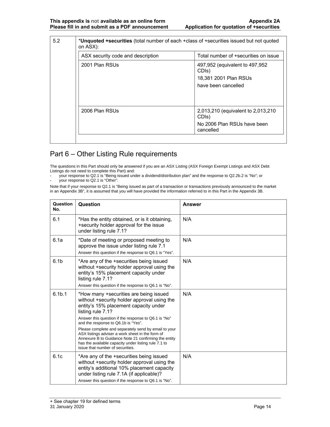 This appendix is not available as an online form Appendix 2A Please fill in and submit as a PDF announcement Application for quotation of +securities + See chapter 19 for defined terms 31 January 2020 Page 14 5.2 *Unquoted +securities (total number of each +class of +securities issued but not quoted on ASX): ASX security code and description Total number of +securities on issue 2001 Plan RSUs 497,952 (equivalent to 497,952 CDIs) 18,381 2001 Plan RSUs have been cancelled 2006 Plan RSUs 2,013,210 (equivalent to 2,013,210 CDIs) No 2006 Plan RSUs have been cancelled Part 6 – Other Listing Rule requirements The questions in this Part should only be answered if you are an ASX Listing (ASX Foreign Exempt Listings and ASX Debt Listings do not need to complete this Part) and: - your response to Q2.1 is “Being issued under a dividend/distribution plan” and the response to Q2.2b.2 is “No”; or - your response to Q2.1 is “Other”. Note that if your response to Q2.1 is “Being issued as part of a transaction or transactions previously announced to the market in an Appendix 3B”, it is assumed that you will have provided the information referred to in this Part in the Appendix 3B. Question No. Question Answer 6.1 *Has the entity obtained, or is it obtaining, +security holder approval for the issue under listing rule 7.1? N/A 6.1a *Date of meeting or proposed meeting to approve the issue under listing rule 7.1 Answer this question if the response to Q6.1 is “Yes”. N/A 6.1b *Are any of the +securities being issued without +security holder approval using the entity’s 15% placement capacity under listing rule 7.1? Answer this question if the response to Q6.1 is “No”. N/A 6.1b.1 *How many +securities are being issued without +security holder approval using the entity’s 15% placement capacity under listing rule 7.1? Answer this question if the response to Q6.1 is “No” and the response to Q6.1b is “Yes”. Please complete and separately send by email to your ASX listings adviser a work sheet in the form of Annexure B to Guidance Note 21 confirming the entity has the available capacity under listing rule 7.1 to issue that number of securities. N/A 6.1c *Are any of the +securities being issued without +security holder approval using the entity’s additional 10% placement capacity under listing rule 7.1A (if applicable)? Answer this question if the response to Q6.1 is “No”. N/A