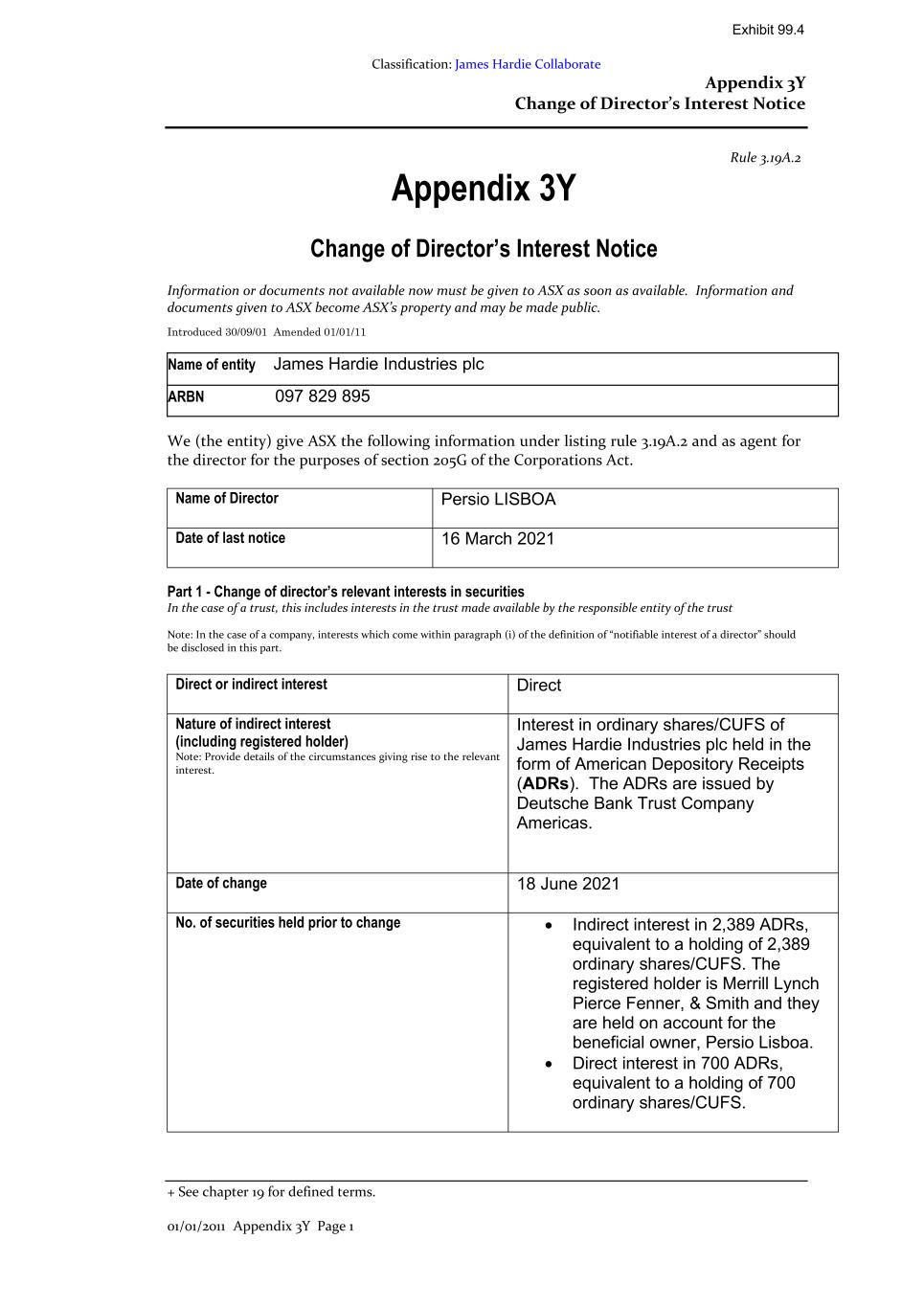 Classification: James Hardie Collaborate Appendix 3Y Change of Director’s Interest Notice + See chapter 19 for defined terms. 01/01/2011 Appendix 3Y Page 1 Rule 3.19A.2 Appendix 3Y Change of Director’s Interest Notice Information or documents not available now must be given to ASX as soon as available. Information and documents given to ASX become ASX’s property and may be made public. Introduced 30/09/01 Amended 01/01/11 Name of entity James Hardie Industries plc ARBN 097 829 895 We (the entity) give ASX the following information under listing rule 3.19A.2 and as agent for the director for the purposes of section 205G of the Corporations Act. Name of Director Persio LISBOA Date of last notice 16 March 2021 Part 1 - Change of director’s relevant interests in securities In the case of a trust, this includes interests in the trust made available by the responsible entity of the trust Note: In the case of a company, interests which come within paragraph (i) of the definition of “notifiable interest of a director” should be disclosed in this part. Direct or indirect interest Direct Nature of indirect interest (including registered holder) Note: Provide details of the circumstances giving rise to the relevant interest. Interest in ordinary shares/CUFS of James Hardie Industries plc held in the form of American Depository Receipts (ADRs). The ADRs are issued by Deutsche Bank Trust Company Americas. Date of change 18 June 2021 No. of securities held prior to change • Indirect interest in 2,389 ADRs, equivalent to a holding of 2,389 ordinary shares/CUFS. The registered holder is Merrill Lynch Pierce Fenner, & Smith and they are held on account for the beneficial owner, Persio Lisboa. • Direct interest in 700 ADRs, equivalent to a holding of 700 ordinary shares/CUFS. Exhibit 99.4