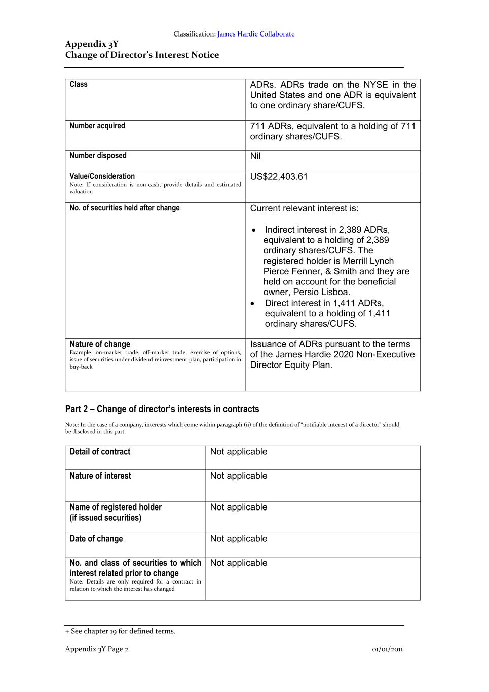 Classification: James Hardie Collaborate Appendix 3Y Change of Director’s Interest Notice + See chapter 19 for defined terms. Appendix 3Y Page 2 01/01/2011 Class ADRs. ADRs trade on the NYSE in the United States and one ADR is equivalent to one ordinary share/CUFS. Number acquired 711 ADRs, equivalent to a holding of 711 ordinary shares/CUFS. Number disposed Nil Value/Consideration Note: If consideration is non-cash, provide details and estimated valuation US$22,403.61 No. of securities held after change Current relevant interest is: • Indirect interest in 2,389 ADRs, equivalent to a holding of 2,389 ordinary shares/CUFS. The registered holder is Merrill Lynch Pierce Fenner, & Smith and they are held on account for the beneficial owner, Persio Lisboa. • Direct interest in 1,411 ADRs, equivalent to a holding of 1,411 ordinary shares/CUFS. Nature of change Example: on-market trade, off-market trade, exercise of options, issue of securities under dividend reinvestment plan, participation in buy-back Issuance of ADRs pursuant to the terms of the James Hardie 2020 Non-Executive Director Equity Plan. Part 2 – Change of director’s interests in contracts Note: In the case of a company, interests which come within paragraph (ii) of the definition of “notifiable interest of a director” should be disclosed in this part. Detail of contract Not applicable Nature of interest Not applicable Name of registered holder (if issued securities) Not applicable Date of change Not applicable No. and class of securities to which interest related prior to change Note: Details are only required for a contract in relation to which the interest has changed Not applicable