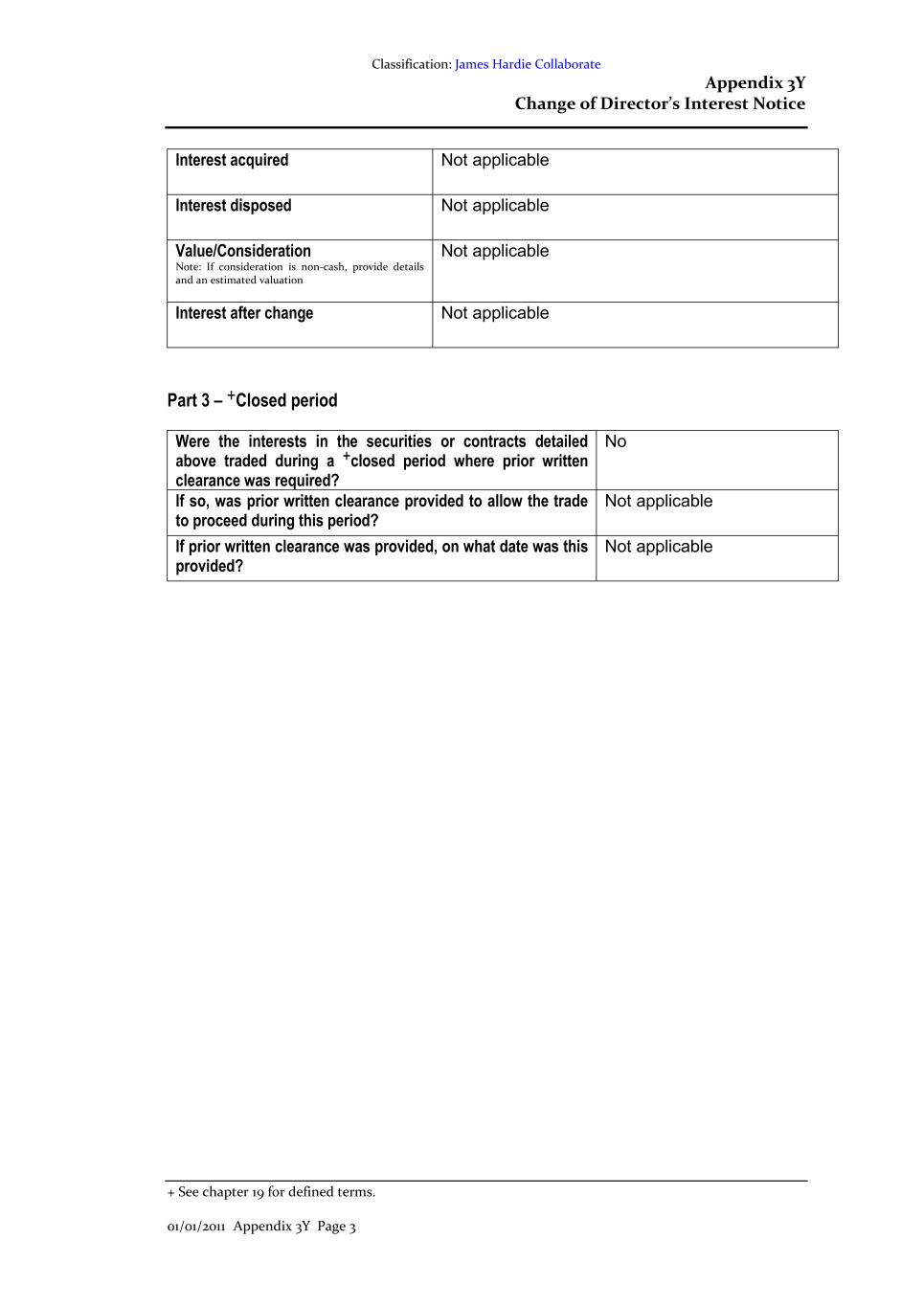 Classification: James Hardie Collaborate Appendix 3Y Change of Director’s Interest Notice + See chapter 19 for defined terms. 01/01/2011 Appendix 3Y Page 3 Interest acquired Not applicable Interest disposed Not applicable Value/Consideration Note: If consideration is non-cash, provide details and an estimated valuation Not applicable Interest after change Not applicable Part 3 – +Closed period Were the interests in the securities or contracts detailed above traded during a +closed period where prior written clearance was required? No If so, was prior written clearance provided to allow the trade to proceed during this period? Not applicable If prior written clearance was provided, on what date was this provided? Not applicable
