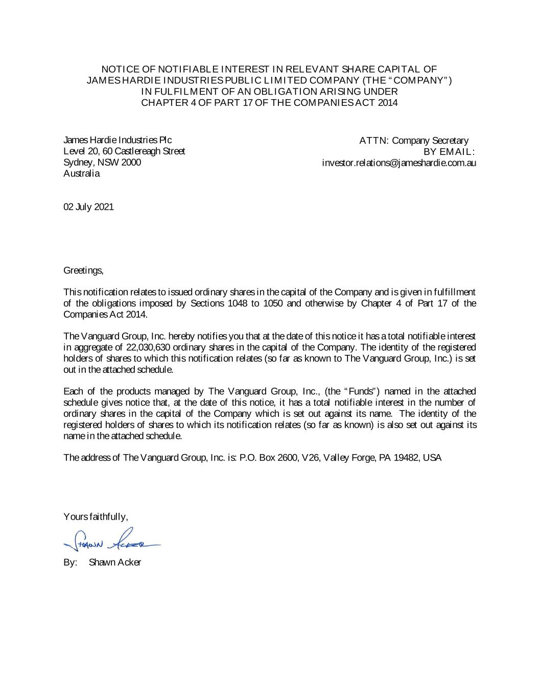 James Hardie Industries plc Europa House 2nd Floor, Harcourt Centre Harcourt Street, Dublin 2, D02 WR20, Ireland T: +353 (0) 1 411 6924 F: +353 (0) 1 479 1128 James Hardie Industries plc is a limited liability company incorporated in Ireland with its registered office at Europa House 2nd Floor, Harcourt Centre, Harcourt Street, Dublin 2, D02 WR20, Ireland. Directors: Michael Hammes (Chairman, USA), Andrea Gisle Joosen (Sweden), David Harrison (USA), Persio Lisboa (USA), Anne Lloyd (USA), Moe Nozari (USA), Rada Rodriguez (Sweden), Suzanne B. Rowland (USA), Dean Seavers (USA), Nigel Stein (UK), Harold Wiens (USA). Chief Executive Officer and Director: Jack Truong (USA) Company number: 485719 ARBN: 097 829 895 6 July 2021 The Manager Company Announcements Office Australian Securities Exchange Limited 20 Bridge Street SYDNEY NSW 2000 Dear Sir/Madam Substantial Holding Notice As required under ASX Listing Rule 3.17.3 please see attached a copy of the substantial holding notice received by James Hardie on 5 July 2021. Regards Joseph C. Blasko General Counsel & Company Secretary This announcement has been authorised for release by the General Counsel and Company Secretary, Mr Joseph C. Blasko. Exhibit 99.1