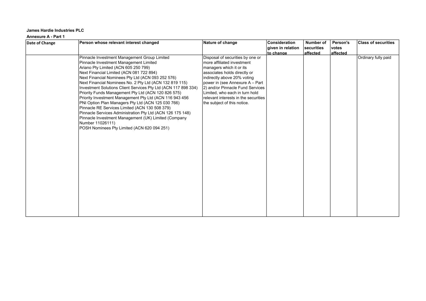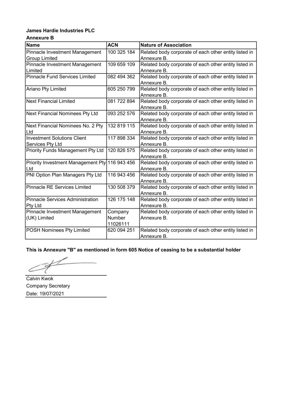 James Hardie Industries PLC Annexure C Name Address Pinnacle Investment Management Group Limited Level 19, 307 Queen St, Brisbane QLD 4000, Australia Pinnacle Fund Services Limited Level 19, 307 Queen St, Brisbane QLD 4000, Australia Pinnacle Investment Management Limited Level 19, 307 Queen St, Brisbane QLD 4000, Australia Pinnacle Investment Management Group Limited Level 19, 307 Queen St, Brisbane QLD 4000, Australia Pinnacle Investment Management Limited Level 19, 307 Queen St, Brisbane QLD 4000, Australia Pinnacle Fund Services Limited Level 19, 307 Queen St, Brisbane QLD 4000, Australia Ariano Pty Limited Level 19, 307 Queen St, Brisbane QLD 4000, Australia Next Financial Limited Level 19, 307 Queen St, Brisbane QLD 4000, Australia Next Financial Nominees Pty Ltd Level 19, 307 Queen St, Brisbane QLD 4000, Australia Next Financial Nominees No. 2 Pty Ltd Level 19, 307 Queen St, Brisbane QLD 4000, Australia Investment Solutions Client Services Pty Ltd Level 19, 307 Queen St, Brisbane QLD 4000, Australia Priority Funds Management Pty Ltd Level 19, 307 Queen St, Brisbane QLD 4000, Australia Priority Investment Management Pty Ltd Level 19, 307 Queen St, Brisbane QLD 4000, Australia PNI Option Plan Managers Pty Ltd Level 19, 307 Queen St, Brisbane QLD 4000, Australia Pinnacle Investment Management (UK) Limited 7th Floor, Dashwood House, 69 Old Broad Street, London EC2M 1QS, United Kingdom Pinnacle RE Services Limited Level 19, 307 Queen St, Brisbane QLD 4000, Australia Pinnacle Services Administration Pty Ltd Level 19, 307 Queen St, Brisbane QLD 4000, Australia POSH Nominees Pty Limited Level 19, 307 Queen St, Brisbane QLD 4000, Australia This is Annexure "C" as mentioned in form 605 Notice of ceasing to be a substantial holder Calvin Kwok Company Secretary Date: 19/07/2021
