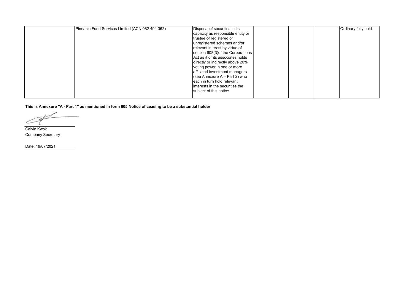 605 Page 2 of 2 15 July 2001 sign here date 19/07/2021 DIRECTIONS (1) If there are a number of substantial holders with similar or related relevant interests (eg. a corporation and its related corporations, or the manager and trustee of an equity trust), the names could be included in an annexure to the form. If the relevant interests of a group of persons are essentially similar, they may be referred to throughout the form as a specifically named group if the membership of each group, with the names and addresses of members is clearly set out in paragraph 4 of the form. (2) See the definition of "relevant interest" in sections 608 and 671B(7) of the Corporations Act 2001. (3) See the definition of "associate" in section 9 of the Corporations Act 2001. (4) Include details of: (a) any relevant agreement or other circumstances because of which the change in relevant interest occurred. If subsection 671B(4) applies, a copy of any document setting out the terms of any relevant agreement, and a statement by the person giving full and accurate details of any contract, scheme or arrangement, must accompany this form, together with a written statement certifying this contract, scheme or arrangement; and (b) any qualification of the power of a person to exercise, control the exercise of, or influence the exercise of, the voting powers or disposal of the securities to which the relevant interest relates (indicating clearly the particular securities to which the qualification applies). See the definition of "relevant agreement" in section 9 of the Corporations Act 2001. (5) Details of the consideration must include any and all benefits, money and other, that any person from whom a relevant interest was acquired has, or may, become entitled to receive in relation to that acquisition. Details must be included even if the benefit is conditional on the happening or not of a contingency. Details must be included of any benefit paid on behalf of the substantial holder or its associate in relation to the acquisitions, even if they are not paid directly to the person from whom the relevant interest was acquired. (6) The voting shares of a company constitute one class unless divided into separate classes. (7) Give details, if appropriate, of the present association and any change in that association since the last substantial holding notice.