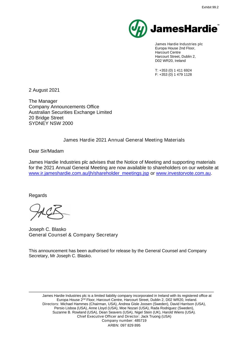 James Hardie Industries plc Europa House 2nd Floor, Harcourt Centre Harcourt Street, Dublin 2, D02 WR20, Ireland T: +353 (0) 1 411 6924 F: +353 (0) 1 479 1128 James Hardie Industries plc is a limited liability company incorporated in Ireland with its registered office at Europa House 2nd Floor, Harcourt Centre, Harcourt Street, Dublin 2, D02 WR20, Ireland. Directors: Michael Hammes (Chairman, USA), Andrea Gisle Joosen (Sweden), David Harrison (USA), Persio Lisboa (USA), Anne Lloyd (USA), Moe Nozari (USA), Rada Rodriguez (Sweden), Suzanne B. Rowland (USA), Dean Seavers (USA), Nigel Stein (UK), Harold Wiens (USA). Chief Executive Officer and Director: Jack Truong (USA) Company number: 485719 ARBN: 097 829 895 2 August 2021 The Manager Company Announcements Office Australian Securities Exchange Limited 20 Bridge Street SYDNEY NSW 2000 James Hardie 2021 Annual General Meeting Materials Dear Sir/Madam James Hardie Industries plc advises that the Notice of Meeting and supporting materials for the 2021 Annual General Meeting are now available to shareholders on our website at www.ir.jameshardie.com.au/jh/shareholder_meetings.jsp or www.investorvote.com.au. Regards Joseph C. Blasko General Counsel & Company Secretary This announcement has been authorised for release by the General Counsel and Company Secretary, Mr Joseph C. Blasko. Exhibit 99.2