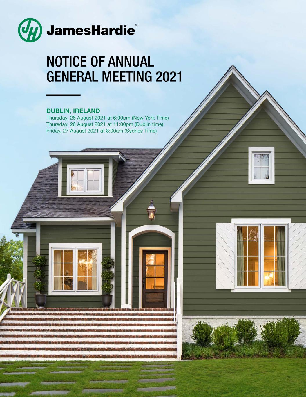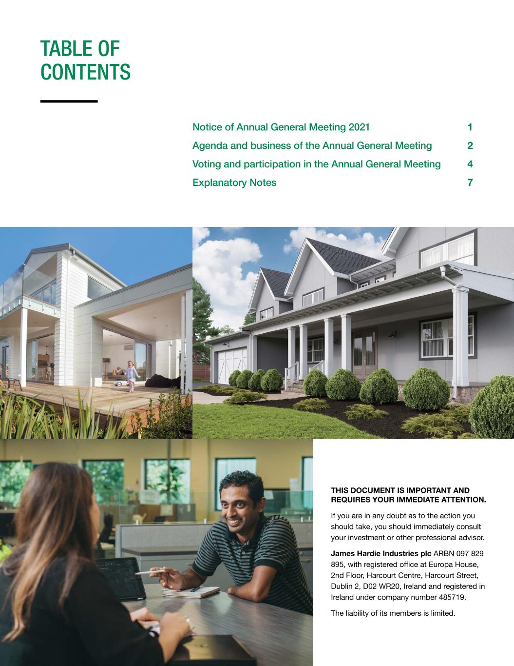 2 TABLE OF CONTENTS THIS DOCUMENT IS IMPORTANT AND REQUIRES YOUR IMMEDIATE ATTENTION. If you are in any doubt as to the action you should take, you should immediately consult your investment or other professional advisor. James Hardie Industries plc ARBN 097 829 895, with registered office at Europa House, 2nd Floor, Harcourt Centre, Harcourt Street, Dublin 2, D02 WR20, Ireland and registered in Ireland under company number 485719. The liability of its members is limited. Notice of Annual General Meeting 2021 1 Agenda and business of the Annual General Meeting 2 Voting and participation in the Annual General Meeting 4 Explanatory Notes 7