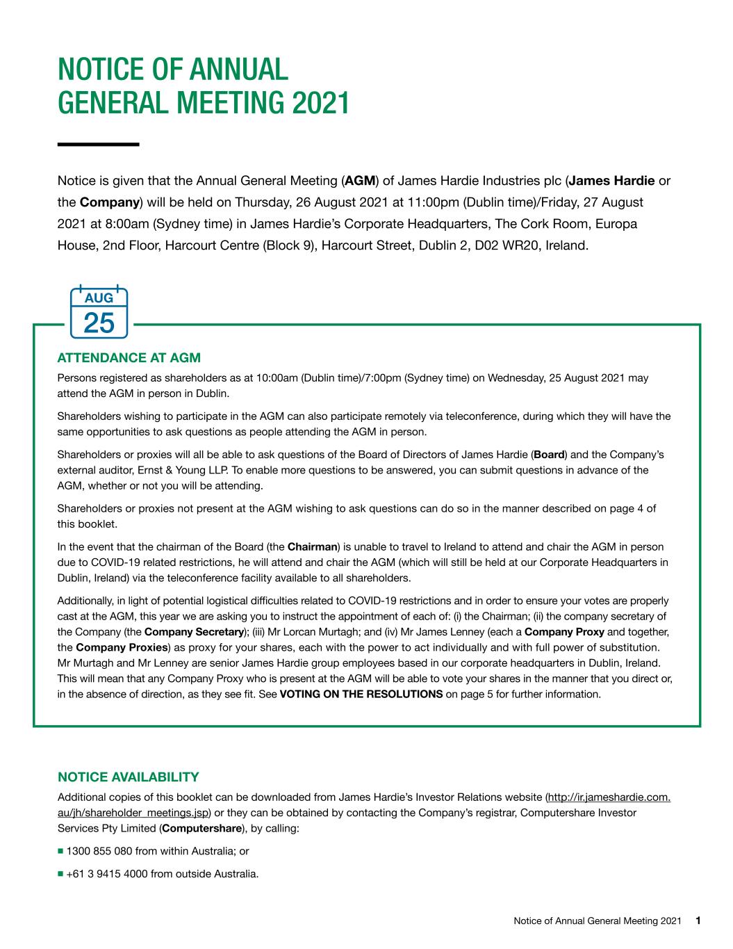 Notice of Annual General Meeting 2021 1 NOTICE OF ANNUAL GENERAL MEETING 2021 Notice is given that the Annual General Meeting (AGM) of James Hardie Industries plc (James Hardie or the Company) will be held on Thursday, 26 August 2021 at 11:00pm (Dublin time)/Friday, 27 August 2021 at 8:00am (Sydney time) in James Hardie’s Corporate Headquarters, The Cork Room, Europa House, 2nd Floor, Harcourt Centre (Block 9), Harcourt Street, Dublin 2, D02 WR20, Ireland. ATTENDANCE AT AGM Persons registered as shareholders as at 10:00am (Dublin time)/7:00pm (Sydney time) on Wednesday, 25 August 2021 may attend the AGM in person in Dublin. Shareholders wishing to participate in the AGM can also participate remotely via teleconference, during which they will have the same opportunities to ask questions as people attending the AGM in person. Shareholders or proxies will all be able to ask questions of the Board of Directors of James Hardie (Board) and the Company’s external auditor, Ernst & Young LLP. To enable more questions to be answered, you can submit questions in advance of the AGM, whether or not you will be attending. Shareholders or proxies not present at the AGM wishing to ask questions can do so in the manner described on page 4 of this booklet. In the event that the chairman of the Board (the Chairman) is unable to travel to Ireland to attend and chair the AGM in person due to COVID-19 related restrictions, he will attend and chair the AGM (which will still be held at our Corporate Headquarters in Dublin, Ireland) via the teleconference facility available to all shareholders. Additionally, in light of potential logistical difficulties related to COVID-19 restrictions and in order to ensure your votes are properly cast at the AGM, this year we are asking you to instruct the appointment of each of: (i) the Chairman; (ii) the company secretary of the Company (the Company Secretary); (iii) Mr Lorcan Murtagh; and (iv) Mr James Lenney (each a Company Proxy and together, the Company Proxies) as proxy for your shares, each with the power to act individually and with full power of substitution. Mr Murtagh and Mr Lenney are senior James Hardie group employees based in our corporate headquarters in Dublin, Ireland. This will mean that any Company Proxy who is present at the AGM will be able to vote your shares in the manner that you direct or, in the absence of direction, as they see fit. See VOTING ON THE RESOLUTIONS on page 5 for further information. NOTICE AVAILABILITY Additional copies of this booklet can be downloaded from James Hardie’s Investor Relations website (http://ir.jameshardie.com. au/jh/shareholder_meetings.jsp) or they can be obtained by contacting the Company’s registrar, Computershare Investor Services Pty Limited (Computershare), by calling: ■ 1300 855 080 from within Australia; or ■ +61 3 9415 4000 from outside Australia. 25 AUG