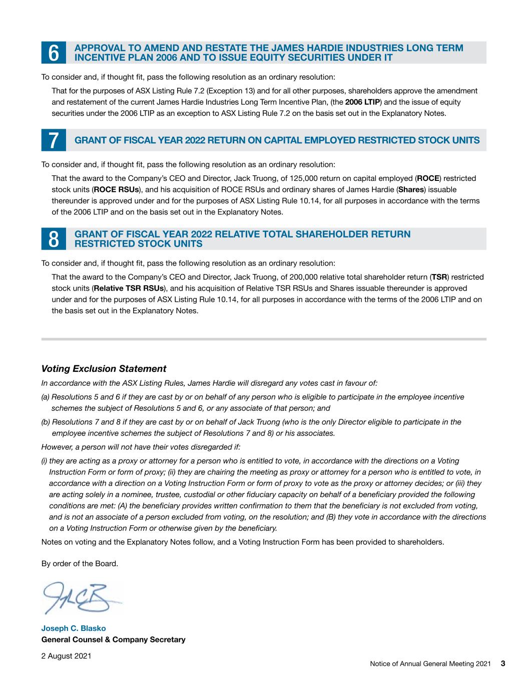 Notice of Annual General Meeting 2021 3 Voting Exclusion Statement In accordance with the ASX Listing Rules, James Hardie will disregard any votes cast in favour of: (a) Resolutions 5 and 6 if they are cast by or on behalf of any person who is eligible to participate in the employee incentive schemes the subject of Resolutions 5 and 6, or any associate of that person; and (b) Resolutions 7 and 8 if they are cast by or on behalf of Jack Truong (who is the only Director eligible to participate in the employee incentive schemes the subject of Resolutions 7 and 8) or his associates. However, a person will not have their votes disregarded if: (i) they are acting as a proxy or attorney for a person who is entitled to vote, in accordance with the directions on a Voting Instruction Form or form of proxy; (ii) they are chairing the meeting as proxy or attorney for a person who is entitled to vote, in accordance with a direction on a Voting Instruction Form or form of proxy to vote as the proxy or attorney decides; or (iii) they are acting solely in a nominee, trustee, custodial or other fiduciary capacity on behalf of a beneficiary provided the following conditions are met: (A) the beneficiary provides written confirmation to them that the beneficiary is not excluded from voting, and is not an associate of a person excluded from voting, on the resolution; and (B) they vote in accordance with the directions on a Voting Instruction Form or otherwise given by the beneficiary. Notes on voting and the Explanatory Notes follow, and a Voting Instruction Form has been provided to shareholders. By order of the Board. Joseph C. Blasko General Counsel & Company Secretary 2 August 2021 6 APPROVAL TO AMEND AND RESTATE THE JAMES HARDIE INDUSTRIES LONG TERM INCENTIVE PLAN 2006 AND TO ISSUE EQUITY SECURITIES UNDER IT To consider and, if thought fit, pass the following resolution as an ordinary resolution: That for the purposes of ASX Listing Rule 7.2 (Exception 13) and for all other purposes, shareholders approve the amendment and restatement of the current James Hardie Industries Long Term Incentive Plan, (the 2006 LTIP) and the issue of equity securities under the 2006 LTIP as an exception to ASX Listing Rule 7.2 on the basis set out in the Explanatory Notes. 7 GRANT OF FISCAL YEAR 2022 RETURN ON CAPITAL EMPLOYED RESTRICTED STOCK UNITS To consider and, if thought fit, pass the following resolution as an ordinary resolution: That the award to the Company’s CEO and Director, Jack Truong, of 125,000 return on capital employed (ROCE) restricted stock units (ROCE RSUs), and his acquisition of ROCE RSUs and ordinary shares of James Hardie (Shares) issuable thereunder is approved under and for the purposes of ASX Listing Rule 10.14, for all purposes in accordance with the terms of the 2006 LTIP and on the basis set out in the Explanatory Notes. 8 GRANT OF FISCAL YEAR 2022 RELATIVE TOTAL SHAREHOLDER RETURN RESTRICTED STOCK UNITS To consider and, if thought fit, pass the following resolution as an ordinary resolution: That the award to the Company’s CEO and Director, Jack Truong, of 200,000 relative total shareholder return (TSR) restricted stock units (Relative TSR RSUs), and his acquisition of Relative TSR RSUs and Shares issuable thereunder is approved under and for the purposes of ASX Listing Rule 10.14, for all purposes in accordance with the terms of the 2006 LTIP and on the basis set out in the Explanatory Notes.
