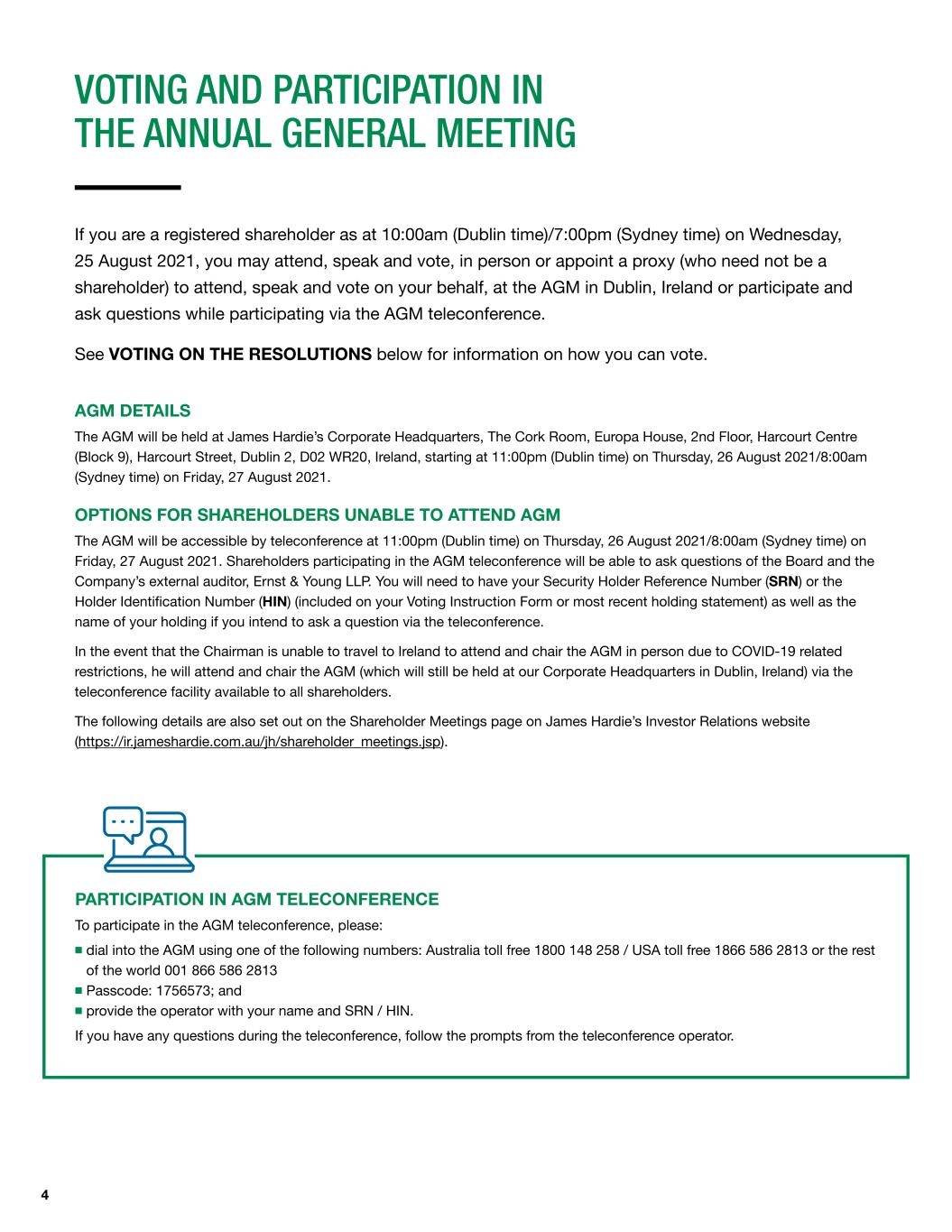 4 VOTING AND PARTICIPATION IN THE ANNUAL GENERAL MEETING If you are a registered shareholder as at 10:00am (Dublin time)/7:00pm (Sydney time) on Wednesday, 25 August 2021, you may attend, speak and vote, in person or appoint a proxy (who need not be a shareholder) to attend, speak and vote on your behalf, at the AGM in Dublin, Ireland or participate and ask questions while participating via the AGM teleconference. See VOTING ON THE RESOLUTIONS below for information on how you can vote. AGM DETAILS The AGM will be held at James Hardie’s Corporate Headquarters, The Cork Room, Europa House, 2nd Floor, Harcourt Centre (Block 9), Harcourt Street, Dublin 2, D02 WR20, Ireland, starting at 11:00pm (Dublin time) on Thursday, 26 August 2021/8:00am (Sydney time) on Friday, 27 August 2021. OPTIONS FOR SHAREHOLDERS UNABLE TO ATTEND AGM The AGM will be accessible by teleconference at 11:00pm (Dublin time) on Thursday, 26 August 2021/8:00am (Sydney time) on Friday, 27 August 2021. Shareholders participating in the AGM teleconference will be able to ask questions of the Board and the Company’s external auditor, Ernst & Young LLP. You will need to have your Security Holder Reference Number (SRN) or the Holder Identification Number (HIN) (included on your Voting Instruction Form or most recent holding statement) as well as the name of your holding if you intend to ask a question via the teleconference. In the event that the Chairman is unable to travel to Ireland to attend and chair the AGM in person due to COVID-19 related restrictions, he will attend and chair the AGM (which will still be held at our Corporate Headquarters in Dublin, Ireland) via the teleconference facility available to all shareholders. The following details are also set out on the Shareholder Meetings page on James Hardie’s Investor Relations website (https://ir.jameshardie.com.au/jh/shareholder_meetings.jsp). PARTICIPATION IN AGM TELECONFERENCE To participate in the AGM teleconference, please: ■ dial into the AGM using one of the following numbers: Australia toll free 1800 148 258 / USA toll free 1866 586 2813 or the rest of the world 001 866 586 2813 ■ Passcode: 1756573; and ■ provide the operator with your name and SRN / HIN. If you have any questions during the teleconference, follow the prompts from the teleconference operator.