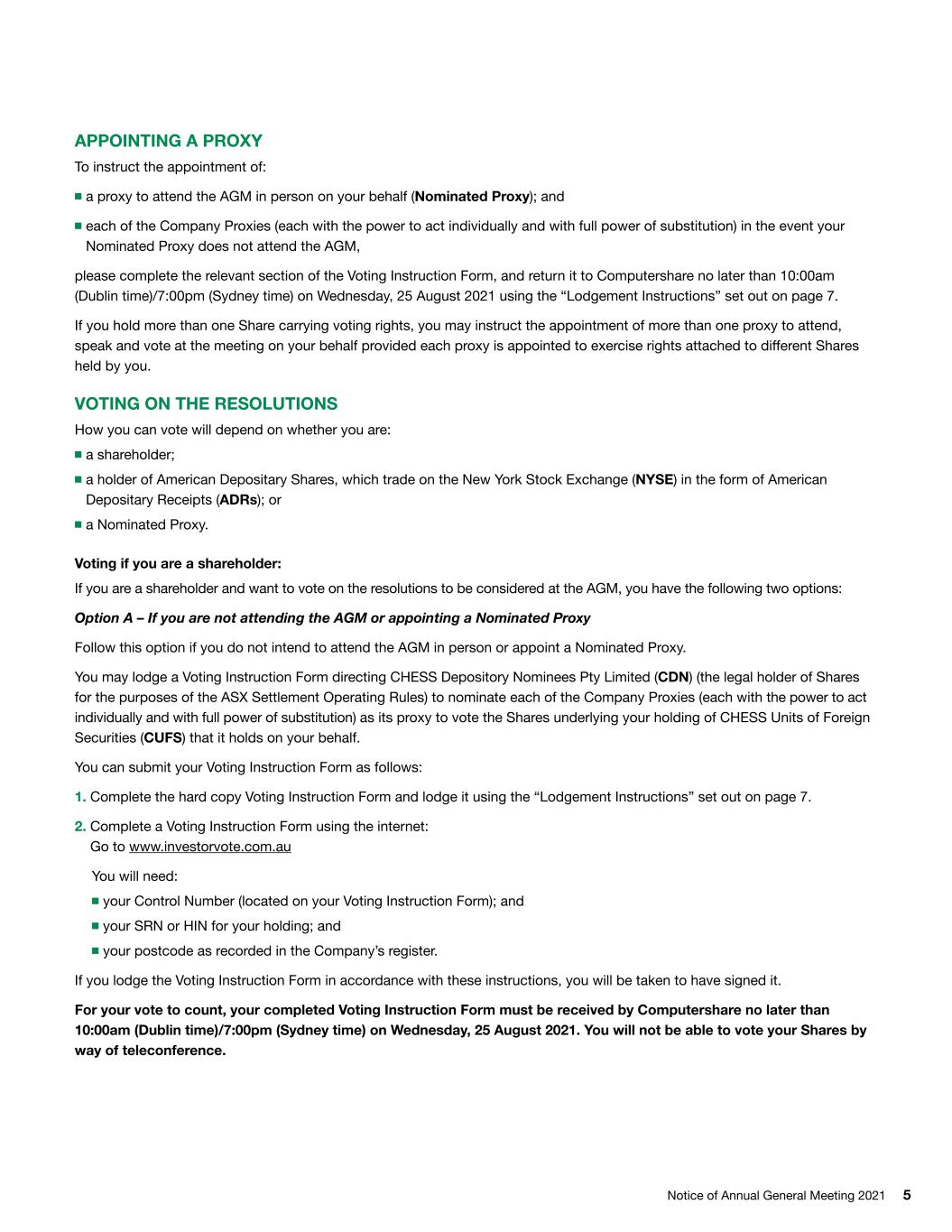 Notice of Annual General Meeting 2021 5 APPOINTING A PROXY To instruct the appointment of: ■ a proxy to attend the AGM in person on your behalf (Nominated Proxy); and ■ each of the Company Proxies (each with the power to act individually and with full power of substitution) in the event your Nominated Proxy does not attend the AGM, please complete the relevant section of the Voting Instruction Form, and return it to Computershare no later than 10:00am (Dublin time)/7:00pm (Sydney time) on Wednesday, 25 August 2021 using the “Lodgement Instructions” set out on page 7. If you hold more than one Share carrying voting rights, you may instruct the appointment of more than one proxy to attend, speak and vote at the meeting on your behalf provided each proxy is appointed to exercise rights attached to different Shares held by you. VOTING ON THE RESOLUTIONS How you can vote will depend on whether you are: ■ a shareholder; ■ a holder of American Depositary Shares, which trade on the New York Stock Exchange (NYSE) in the form of American Depositary Receipts (ADRs); or ■ a Nominated Proxy. Voting if you are a shareholder: If you are a shareholder and want to vote on the resolutions to be considered at the AGM, you have the following two options: Option A – If you are not attending the AGM or appointing a Nominated Proxy Follow this option if you do not intend to attend the AGM in person or appoint a Nominated Proxy. You may lodge a Voting Instruction Form directing CHESS Depository Nominees Pty Limited (CDN) (the legal holder of Shares for the purposes of the ASX Settlement Operating Rules) to nominate each of the Company Proxies (each with the power to act individually and with full power of substitution) as its proxy to vote the Shares underlying your holding of CHESS Units of Foreign Securities (CUFS) that it holds on your behalf. You can submit your Voting Instruction Form as follows: 1. Complete the hard copy Voting Instruction Form and lodge it using the “Lodgement Instructions” set out on page 7. 2. Complete a Voting Instruction Form using the internet: Go to www.investorvote.com.au You will need: ■ your Control Number (located on your Voting Instruction Form); and ■ your SRN or HIN for your holding; and ■ your postcode as recorded in the Company’s register. If you lodge the Voting Instruction Form in accordance with these instructions, you will be taken to have signed it. For your vote to count, your completed Voting Instruction Form must be received by Computershare no later than 10:00am (Dublin time)/7:00pm (Sydney time) on Wednesday, 25 August 2021. You will not be able to vote your Shares by way of teleconference.