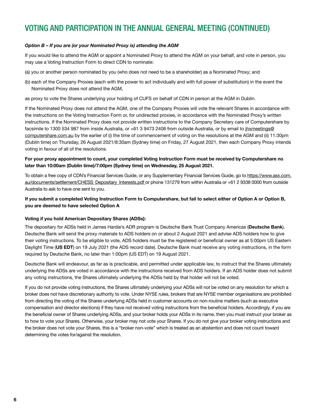 6 VOTING AND PARTICIPATION IN THE ANNUAL GENERAL MEETING (CONTINUED) Option B – If you are (or your Nominated Proxy is) attending the AGM If you would like to attend the AGM or appoint a Nominated Proxy to attend the AGM on your behalf, and vote in person, you may use a Voting Instruction Form to direct CDN to nominate: (a) you or another person nominated by you (who does not need to be a shareholder) as a Nominated Proxy; and (b) each of the Company Proxies (each with the power to act individually and with full power of substitution) in the event the Nominated Proxy does not attend the AGM, as proxy to vote the Shares underlying your holding of CUFS on behalf of CDN in person at the AGM in Dublin. If the Nominated Proxy does not attend the AGM, one of the Company Proxies will vote the relevant Shares in accordance with the instructions on the Voting Instruction Form or, for undirected proxies, in accordance with the Nominated Proxy’s written instructions. If the Nominated Proxy does not provide written instructions to the Company Secretary care of Computershare by facsimile to 1300 534 987 from inside Australia, or +61 3 9473 2408 from outside Australia, or by email to jhxmeetings@ computershare.com.au by the earlier of (i) the time of commencement of voting on the resolutions at the AGM and (ii) 11:30pm (Dublin time) on Thursday, 26 August 2021/8:30am (Sydney time) on Friday, 27 August 2021, then each Company Proxy intends voting in favour of all of the resolutions. For your proxy appointment to count, your completed Voting Instruction Form must be received by Computershare no later than 10:00am (Dublin time)/7:00pm (Sydney time) on Wednesday, 25 August 2021. To obtain a free copy of CDN’s Financial Services Guide, or any Supplementary Financial Services Guide, go to https://www.asx.com. au/documents/settlement/CHESS_Depositary_Interests.pdf or phone 131279 from within Australia or +61 2 9338 0000 from outside Australia to ask to have one sent to you. If you submit a completed Voting Instruction Form to Computershare, but fail to select either of Option A or Option B, you are deemed to have selected Option A Voting if you hold American Depositary Shares (ADSs): The depositary for ADSs held in James Hardie’s ADR program is Deutsche Bank Trust Company Americas (Deutsche Bank). Deutsche Bank will send the proxy materials to ADS holders on or about 2 August 2021 and advise ADS holders how to give their voting instructions. To be eligible to vote, ADS holders must be the registered or beneficial owner as at 5:00pm US Eastern Daylight Time (US EDT) on 19 July 2021 (the ADS record date). Deutsche Bank must receive any voting instructions, in the form required by Deutsche Bank, no later than 1:00pm (US EDT) on 19 August 2021. Deutsche Bank will endeavour, as far as is practicable, and permitted under applicable law, to instruct that the Shares ultimately underlying the ADSs are voted in accordance with the instructions received from ADS holders. If an ADS holder does not submit any voting instructions, the Shares ultimately underlying the ADSs held by that holder will not be voted. If you do not provide voting instructions, the Shares ultimately underlying your ADSs will not be voted on any resolution for which a broker does not have discretionary authority to vote. Under NYSE rules, brokers that are NYSE member organisations are prohibited from directing the voting of the Shares underlying ADSs held in customer accounts on non-routine matters (such as executive compensation and director elections) if they have not received voting instructions from the beneficial holders. Accordingly, if you are the beneficial owner of Shares underlying ADSs, and your broker holds your ADSs in its name, then you must instruct your broker as to how to vote your Shares. Otherwise, your broker may not vote your Shares. If you do not give your broker voting instructions and the broker does not vote your Shares, this is a “broker non-vote” which is treated as an abstention and does not count toward determining the votes for/against the resolution.