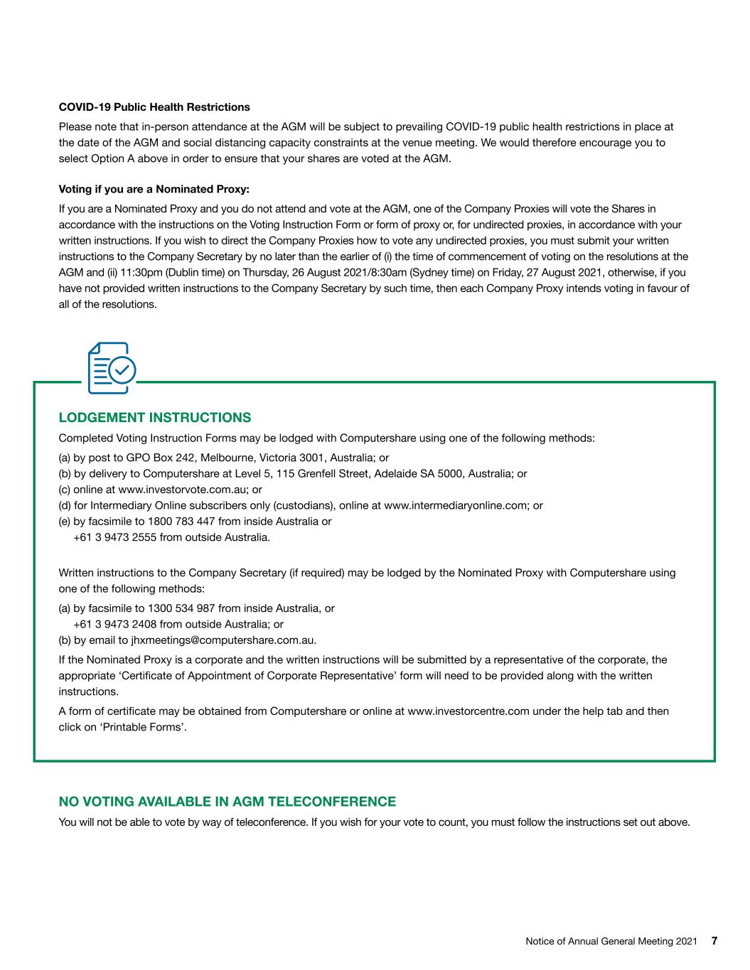 Notice of Annual General Meeting 2021 7 NO VOTING AVAILABLE IN AGM TELECONFERENCE You will not be able to vote by way of teleconference. If you wish for your vote to count, you must follow the instructions set out above. LODGEMENT INSTRUCTIONS Completed Voting Instruction Forms may be lodged with Computershare using one of the following methods: (a) by post to GPO Box 242, Melbourne, Victoria 3001, Australia; or (b) by delivery to Computershare at Level 5, 115 Grenfell Street, Adelaide SA 5000, Australia; or (c) online at www.investorvote.com.au; or (d) for Intermediary Online subscribers only (custodians), online at www.intermediaryonline.com; or (e) by facsimile to 1800 783 447 from inside Australia or +61 3 9473 2555 from outside Australia. Written instructions to the Company Secretary (if required) may be lodged by the Nominated Proxy with Computershare using one of the following methods: (a) by facsimile to 1300 534 987 from inside Australia, or +61 3 9473 2408 from outside Australia; or (b) by email to [email protected]. If the Nominated Proxy is a corporate and the written instructions will be submitted by a representative of the corporate, the appropriate ‘Certificate of Appointment of Corporate Representative’ form will need to be provided along with the written instructions. A form of certificate may be obtained from Computershare or online at www.investorcentre.com under the help tab and then click on ‘Printable Forms’. COVID-19 Public Health Restrictions Please note that in-person attendance at the AGM will be subject to prevailing COVID-19 public health restrictions in place at the date of the AGM and social distancing capacity constraints at the venue meeting. We would therefore encourage you to select Option A above in order to ensure that your shares are voted at the AGM. Voting if you are a Nominated Proxy: If you are a Nominated Proxy and you do not attend and vote at the AGM, one of the Company Proxies will vote the Shares in accordance with the instructions on the Voting Instruction Form or form of proxy or, for undirected proxies, in accordance with your written instructions. If you wish to direct the Company Proxies how to vote any undirected proxies, you must submit your written instructions to the Company Secretary by no later than the earlier of (i) the time of commencement of voting on the resolutions at the AGM and (ii) 11:30pm (Dublin time) on Thursday, 26 August 2021/8:30am (Sydney time) on Friday, 27 August 2021, otherwise, if you have not provided written instructions to the Company Secretary by such time, then each Company Proxy intends voting in favour of all of the resolutions.