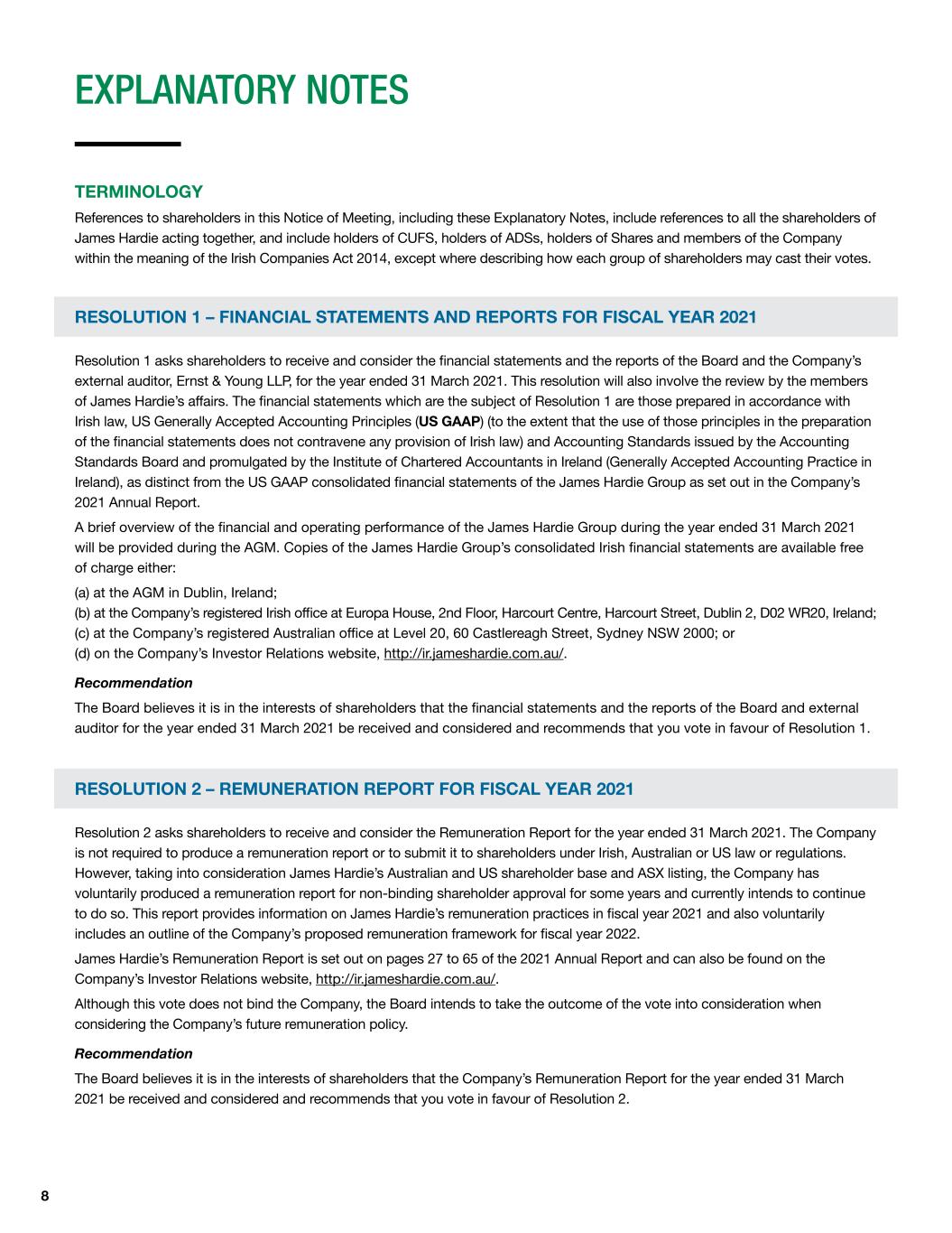 8 EXPLANATORY NOTES TERMINOLOGY References to shareholders in this Notice of Meeting, including these Explanatory Notes, include references to all the shareholders of James Hardie acting together, and include holders of CUFS, holders of ADSs, holders of Shares and members of the Company within the meaning of the Irish Companies Act 2014, except where describing how each group of shareholders may cast their votes. RESOLUTION 1 – FINANCIAL STATEMENTS AND REPORTS FOR FISCAL YEAR 2021 RESOLUTION 2 – REMUNERATION REPORT FOR FISCAL YEAR 2021 Resolution 1 asks shareholders to receive and consider the financial statements and the reports of the Board and the Company’s external auditor, Ernst & Young LLP, for the year ended 31 March 2021. This resolution will also involve the review by the members of James Hardie’s affairs. The financial statements which are the subject of Resolution 1 are those prepared in accordance with Irish law, US Generally Accepted Accounting Principles (US GAAP) (to the extent that the use of those principles in the preparation of the financial statements does not contravene any provision of Irish law) and Accounting Standards issued by the Accounting Standards Board and promulgated by the Institute of Chartered Accountants in Ireland (Generally Accepted Accounting Practice in Ireland), as distinct from the US GAAP consolidated financial statements of the James Hardie Group as set out in the Company’s 2021 Annual Report. A brief overview of the financial and operating performance of the James Hardie Group during the year ended 31 March 2021 will be provided during the AGM. Copies of the James Hardie Group’s consolidated Irish financial statements are available free of charge either: (a) at the AGM in Dublin, Ireland; (b) at the Company’s registered Irish office at Europa House, 2nd Floor, Harcourt Centre, Harcourt Street, Dublin 2, D02 WR20, Ireland; (c) at the Company’s registered Australian office at Level 20, 60 Castlereagh Street, Sydney NSW 2000; or (d) on the Company’s Investor Relations website, http://ir.jameshardie.com.au/. Recommendation The Board believes it is in the interests of shareholders that the financial statements and the reports of the Board and external auditor for the year ended 31 March 2021 be received and considered and recommends that you vote in favour of Resolution 1. Resolution 2 asks shareholders to receive and consider the Remuneration Report for the year ended 31 March 2021. The Company is not required to produce a remuneration report or to submit it to shareholders under Irish, Australian or US law or regulations. However, taking into consideration James Hardie’s Australian and US shareholder base and ASX listing, the Company has voluntarily produced a remuneration report for non-binding shareholder approval for some years and currently intends to continue to do so. This report provides information on James Hardie’s remuneration practices in fiscal year 2021 and also voluntarily includes an outline of the Company’s proposed remuneration framework for fiscal year 2022. James Hardie’s Remuneration Report is set out on pages 27 to 65 of the 2021 Annual Report and can also be found on the Company’s Investor Relations website, http://ir.jameshardie.com.au/. Although this vote does not bind the Company, the Board intends to take the outcome of the vote into consideration when considering the Company’s future remuneration policy. Recommendation The Board believes it is in the interests of shareholders that the Company’s Remuneration Report for the year ended 31 March 2021 be received and considered and recommends that you vote in favour of Resolution 2.