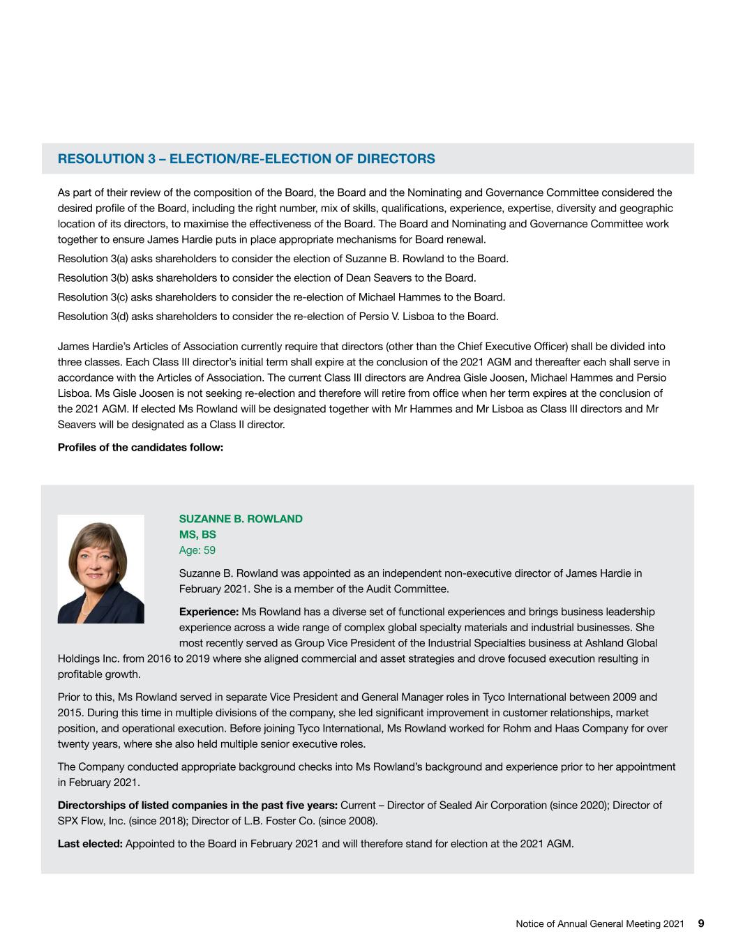 Notice of Annual General Meeting 2021 9 RESOLUTION 3 – ELECTION/RE-ELECTION OF DIRECTORS As part of their review of the composition of the Board, the Board and the Nominating and Governance Committee considered the desired profile of the Board, including the right number, mix of skills, qualifications, experience, expertise, diversity and geographic location of its directors, to maximise the effectiveness of the Board. The Board and Nominating and Governance Committee work together to ensure James Hardie puts in place appropriate mechanisms for Board renewal. Resolution 3(a) asks shareholders to consider the election of Suzanne B. Rowland to the Board. Resolution 3(b) asks shareholders to consider the election of Dean Seavers to the Board. Resolution 3(c) asks shareholders to consider the re-election of Michael Hammes to the Board. Resolution 3(d) asks shareholders to consider the re-election of Persio V. Lisboa to the Board. James Hardie’s Articles of Association currently require that directors (other than the Chief Executive Officer) shall be divided into three classes. Each Class III director’s initial term shall expire at the conclusion of the 2021 AGM and thereafter each shall serve in accordance with the Articles of Association. The current Class III directors are Andrea Gisle Joosen, Michael Hammes and Persio Lisboa. Ms Gisle Joosen is not seeking re-election and therefore will retire from office when her term expires at the conclusion of the 2021 AGM. If elected Ms Rowland will be designated together with Mr Hammes and Mr Lisboa as Class III directors and Mr Seavers will be designated as a Class II director. Profiles of the candidates follow: SUZANNE B. ROWLAND MS, BS Age: 59 Suzanne B. Rowland was appointed as an independent non-executive director of James Hardie in February 2021. She is a member of the Audit Committee. Experience: Ms Rowland has a diverse set of functional experiences and brings business leadership experience across a wide range of complex global specialty materials and industrial businesses. She most recently served as Group Vice President of the Industrial Specialties business at Ashland Global Holdings Inc. from 2016 to 2019 where she aligned commercial and asset strategies and drove focused execution resulting in profitable growth. Prior to this, Ms Rowland served in separate Vice President and General Manager roles in Tyco International between 2009 and 2015. During this time in multiple divisions of the company, she led significant improvement in customer relationships, market position, and operational execution. Before joining Tyco International, Ms Rowland worked for Rohm and Haas Company for over twenty years, where she also held multiple senior executive roles. The Company conducted appropriate background checks into Ms Rowland’s background and experience prior to her appointment in February 2021. Directorships of listed companies in the past five years: Current – Director of Sealed Air Corporation (since 2020); Director of SPX Flow, Inc. (since 2018); Director of L.B. Foster Co. (since 2008). Last elected: Appointed to the Board in February 2021 and will therefore stand for election at the 2021 AGM.