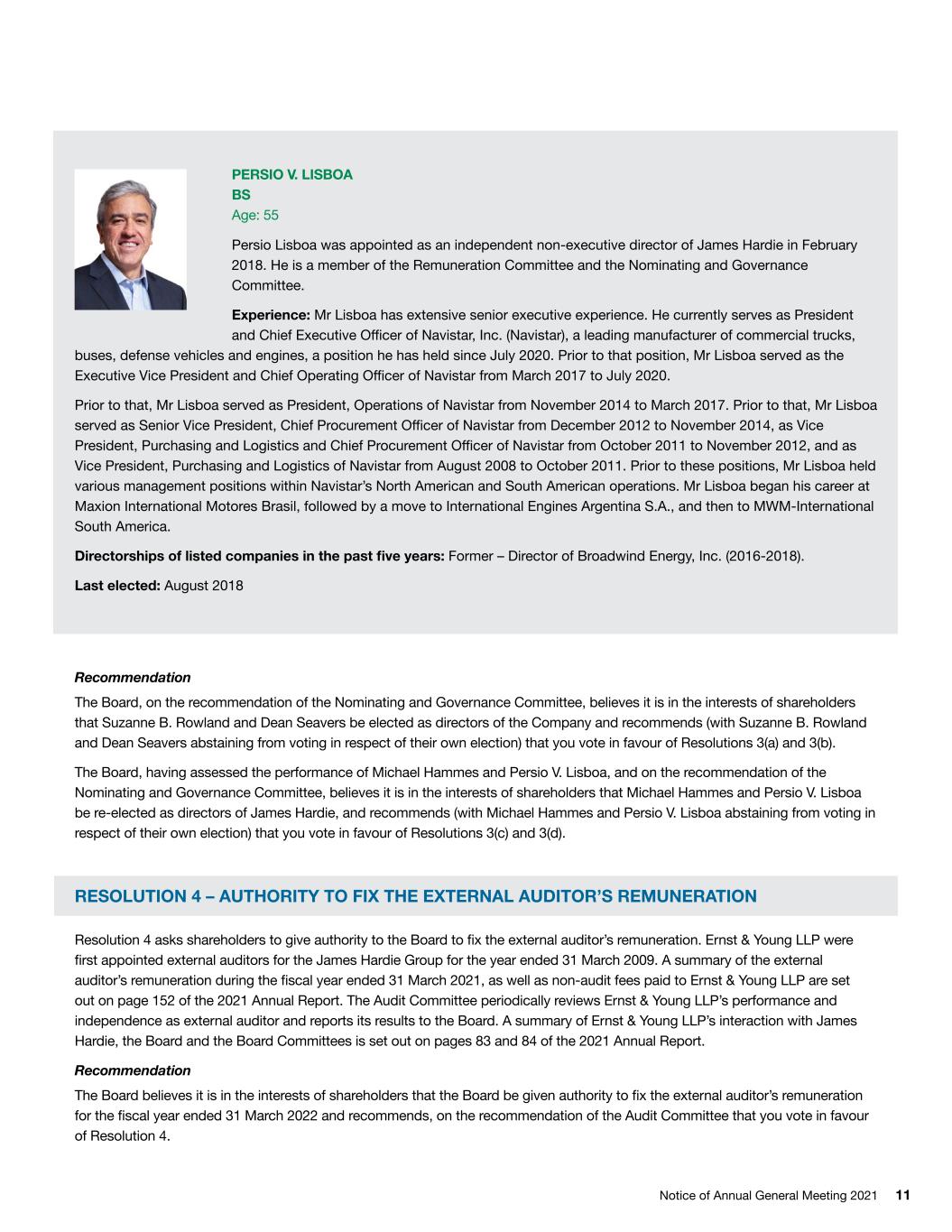 Notice of Annual General Meeting 2021 11 PERSIO V. LISBOA BS Age: 55 Persio Lisboa was appointed as an independent non-executive director of James Hardie in February 2018. He is a member of the Remuneration Committee and the Nominating and Governance Committee. Experience: Mr Lisboa has extensive senior executive experience. He currently serves as President and Chief Executive Officer of Navistar, Inc. (Navistar), a leading manufacturer of commercial trucks, buses, defense vehicles and engines, a position he has held since July 2020. Prior to that position, Mr Lisboa served as the Executive Vice President and Chief Operating Officer of Navistar from March 2017 to July 2020. Prior to that, Mr Lisboa served as President, Operations of Navistar from November 2014 to March 2017. Prior to that, Mr Lisboa served as Senior Vice President, Chief Procurement Officer of Navistar from December 2012 to November 2014, as Vice President, Purchasing and Logistics and Chief Procurement Officer of Navistar from October 2011 to November 2012, and as Vice President, Purchasing and Logistics of Navistar from August 2008 to October 2011. Prior to these positions, Mr Lisboa held various management positions within Navistar’s North American and South American operations. Mr Lisboa began his career at Maxion International Motores Brasil, followed by a move to International Engines Argentina S.A., and then to MWM-International South America. Directorships of listed companies in the past five years: Former – Director of Broadwind Energy, Inc. (2016-2018). Last elected: August 2018 Recommendation The Board, on the recommendation of the Nominating and Governance Committee, believes it is in the interests of shareholders that Suzanne B. Rowland and Dean Seavers be elected as directors of the Company and recommends (with Suzanne B. Rowland and Dean Seavers abstaining from voting in respect of their own election) that you vote in favour of Resolutions 3(a) and 3(b). The Board, having assessed the performance of Michael Hammes and Persio V. Lisboa, and on the recommendation of the Nominating and Governance Committee, believes it is in the interests of shareholders that Michael Hammes and Persio V. Lisboa be re-elected as directors of James Hardie, and recommends (with Michael Hammes and Persio V. Lisboa abstaining from voting in respect of their own election) that you vote in favour of Resolutions 3(c) and 3(d). RESOLUTION 4 – AUTHORITY TO FIX THE EXTERNAL AUDITOR’S REMUNERATION Resolution 4 asks shareholders to give authority to the Board to fix the external auditor’s remuneration. Ernst & Young LLP were first appointed external auditors for the James Hardie Group for the year ended 31 March 2009. A summary of the external auditor’s remuneration during the fiscal year ended 31 March 2021, as well as non-audit fees paid to Ernst & Young LLP are set out on page 152 of the 2021 Annual Report. The Audit Committee periodically reviews Ernst & Young LLP’s performance and independence as external auditor and reports its results to the Board. A summary of Ernst & Young LLP’s interaction with James Hardie, the Board and the Board Committees is set out on pages 83 and 84 of the 2021 Annual Report. Recommendation The Board believes it is in the interests of shareholders that the Board be given authority to fix the external auditor’s remuneration for the fiscal year ended 31 March 2022 and recommends, on the recommendation of the Audit Committee that you vote in favour of Resolution 4.
