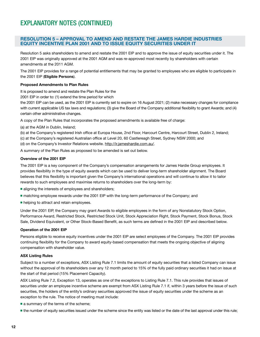 12 RESOLUTION 5 – APPROVAL TO AMEND AND RESTATE THE JAMES HARDIE INDUSTRIES EQUITY INCENTIVE PLAN 2001 AND TO ISSUE EQUITY SECURITIES UNDER IT Resolution 5 asks shareholders to amend and restate the 2001 EIP and to approve the issue of equity securities under it. The 2001 EIP was originally approved at the 2001 AGM and was re-approved most recently by shareholders with certain amendments at the 2011 AGM. The 2001 EIP provides for a range of potential entitlements that may be granted to employees who are eligible to participate in the 2001 EIP (Eligible Persons). Proposed Amendments to Plan Rules It is proposed to amend and restate the Plan Rules for the 2001 EIP in order to: (1) extend the time period for which the 2001 EIP can be used, as the 2001 EIP is currently set to expire on 16 August 2021; (2) make necessary changes for compliance with current applicable US tax laws and regulations; (3) give the Board of the Company additional flexibility to grant Awards; and (4) certain other administrative changes. A copy of the Plan Rules that incorporates the proposed amendments is available free of charge: (a) at the AGM in Dublin, Ireland; (b) at the Company’s registered Irish office at Europa House, 2nd Floor, Harcourt Centre, Harcourt Street, Dublin 2, Ireland; (c) at the Company’s registered Australian office at Level 20, 60 Castlereagh Street, Sydney NSW 2000; and (d) on the Company’s Investor Relations website. http://ir.jameshardie.com.au/. A summary of the Plan Rules as proposed to be amended is set out below. Overview of the 2001 EIP The 2001 EIP is a key component of the Company’s compensation arrangements for James Hardie Group employees. It provides flexibility in the type of equity awards which can be used to deliver long-term shareholder alignment. The Board believes that this flexibility is important given the Company’s international operations and will continue to allow it to tailor rewards to such employees and maximise returns to shareholders over the long-term by: ■ aligning the interests of employees and shareholders; ■ matching employee rewards under the 2001 EIP with the long-term performance of the Company; and ■ helping to attract and retain employees. Under the 2001 EIP, the Company may grant Awards to eligible employees in the form of any Nonstatutory Stock Option, Performance Award, Restricted Stock, Restricted Stock Unit, Stock Appreciation Right, Stock Payment, Stock Bonus, Stock Sale, Dividend Equivalent, or Other Stock-Based Benefit, as such terms are defined in the 2001 EIP and described below. Operation of the 2001 EIP Persons eligible to receive equity incentives under the 2001 EIP are select employees of the Company. The 2001 EIP provides continuing flexibility for the Company to award equity-based compensation that meets the ongoing objective of aligning compensation with shareholder value. ASX Listing Rules Subject to a number of exceptions, ASX Listing Rule 7.1 limits the amount of equity securities that a listed Company can issue without the approval of its shareholders over any 12 month period to 15% of the fully paid ordinary securities it had on issue at the start of that period (15% Placement Capacity). ASX Listing Rule 7.2, Exception 13, operates as one of the exceptions to Listing Rule 7.1. This rule provides that issues of securities under an employee incentive scheme are exempt from ASX Listing Rule 7.1 if, within 3 years before the issue of such securities, the holders of the entity’s ordinary securities approved the issue of equity securities under the scheme as an exception to the rule. The notice of meeting must include: ■ a summary of the terms of the scheme; ■ the number of equity securities issued under the scheme since the entity was listed or the date of the last approval under this rule; EXPLANATORY NOTES (CONTINUED)