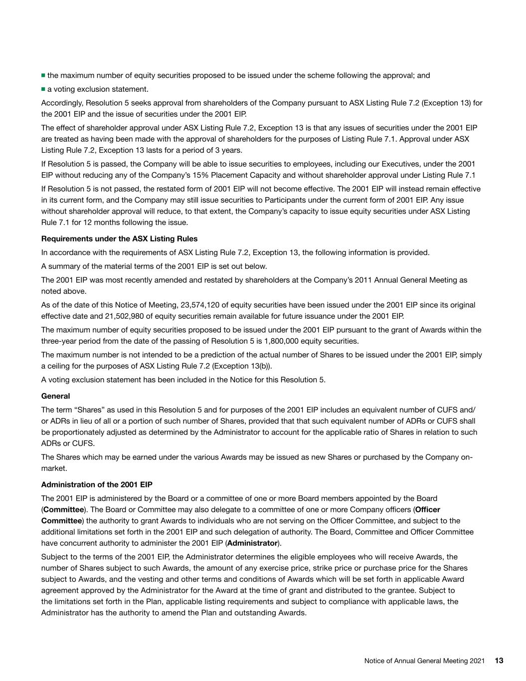 Notice of Annual General Meeting 2021 13 ■ the maximum number of equity securities proposed to be issued under the scheme following the approval; and ■ a voting exclusion statement. Accordingly, Resolution 5 seeks approval from shareholders of the Company pursuant to ASX Listing Rule 7.2 (Exception 13) for the 2001 EIP and the issue of securities under the 2001 EIP. The effect of shareholder approval under ASX Listing Rule 7.2, Exception 13 is that any issues of securities under the 2001 EIP are treated as having been made with the approval of shareholders for the purposes of Listing Rule 7.1. Approval under ASX Listing Rule 7.2, Exception 13 lasts for a period of 3 years. If Resolution 5 is passed, the Company will be able to issue securities to employees, including our Executives, under the 2001 EIP without reducing any of the Company’s 15% Placement Capacity and without shareholder approval under Listing Rule 7.1 If Resolution 5 is not passed, the restated form of 2001 EIP will not become effective. The 2001 EIP will instead remain effective in its current form, and the Company may still issue securities to Participants under the current form of 2001 EIP. Any issue without shareholder approval will reduce, to that extent, the Company’s capacity to issue equity securities under ASX Listing Rule 7.1 for 12 months following the issue. Requirements under the ASX Listing Rules In accordance with the requirements of ASX Listing Rule 7.2, Exception 13, the following information is provided. A summary of the material terms of the 2001 EIP is set out below. The 2001 EIP was most recently amended and restated by shareholders at the Company’s 2011 Annual General Meeting as noted above. As of the date of this Notice of Meeting, 23,574,120 of equity securities have been issued under the 2001 EIP since its original effective date and 21,502,980 of equity securities remain available for future issuance under the 2001 EIP. The maximum number of equity securities proposed to be issued under the 2001 EIP pursuant to the grant of Awards within the three-year period from the date of the passing of Resolution 5 is 1,800,000 equity securities. The maximum number is not intended to be a prediction of the actual number of Shares to be issued under the 2001 EIP, simply a ceiling for the purposes of ASX Listing Rule 7.2 (Exception 13(b)). A voting exclusion statement has been included in the Notice for this Resolution 5. General The term “Shares” as used in this Resolution 5 and for purposes of the 2001 EIP includes an equivalent number of CUFS and/ or ADRs in lieu of all or a portion of such number of Shares, provided that that such equivalent number of ADRs or CUFS shall be proportionately adjusted as determined by the Administrator to account for the applicable ratio of Shares in relation to such ADRs or CUFS. The Shares which may be earned under the various Awards may be issued as new Shares or purchased by the Company on- market. Administration of the 2001 EIP The 2001 EIP is administered by the Board or a committee of one or more Board members appointed by the Board (Committee). The Board or Committee may also delegate to a committee of one or more Company officers (Officer Committee) the authority to grant Awards to individuals who are not serving on the Officer Committee, and subject to the additional limitations set forth in the 2001 EIP and such delegation of authority. The Board, Committee and Officer Committee have concurrent authority to administer the 2001 EIP (Administrator). Subject to the terms of the 2001 EIP, the Administrator determines the eligible employees who will receive Awards, the number of Shares subject to such Awards, the amount of any exercise price, strike price or purchase price for the Shares subject to Awards, and the vesting and other terms and conditions of Awards which will be set forth in applicable Award agreement approved by the Administrator for the Award at the time of grant and distributed to the grantee. Subject to the limitations set forth in the Plan, applicable listing requirements and subject to compliance with applicable laws, the Administrator has the authority to amend the Plan and outstanding Awards.