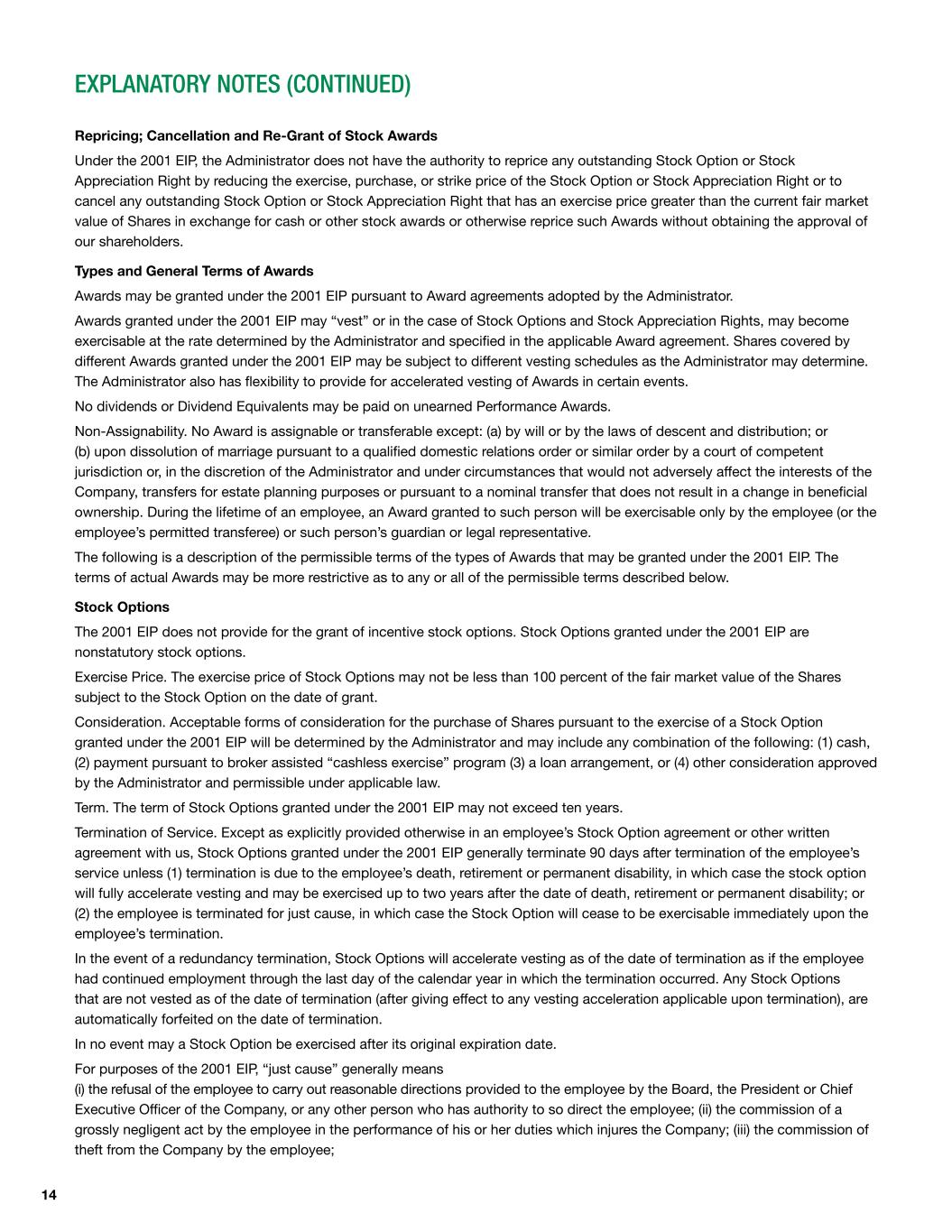 14 Repricing; Cancellation and Re-Grant of Stock Awards Under the 2001 EIP, the Administrator does not have the authority to reprice any outstanding Stock Option or Stock Appreciation Right by reducing the exercise, purchase, or strike price of the Stock Option or Stock Appreciation Right or to cancel any outstanding Stock Option or Stock Appreciation Right that has an exercise price greater than the current fair market value of Shares in exchange for cash or other stock awards or otherwise reprice such Awards without obtaining the approval of our shareholders. Types and General Terms of Awards Awards may be granted under the 2001 EIP pursuant to Award agreements adopted by the Administrator. Awards granted under the 2001 EIP may “vest” or in the case of Stock Options and Stock Appreciation Rights, may become exercisable at the rate determined by the Administrator and specified in the applicable Award agreement. Shares covered by different Awards granted under the 2001 EIP may be subject to different vesting schedules as the Administrator may determine. The Administrator also has flexibility to provide for accelerated vesting of Awards in certain events. No dividends or Dividend Equivalents may be paid on unearned Performance Awards. Non-Assignability. No Award is assignable or transferable except: (a) by will or by the laws of descent and distribution; or (b) upon dissolution of marriage pursuant to a qualified domestic relations order or similar order by a court of competent jurisdiction or, in the discretion of the Administrator and under circumstances that would not adversely affect the interests of the Company, transfers for estate planning purposes or pursuant to a nominal transfer that does not result in a change in beneficial ownership. During the lifetime of an employee, an Award granted to such person will be exercisable only by the employee (or the employee’s permitted transferee) or such person’s guardian or legal representative. The following is a description of the permissible terms of the types of Awards that may be granted under the 2001 EIP. The terms of actual Awards may be more restrictive as to any or all of the permissible terms described below. Stock Options The 2001 EIP does not provide for the grant of incentive stock options. Stock Options granted under the 2001 EIP are nonstatutory stock options. Exercise Price. The exercise price of Stock Options may not be less than 100 percent of the fair market value of the Shares subject to the Stock Option on the date of grant. Consideration. Acceptable forms of consideration for the purchase of Shares pursuant to the exercise of a Stock Option granted under the 2001 EIP will be determined by the Administrator and may include any combination of the following: (1) cash, (2) payment pursuant to broker assisted “cashless exercise” program (3) a loan arrangement, or (4) other consideration approved by the Administrator and permissible under applicable law. Term. The term of Stock Options granted under the 2001 EIP may not exceed ten years. Termination of Service. Except as explicitly provided otherwise in an employee’s Stock Option agreement or other written agreement with us, Stock Options granted under the 2001 EIP generally terminate 90 days after termination of the employee’s service unless (1) termination is due to the employee’s death, retirement or permanent disability, in which case the stock option will fully accelerate vesting and may be exercised up to two years after the date of death, retirement or permanent disability; or (2) the employee is terminated for just cause, in which case the Stock Option will cease to be exercisable immediately upon the employee’s termination. In the event of a redundancy termination, Stock Options will accelerate vesting as of the date of termination as if the employee had continued employment through the last day of the calendar year in which the termination occurred. Any Stock Options that are not vested as of the date of termination (after giving effect to any vesting acceleration applicable upon termination), are automatically forfeited on the date of termination. In no event may a Stock Option be exercised after its original expiration date. For purposes of the 2001 EIP, “just cause” generally means (i) the refusal of the employee to carry out reasonable directions provided to the employee by the Board, the President or Chief Executive Officer of the Company, or any other person who has authority to so direct the employee; (ii) the commission of a grossly negligent act by the employee in the performance of his or her duties which injures the Company; (iii) the commission of theft from the Company by the employee; EXPLANATORY NOTES (CONTINUED)
