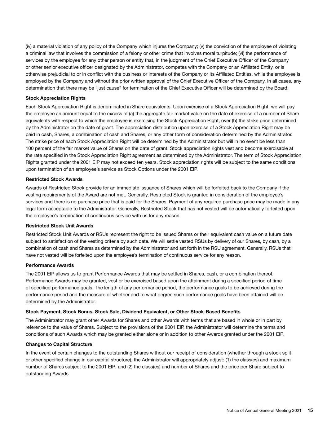 Notice of Annual General Meeting 2021 15 (iv) a material violation of any policy of the Company which injures the Company; (v) the conviction of the employee of violating a criminal law that involves the commission of a felony or other crime that involves moral turpitude; (vi) the performance of services by the employee for any other person or entity that, in the judgment of the Chief Executive Officer of the Company or other senior executive officer designated by the Administrator, competes with the Company or an Affiliated Entity, or is otherwise prejudicial to or in conflict with the business or interests of the Company or its Affiliated Entities, while the employee is employed by the Company and without the prior written approval of the Chief Executive Officer of the Company. In all cases, any determination that there may be “just cause” for termination of the Chief Executive Officer will be determined by the Board. Stock Appreciation Rights Each Stock Appreciation Right is denominated in Share equivalents. Upon exercise of a Stock Appreciation Right, we will pay the employee an amount equal to the excess of (a) the aggregate fair market value on the date of exercise of a number of Share equivalents with respect to which the employee is exercising the Stock Appreciation Right, over (b) the strike price determined by the Administrator on the date of grant. The appreciation distribution upon exercise of a Stock Appreciation Right may be paid in cash, Shares, a combination of cash and Shares, or any other form of consideration determined by the Administrator. The strike price of each Stock Appreciation Right will be determined by the Administrator but will in no event be less than 100 percent of the fair market value of Shares on the date of grant. Stock appreciation rights vest and become exercisable at the rate specified in the Stock Appreciation Right agreement as determined by the Administrator. The term of Stock Appreciation Rights granted under the 2001 EIP may not exceed ten years. Stock appreciation rights will be subject to the same conditions upon termination of an employee’s service as Stock Options under the 2001 EIP. Restricted Stock Awards Awards of Restricted Stock provide for an immediate issuance of Shares which will be forfeited back to the Company if the vesting requirements of the Award are not met. Generally, Restricted Stock is granted in consideration of the employee’s services and there is no purchase price that is paid for the Shares. Payment of any required purchase price may be made in any legal form acceptable to the Administrator. Generally, Restricted Stock that has not vested will be automatically forfeited upon the employee’s termination of continuous service with us for any reason. Restricted Stock Unit Awards Restricted Stock Unit Awards or RSUs represent the right to be issued Shares or their equivalent cash value on a future date subject to satisfaction of the vesting criteria by such date. We will settle vested RSUs by delivery of our Shares, by cash, by a combination of cash and Shares as determined by the Administrator and set forth in the RSU agreement. Generally, RSUs that have not vested will be forfeited upon the employee’s termination of continuous service for any reason. Performance Awards The 2001 EIP allows us to grant Performance Awards that may be settled in Shares, cash, or a combination thereof. Performance Awards may be granted, vest or be exercised based upon the attainment during a specified period of time of specified performance goals. The length of any performance period, the performance goals to be achieved during the performance period and the measure of whether and to what degree such performance goals have been attained will be determined by the Administrator. Stock Payment, Stock Bonus, Stock Sale, Dividend Equivalent, or Other Stock-Based Benefits The Administrator may grant other Awards for Shares and other Awards with terms that are based in whole or in part by reference to the value of Shares. Subject to the provisions of the 2001 EIP, the Administrator will determine the terms and conditions of such Awards which may be granted either alone or in addition to other Awards granted under the 2001 EIP. Changes to Capital Structure In the event of certain changes to the outstanding Shares without our receipt of consideration (whether through a stock split or other specified change in our capital structure), the Administrator will appropriately adjust: (1) the class(es) and maximum number of Shares subject to the 2001 EIP; and (2) the class(es) and number of Shares and the price per Share subject to outstanding Awards.