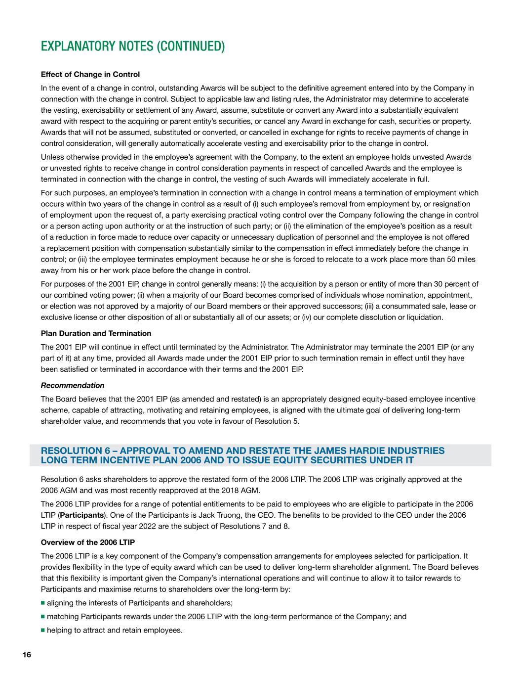 16 Effect of Change in Control In the event of a change in control, outstanding Awards will be subject to the definitive agreement entered into by the Company in connection with the change in control. Subject to applicable law and listing rules, the Administrator may determine to accelerate the vesting, exercisability or settlement of any Award, assume, substitute or convert any Award into a substantially equivalent award with respect to the acquiring or parent entity’s securities, or cancel any Award in exchange for cash, securities or property. Awards that will not be assumed, substituted or converted, or cancelled in exchange for rights to receive payments of change in control consideration, will generally automatically accelerate vesting and exercisability prior to the change in control. Unless otherwise provided in the employee’s agreement with the Company, to the extent an employee holds unvested Awards or unvested rights to receive change in control consideration payments in respect of cancelled Awards and the employee is terminated in connection with the change in control, the vesting of such Awards will immediately accelerate in full. For such purposes, an employee’s termination in connection with a change in control means a termination of employment which occurs within two years of the change in control as a result of (i) such employee’s removal from employment by, or resignation of employment upon the request of, a party exercising practical voting control over the Company following the change in control or a person acting upon authority or at the instruction of such party; or (ii) the elimination of the employee’s position as a result of a reduction in force made to reduce over capacity or unnecessary duplication of personnel and the employee is not offered a replacement position with compensation substantially similar to the compensation in effect immediately before the change in control; or (iii) the employee terminates employment because he or she is forced to relocate to a work place more than 50 miles away from his or her work place before the change in control. For purposes of the 2001 EIP, change in control generally means: (i) the acquisition by a person or entity of more than 30 percent of our combined voting power; (ii) when a majority of our Board becomes comprised of individuals whose nomination, appointment, or election was not approved by a majority of our Board members or their approved successors; (iii) a consummated sale, lease or exclusive license or other disposition of all or substantially all of our assets; or (iv) our complete dissolution or liquidation. Plan Duration and Termination The 2001 EIP will continue in effect until terminated by the Administrator. The Administrator may terminate the 2001 EIP (or any part of it) at any time, provided all Awards made under the 2001 EIP prior to such termination remain in effect until they have been satisfied or terminated in accordance with their terms and the 2001 EIP. Recommendation The Board believes that the 2001 EIP (as amended and restated) is an appropriately designed equity-based employee incentive scheme, capable of attracting, motivating and retaining employees, is aligned with the ultimate goal of delivering long-term shareholder value, and recommends that you vote in favour of Resolution 5. EXPLANATORY NOTES (CONTINUED) RESOLUTION 6 – APPROVAL TO AMEND AND RESTATE THE JAMES HARDIE INDUSTRIES LONG TERM INCENTIVE PLAN 2006 AND TO ISSUE EQUITY SECURITIES UNDER IT Resolution 6 asks shareholders to approve the restated form of the 2006 LTIP. The 2006 LTIP was originally approved at the 2006 AGM and was most recently reapproved at the 2018 AGM. The 2006 LTIP provides for a range of potential entitlements to be paid to employees who are eligible to participate in the 2006 LTIP (Participants). One of the Participants is Jack Truong, the CEO. The benefits to be provided to the CEO under the 2006 LTIP in respect of fiscal year 2022 are the subject of Resolutions 7 and 8. Overview of the 2006 LTIP The 2006 LTIP is a key component of the Company’s compensation arrangements for employees selected for participation. It provides flexibility in the type of equity award which can be used to deliver long-term shareholder alignment. The Board believes that this flexibility is important given the Company’s international operations and will continue to allow it to tailor rewards to Participants and maximise returns to shareholders over the long-term by: ■ aligning the interests of Participants and shareholders; ■ matching Participants rewards under the 2006 LTIP with the long-term performance of the Company; and ■ helping to attract and retain employees.