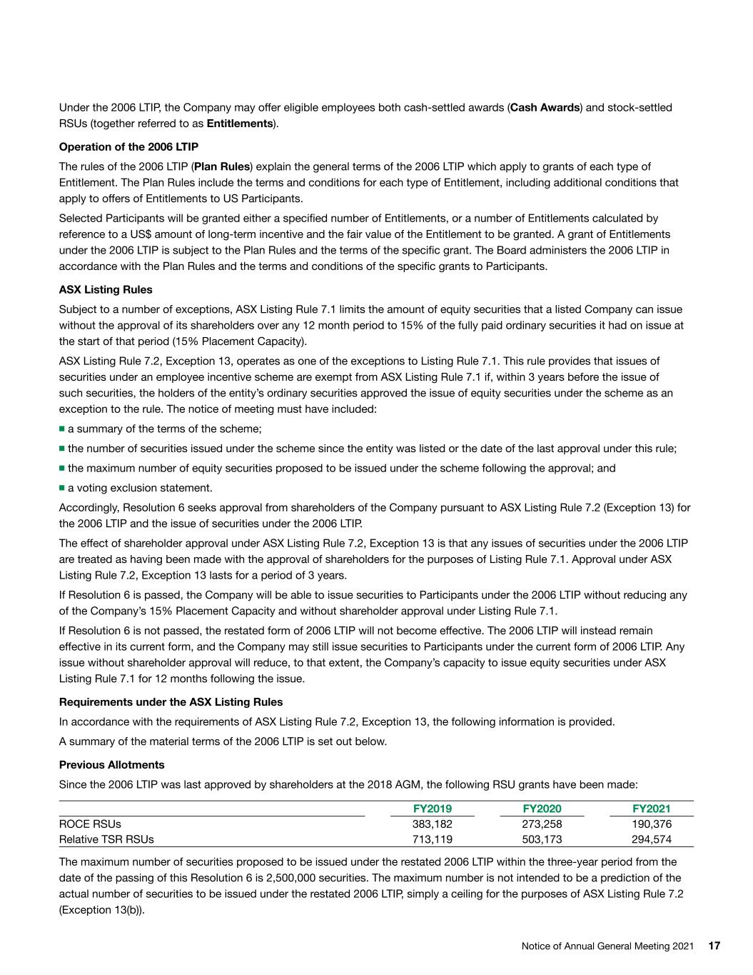 Notice of Annual General Meeting 2021 17 Under the 2006 LTIP, the Company may offer eligible employees both cash-settled awards (Cash Awards) and stock-settled RSUs (together referred to as Entitlements). Operation of the 2006 LTIP The rules of the 2006 LTIP (Plan Rules) explain the general terms of the 2006 LTIP which apply to grants of each type of Entitlement. The Plan Rules include the terms and conditions for each type of Entitlement, including additional conditions that apply to offers of Entitlements to US Participants. Selected Participants will be granted either a specified number of Entitlements, or a number of Entitlements calculated by reference to a US$ amount of long-term incentive and the fair value of the Entitlement to be granted. A grant of Entitlements under the 2006 LTIP is subject to the Plan Rules and the terms of the specific grant. The Board administers the 2006 LTIP in accordance with the Plan Rules and the terms and conditions of the specific grants to Participants. ASX Listing Rules Subject to a number of exceptions, ASX Listing Rule 7.1 limits the amount of equity securities that a listed Company can issue without the approval of its shareholders over any 12 month period to 15% of the fully paid ordinary securities it had on issue at the start of that period (15% Placement Capacity). ASX Listing Rule 7.2, Exception 13, operates as one of the exceptions to Listing Rule 7.1. This rule provides that issues of securities under an employee incentive scheme are exempt from ASX Listing Rule 7.1 if, within 3 years before the issue of such securities, the holders of the entity’s ordinary securities approved the issue of equity securities under the scheme as an exception to the rule. The notice of meeting must have included: ■ a summary of the terms of the scheme; ■ the number of securities issued under the scheme since the entity was listed or the date of the last approval under this rule; ■ the maximum number of equity securities proposed to be issued under the scheme following the approval; and ■ a voting exclusion statement. Accordingly, Resolution 6 seeks approval from shareholders of the Company pursuant to ASX Listing Rule 7.2 (Exception 13) for the 2006 LTIP and the issue of securities under the 2006 LTIP. The effect of shareholder approval under ASX Listing Rule 7.2, Exception 13 is that any issues of securities under the 2006 LTIP are treated as having been made with the approval of shareholders for the purposes of Listing Rule 7.1. Approval under ASX Listing Rule 7.2, Exception 13 lasts for a period of 3 years. If Resolution 6 is passed, the Company will be able to issue securities to Participants under the 2006 LTIP without reducing any of the Company’s 15% Placement Capacity and without shareholder approval under Listing Rule 7.1. If Resolution 6 is not passed, the restated form of 2006 LTIP will not become effective. The 2006 LTIP will instead remain effective in its current form, and the Company may still issue securities to Participants under the current form of 2006 LTIP. Any issue without shareholder approval will reduce, to that extent, the Company’s capacity to issue equity securities under ASX Listing Rule 7.1 for 12 months following the issue. Requirements under the ASX Listing Rules In accordance with the requirements of ASX Listing Rule 7.2, Exception 13, the following information is provided. A summary of the material terms of the 2006 LTIP is set out below. Previous Allotments Since the 2006 LTIP was last approved by shareholders at the 2018 AGM, the following RSU grants have been made: FY2019 FY2020 FY2021 ROCE RSUs 383,182 273,258 190,376 Relative TSR RSUs 713,119 503,173 294,574 The maximum number of securities proposed to be issued under the restated 2006 LTIP within the three-year period from the date of the passing of this Resolution 6 is 2,500,000 securities. The maximum number is not intended to be a prediction of the actual number of securities to be issued under the restated 2006 LTIP, simply a ceiling for the purposes of ASX Listing Rule 7.2 (Exception 13(b)).