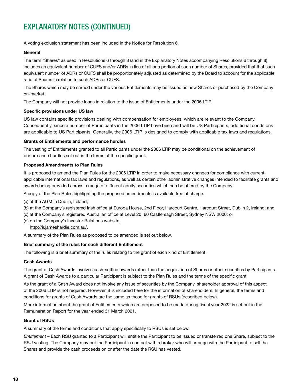 18 A voting exclusion statement has been included in the Notice for Resolution 6. General The term “Shares” as used in Resolutions 6 through 8 (and in the Explanatory Notes accompanying Resolutions 6 through 8) includes an equivalent number of CUFS and/or ADRs in lieu of all or a portion of such number of Shares, provided that that such equivalent number of ADRs or CUFS shall be proportionately adjusted as determined by the Board to account for the applicable ratio of Shares in relation to such ADRs or CUFS. The Shares which may be earned under the various Entitlements may be issued as new Shares or purchased by the Company on-market. The Company will not provide loans in relation to the issue of Entitlements under the 2006 LTIP. Specific provisions under US law US law contains specific provisions dealing with compensation for employees, which are relevant to the Company. Consequently, since a number of Participants in the 2006 LTIP have been and will be US Participants, additional conditions are applicable to US Participants. Generally, the 2006 LTIP is designed to comply with applicable tax laws and regulations. Grants of Entitlements and performance hurdles The vesting of Entitlements granted to all Participants under the 2006 LTIP may be conditional on the achievement of performance hurdles set out in the terms of the specific grant. Proposed Amendments to Plan Rules It is proposed to amend the Plan Rules for the 2006 LTIP in order to make necessary changes for compliance with current applicable international tax laws and regulations, as well as certain other administrative changes intended to facilitate grants and awards being provided across a range of different equity securities which can be offered by the Company. A copy of the Plan Rules highlighting the proposed amendments is available free of charge: (a) at the AGM in Dublin, Ireland; (b) at the Company’s registered Irish office at Europa House, 2nd Floor, Harcourt Centre, Harcourt Street, Dublin 2, Ireland; and (c) at the Company’s registered Australian office at Level 20, 60 Castlereagh Street, Sydney NSW 2000; or (d) on the Company’s Investor Relations website, http://ir.jameshardie.com.au/. A summary of the Plan Rules as proposed to be amended is set out below. Brief summary of the rules for each different Entitlement The following is a brief summary of the rules relating to the grant of each kind of Entitlement. Cash Awards The grant of Cash Awards involves cash-settled awards rather than the acquisition of Shares or other securities by Participants. A grant of Cash Awards to a particular Participant is subject to the Plan Rules and the terms of the specific grant. As the grant of a Cash Award does not involve any issue of securities by the Company, shareholder approval of this aspect of the 2006 LTIP is not required. However, it is included here for the information of shareholders. In general, the terms and conditions for grants of Cash Awards are the same as those for grants of RSUs (described below). More information about the grant of Entitlements which are proposed to be made during fiscal year 2022 is set out in the Remuneration Report for the year ended 31 March 2021. Grant of RSUs A summary of the terms and conditions that apply specifically to RSUs is set below. Entitlement – Each RSU granted to a Participant will entitle the Participant to be issued or transferred one Share, subject to the RSU vesting. The Company may put the Participant in contact with a broker who will arrange with the Participant to sell the Shares and provide the cash proceeds on or after the date the RSU has vested. EXPLANATORY NOTES (CONTINUED)