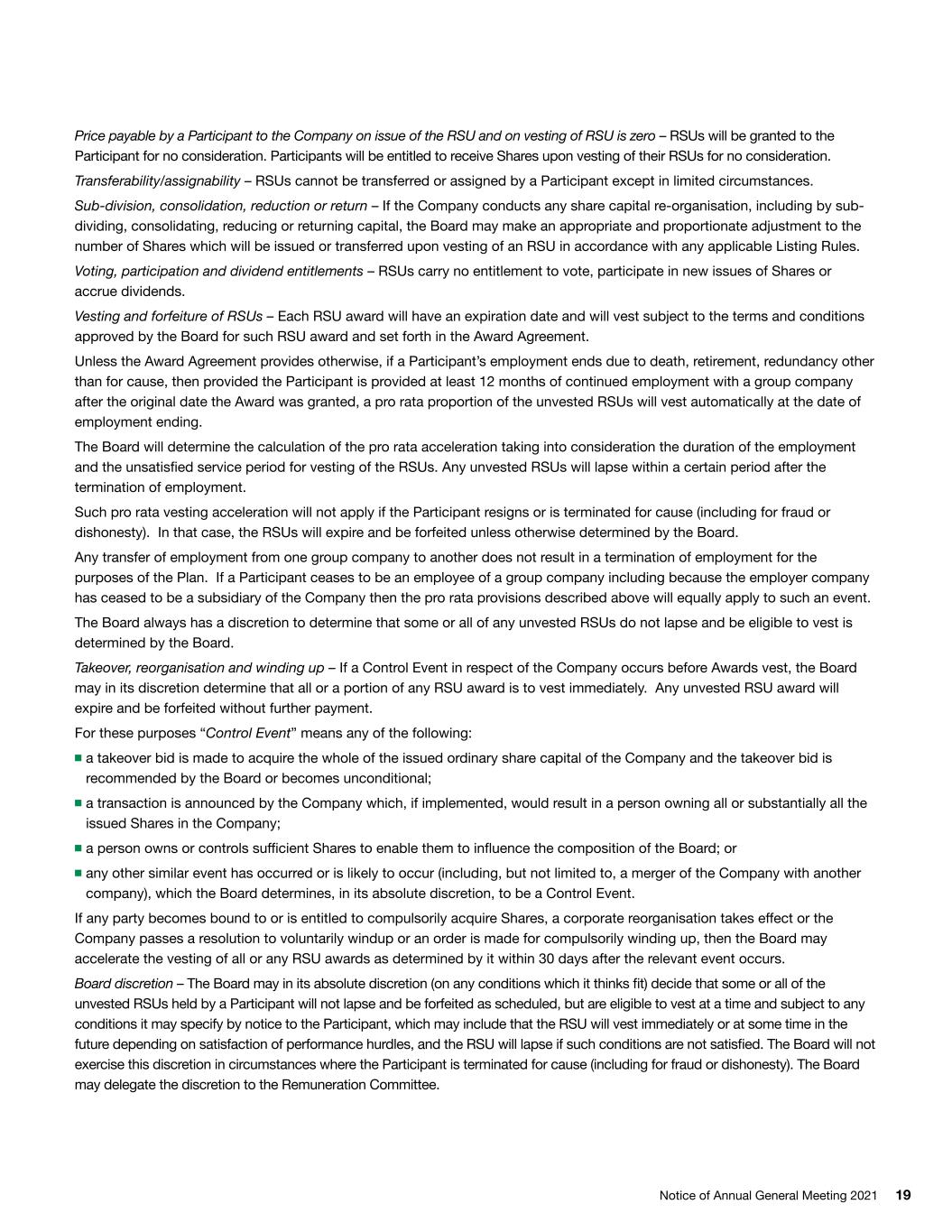 Notice of Annual General Meeting 2021 19 Price payable by a Participant to the Company on issue of the RSU and on vesting of RSU is zero – RSUs will be granted to the Participant for no consideration. Participants will be entitled to receive Shares upon vesting of their RSUs for no consideration. Transferability/assignability – RSUs cannot be transferred or assigned by a Participant except in limited circumstances. Sub-division, consolidation, reduction or return – If the Company conducts any share capital re-organisation, including by sub- dividing, consolidating, reducing or returning capital, the Board may make an appropriate and proportionate adjustment to the number of Shares which will be issued or transferred upon vesting of an RSU in accordance with any applicable Listing Rules. Voting, participation and dividend entitlements – RSUs carry no entitlement to vote, participate in new issues of Shares or accrue dividends. Vesting and forfeiture of RSUs – Each RSU award will have an expiration date and will vest subject to the terms and conditions approved by the Board for such RSU award and set forth in the Award Agreement. Unless the Award Agreement provides otherwise, if a Participant’s employment ends due to death, retirement, redundancy other than for cause, then provided the Participant is provided at least 12 months of continued employment with a group company after the original date the Award was granted, a pro rata proportion of the unvested RSUs will vest automatically at the date of employment ending. The Board will determine the calculation of the pro rata acceleration taking into consideration the duration of the employment and the unsatisfied service period for vesting of the RSUs. Any unvested RSUs will lapse within a certain period after the termination of employment. Such pro rata vesting acceleration will not apply if the Participant resigns or is terminated for cause (including for fraud or dishonesty). In that case, the RSUs will expire and be forfeited unless otherwise determined by the Board. Any transfer of employment from one group company to another does not result in a termination of employment for the purposes of the Plan. If a Participant ceases to be an employee of a group company including because the employer company has ceased to be a subsidiary of the Company then the pro rata provisions described above will equally apply to such an event. The Board always has a discretion to determine that some or all of any unvested RSUs do not lapse and be eligible to vest is determined by the Board. Takeover, reorganisation and winding up – If a Control Event in respect of the Company occurs before Awards vest, the Board may in its discretion determine that all or a portion of any RSU award is to vest immediately. Any unvested RSU award will expire and be forfeited without further payment. For these purposes “Control Event” means any of the following: ■ a takeover bid is made to acquire the whole of the issued ordinary share capital of the Company and the takeover bid is recommended by the Board or becomes unconditional; ■ a transaction is announced by the Company which, if implemented, would result in a person owning all or substantially all the issued Shares in the Company; ■ a person owns or controls sufficient Shares to enable them to influence the composition of the Board; or ■ any other similar event has occurred or is likely to occur (including, but not limited to, a merger of the Company with another company), which the Board determines, in its absolute discretion, to be a Control Event. If any party becomes bound to or is entitled to compulsorily acquire Shares, a corporate reorganisation takes effect or the Company passes a resolution to voluntarily windup or an order is made for compulsorily winding up, then the Board may accelerate the vesting of all or any RSU awards as determined by it within 30 days after the relevant event occurs. Board discretion – The Board may in its absolute discretion (on any conditions which it thinks fit) decide that some or all of the unvested RSUs held by a Participant will not lapse and be forfeited as scheduled, but are eligible to vest at a time and subject to any conditions it may specify by notice to the Participant, which may include that the RSU will vest immediately or at some time in the future depending on satisfaction of performance hurdles, and the RSU will lapse if such conditions are not satisfied. The Board will not exercise this discretion in circumstances where the Participant is terminated for cause (including for fraud or dishonesty). The Board may delegate the discretion to the Remuneration Committee.